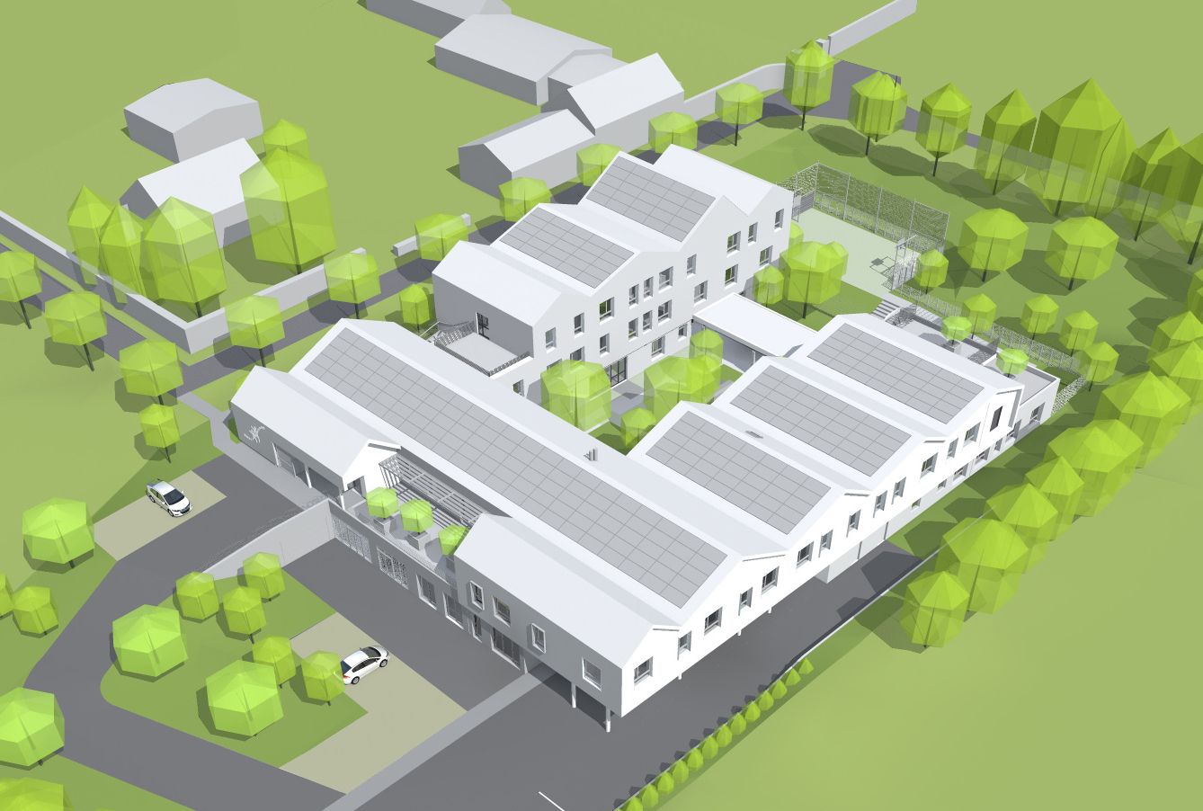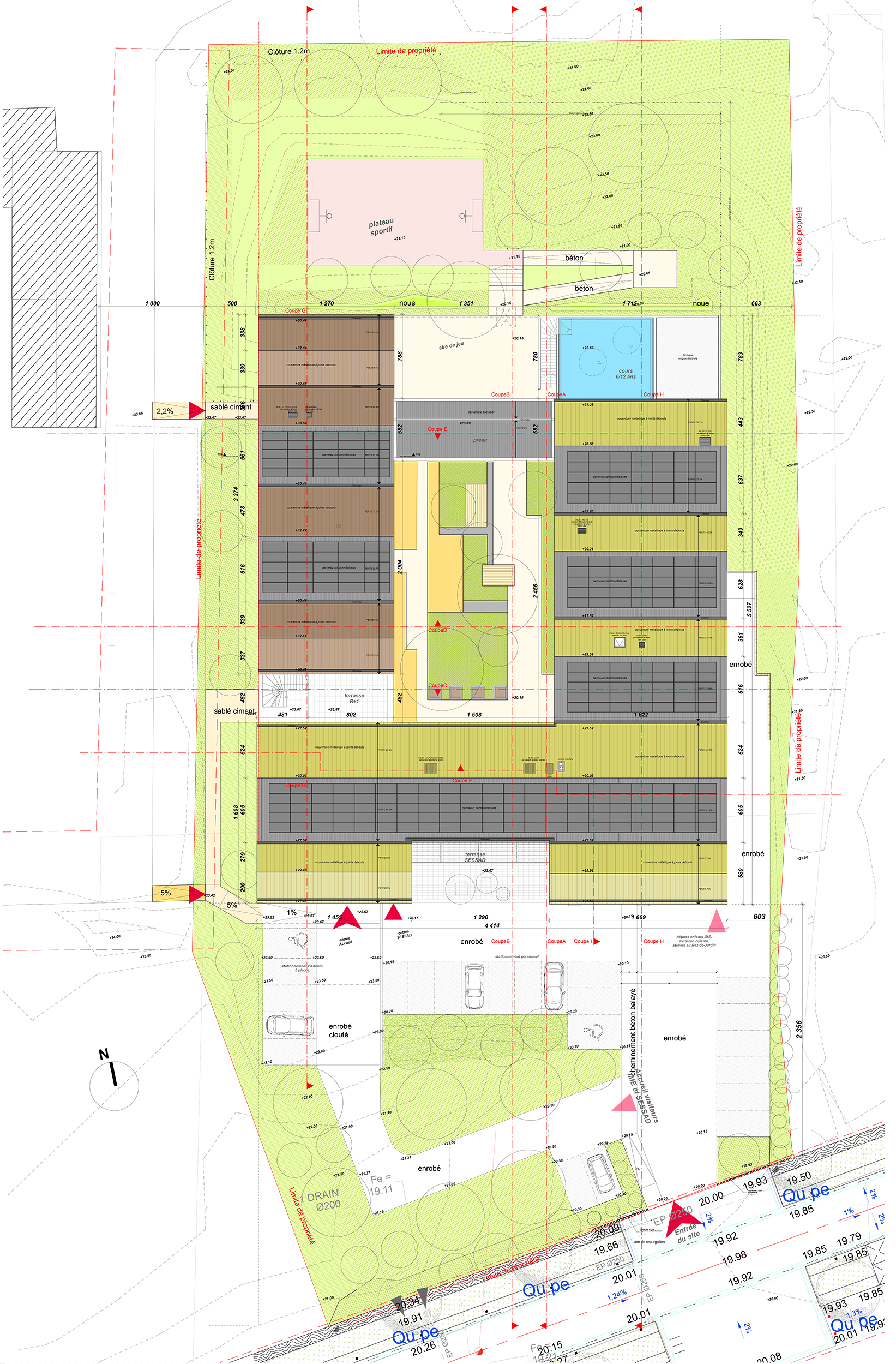 Dans la vallée de l'Erdre, l'Institut médico-éducatif (IME) s'implante au coeur de la ZAC de la Fleuriaye II (Carbone Zéro) à Carquefou. Il accueille 40 enfants et adolescents, et comprend un SESSAD, des pôles administratif, thérapeutique, pédagogique et des ateliers. Organisé autour d'un patio central,le bâtiment s'intègre dans le dénivelé naturel du terrain avec au sud un rez de chaussé bas, et au nord des jeux de volumes, de matières et de toitures à l'échelle du quartier. Le projet assume ainsi deux univers différents, au nord l’intégration et au sud l’affirmation d’un bâtiment remarquable, repérable. Fonctionnel et flexible, l'IME est un outil au service des enfants, adaptés à leurs activités et à leurs besoins (repérage, déplacement, ergonomie, acoustique, pérennité des matériaux).