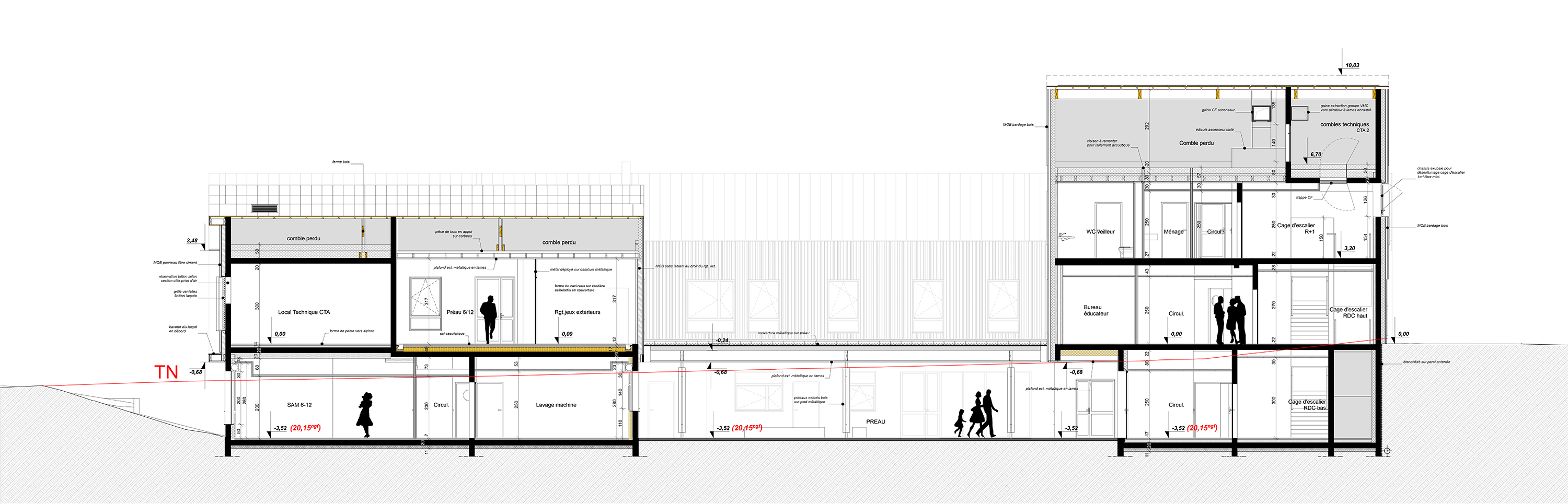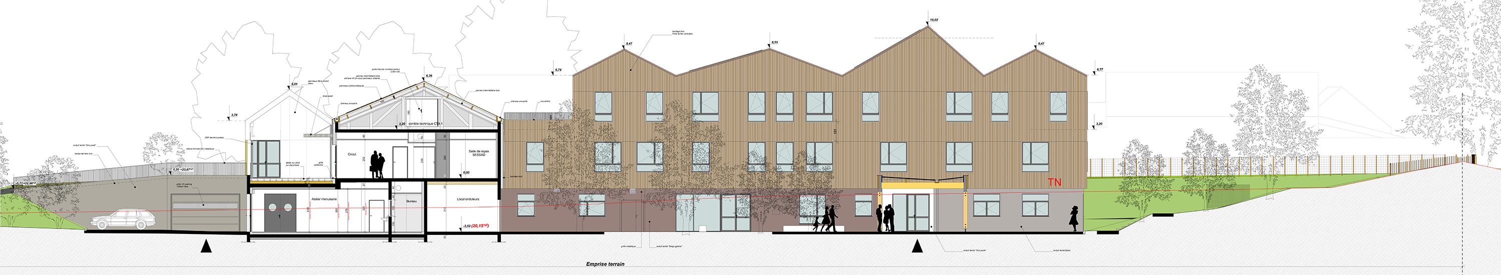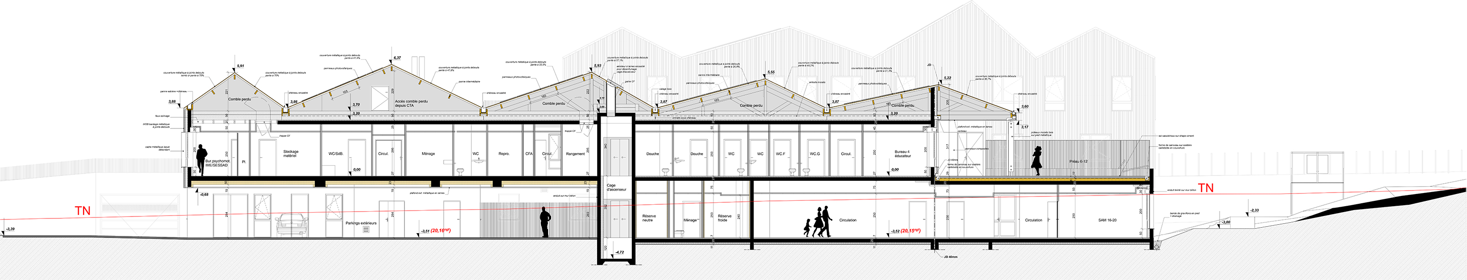 Descriptif technique : Ossature : Murs à ossature bois de type murs manteaux devant une structure poteaux/poutre béton. Ces murs sont composés de montants en épicéa en 45x145 traité Cl2, d’un OSB 3 12mm, d’une laine de verre ISOMOB 145mm, d’un pare pluie DELTA VENT S et d’un pare vapeur DELTA FOL. Charpente : De type traditionnelle composée de fermes en bois lamellé collé et massif, la structure est composée de fermes latines reposant sur les murs ossatures bois, de pannes, de contreventements et de chevrons. Bardage : Lames en peuplier aboutés et thermochauffés ajourées de 10mm et d’un bardage en panneau Minéral (TECTIVA de chez ETERNIT). Habillage des entourages de menuiserie en alu laqué. PEFC (Gestion forestière durable) Marquage CE