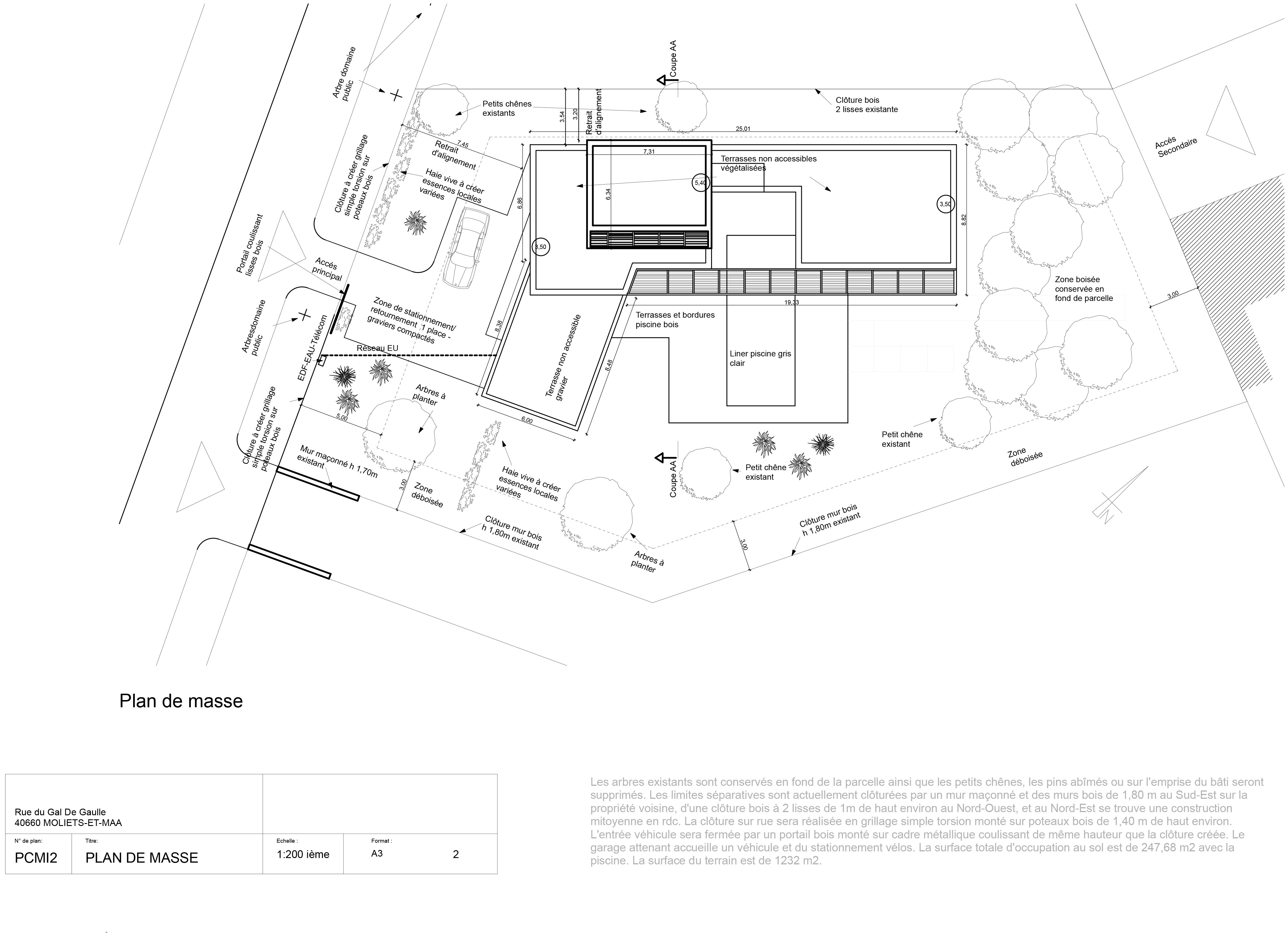 La maison est de facture contemporaine et exploite les capacités du bois pour sa légèreté et ses possibilités de mise en œuvre. Organisée autour de la piscine, qui s'inscrit entre la partie jour et la partie nuit, l'habitation s'ouvre largement au sud sur le jardin protégé de la rue par l'aile du garage en façade rue. La maison est articulée sur les deux axes du terrain, l'alignement sur rue et l'autre angle donné par l'orientation à 110° de la parcelle, donnant un angle ouvert. Elle est principalement de plain pied surmontée d'un édicule, petite mezzanine avec la vue sur la forêt.