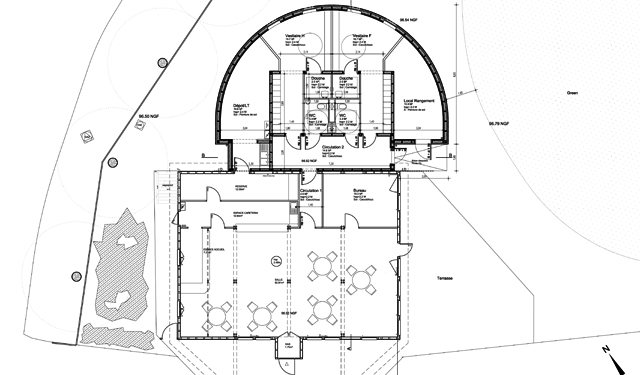 Approche environnementale : Le projet d'aménagement est modeste mais entend limiter au maximum les consommations énergétiques à la charge du club. Ainsi nous avons proposé des principes simples et efficaces, limitant les coûts de maintenance : compacité, bonne isolation thermique, pompe à chaleur, ventilation naturelle, lumière naturelle...