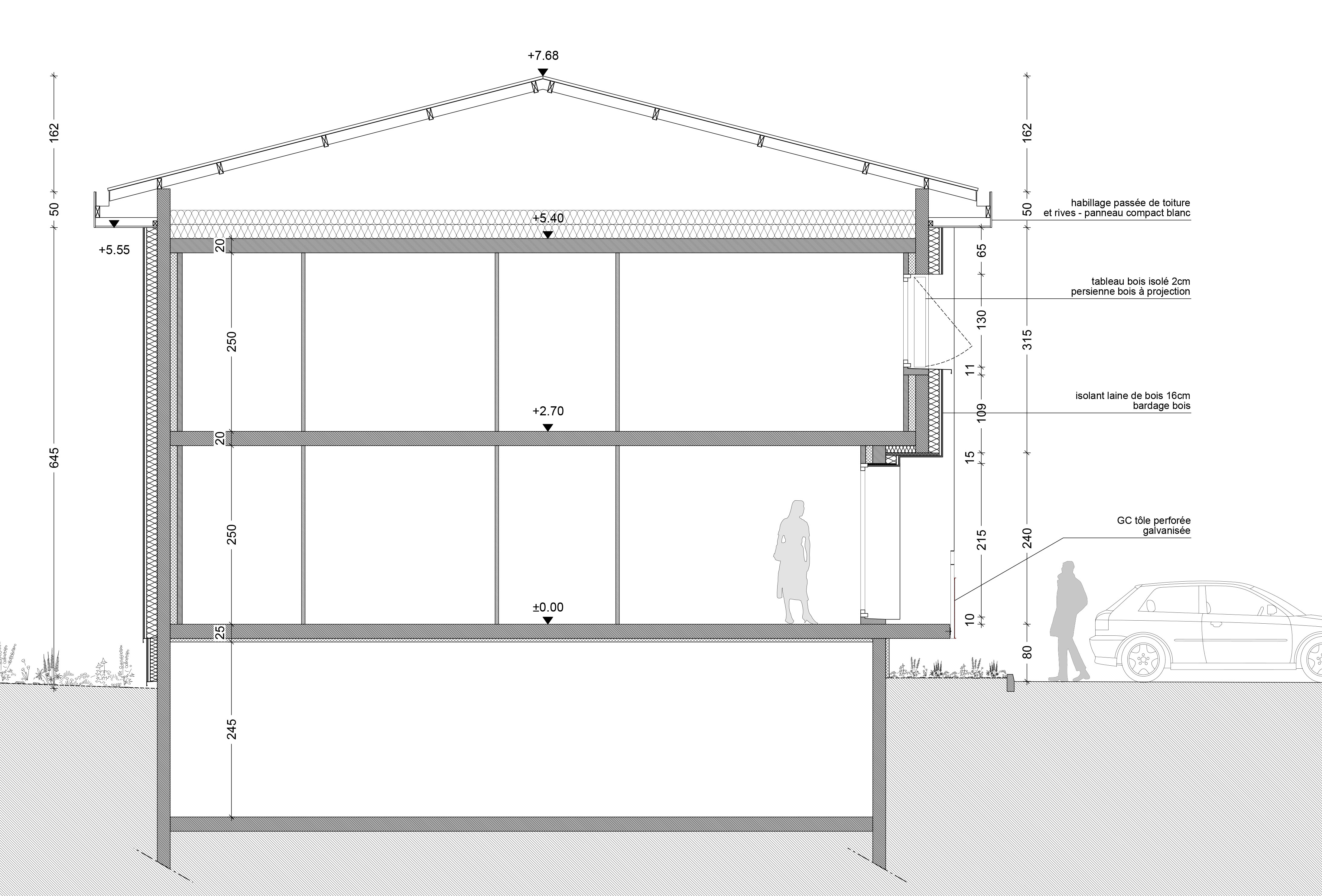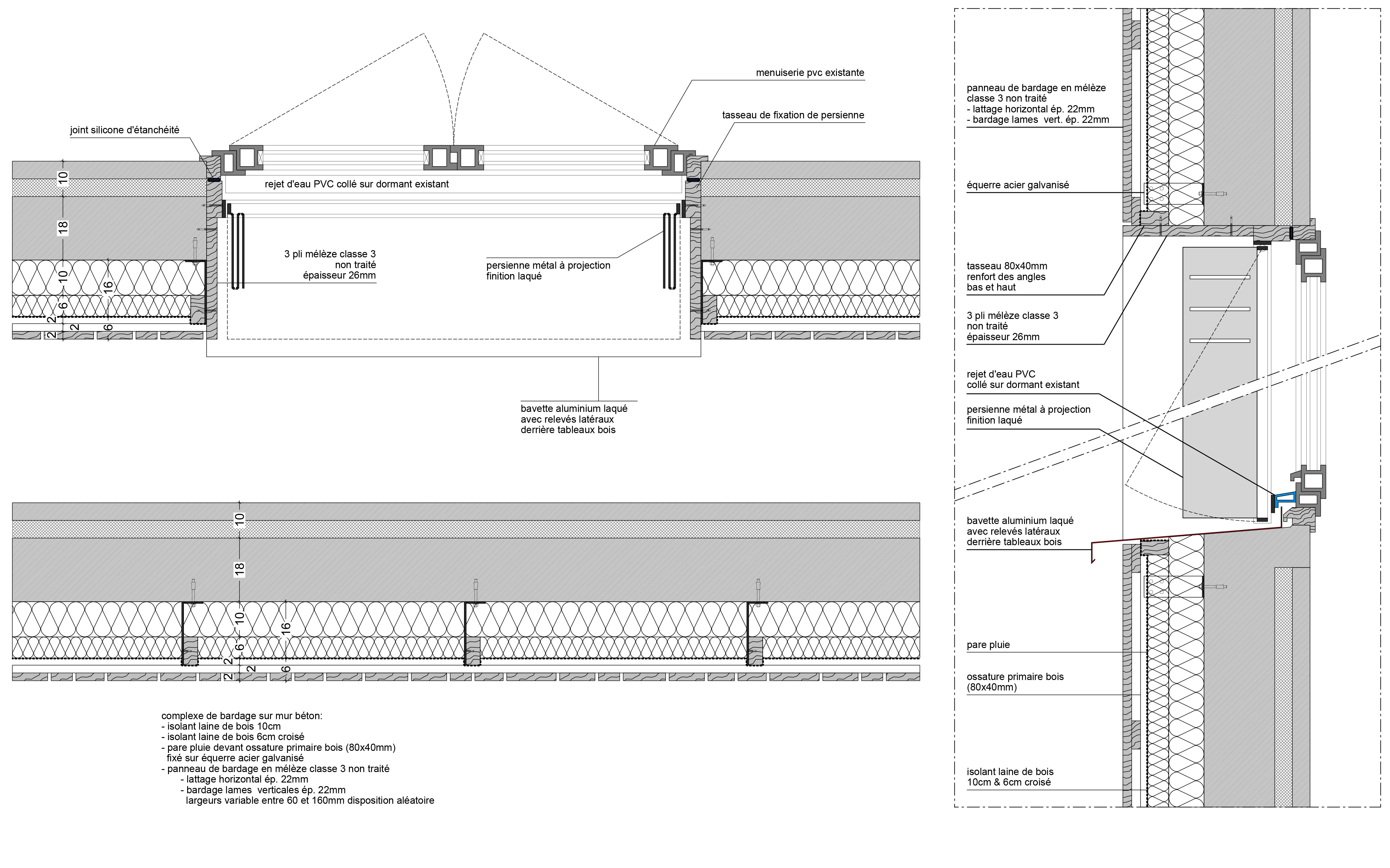 Descriptif technique : Il s’agit donc d’un projet d’isolation thermique extérieure Le bardage est posé sur une ossature bois verticale relié à la façade existante par des équerres en acier galvanisé. L'expression architecturale est servie par la mise en œuvre technique: Les Lames verticales sont recoupées horizontalement par un pliage en aluminium brut qui protège la tête des lames et dynamise l'expression de l'ensemble. En partie basse sur 80 cm de hauteur des panneaux compacts gris sont disposés pour protéger le bardage des chocs et de l'eau. Les différentes portes en façades et garde-corps sont remplacés.