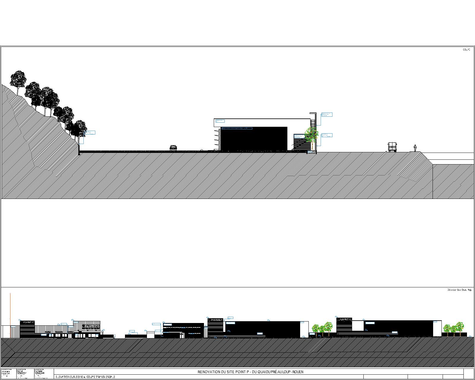 Situé à Rouen au bord de la Seine, le projet consistait à rénover et développer un site de vente et de stockage en réhabilitant deux bâtiments existants et en édifiant deux nouveaux entrepôts de 2000m². L’ensemble développe une volumétrie horizontale qui étire son rapport à la Seine comme un long vaisseau fluvial. Un étirement accentué par de grands pans de bois au motif géométrique répété. Pour contraster avec le bois et afin de capter les lumières changeantes des influences du ciel et de la Seine, une vêture métal alterne entre gris métallisé et blanc.