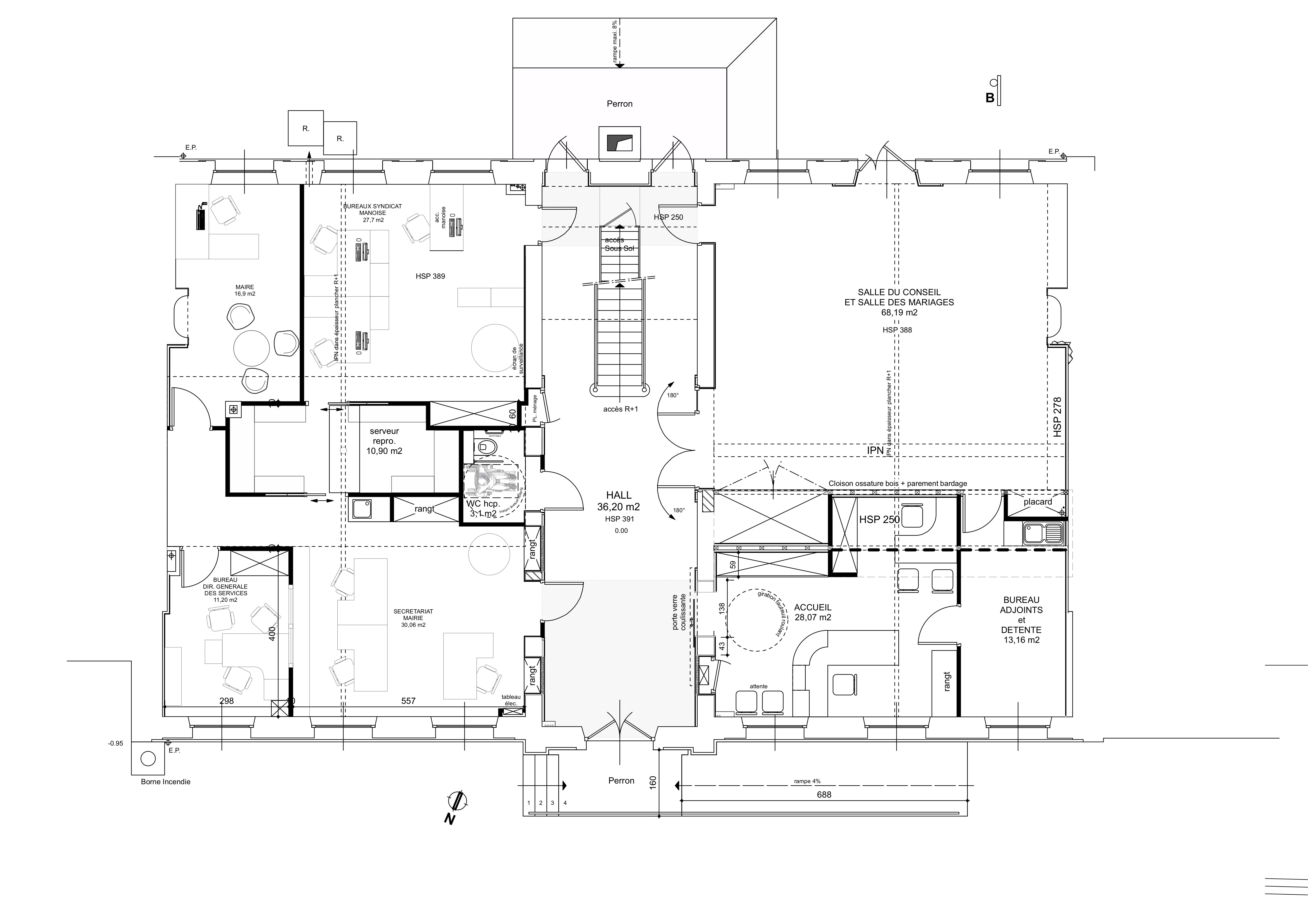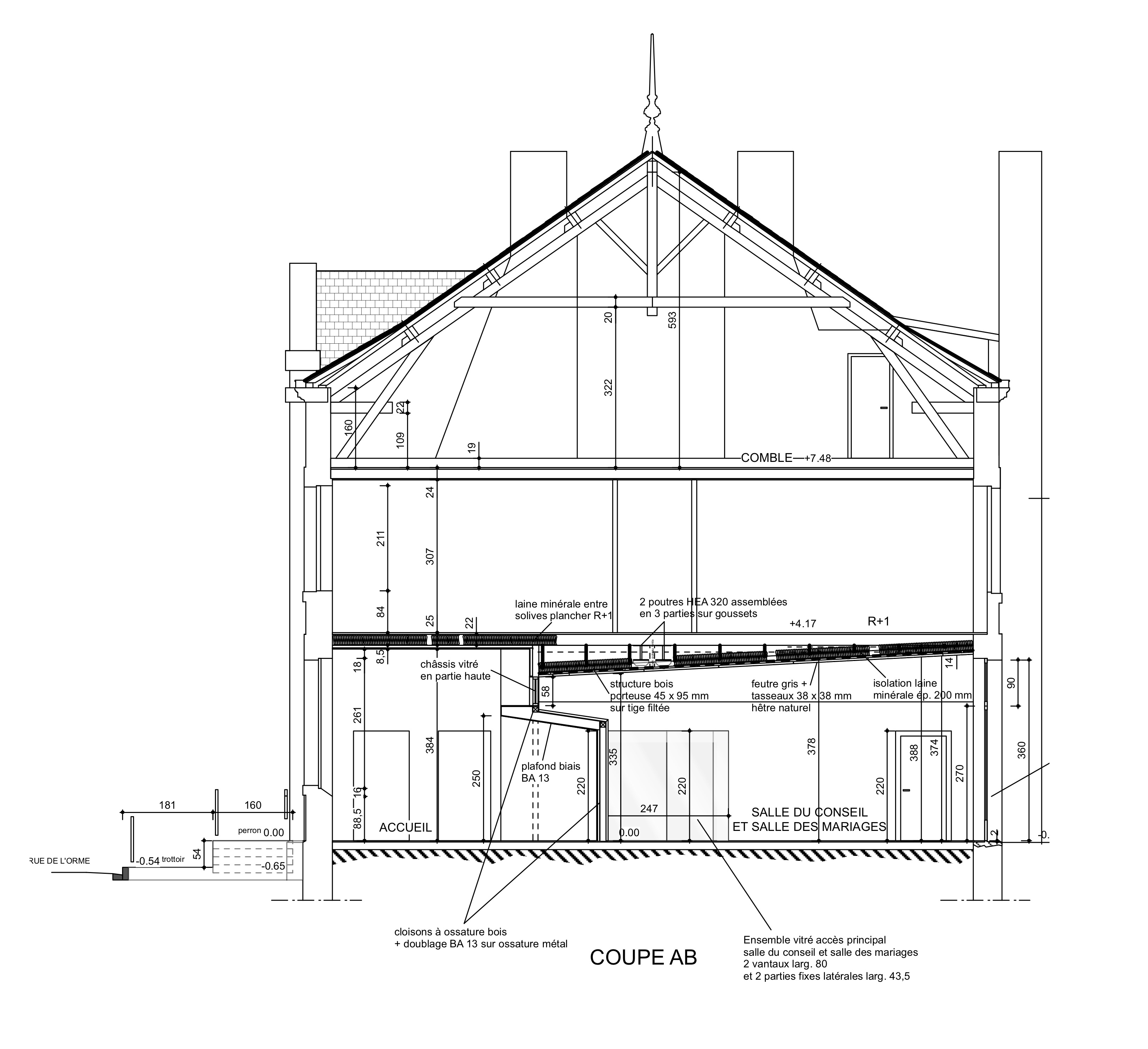 Comme de nombreux bâtiments de mairie, ce bâtiment abritait également l'école ; 4 salles de classes en RDC et la mairie en R+1. L'objectif de ce projet de mise en accessibilité était donc de descendre l'ensemble de la mairie en RDC. Véritable chalenge économique, ce chantier en site occupé s'est déroulé en 3 phases. Une restructuration lourde des différents espaces a offert à la commune de Liffol-le-Grand une grande salle de conseil. Un travail en coupe a permis de garder la lumière, la transparence et surtout d'atteindre un des principaux objectifs : une très bonne acoustique.