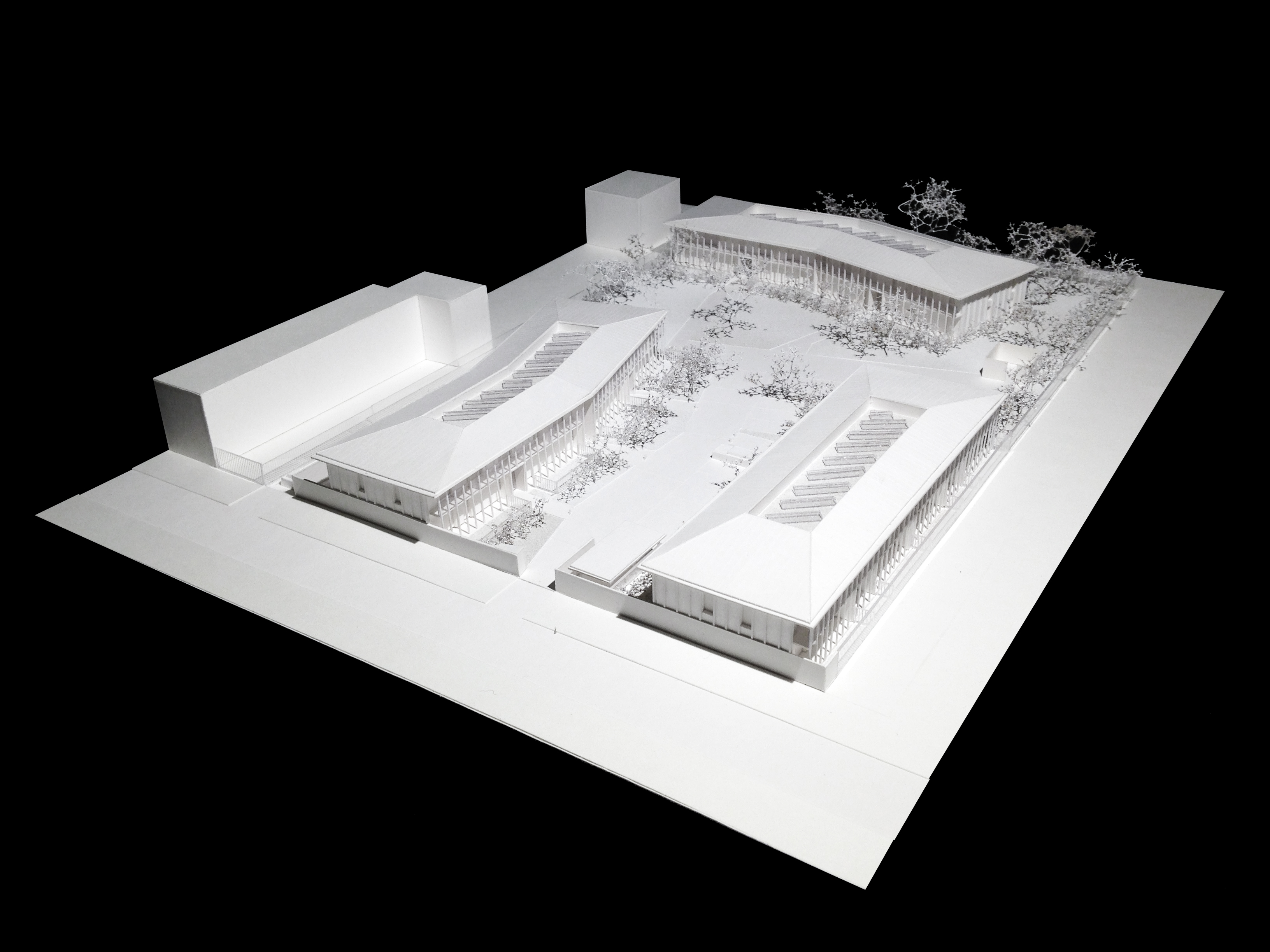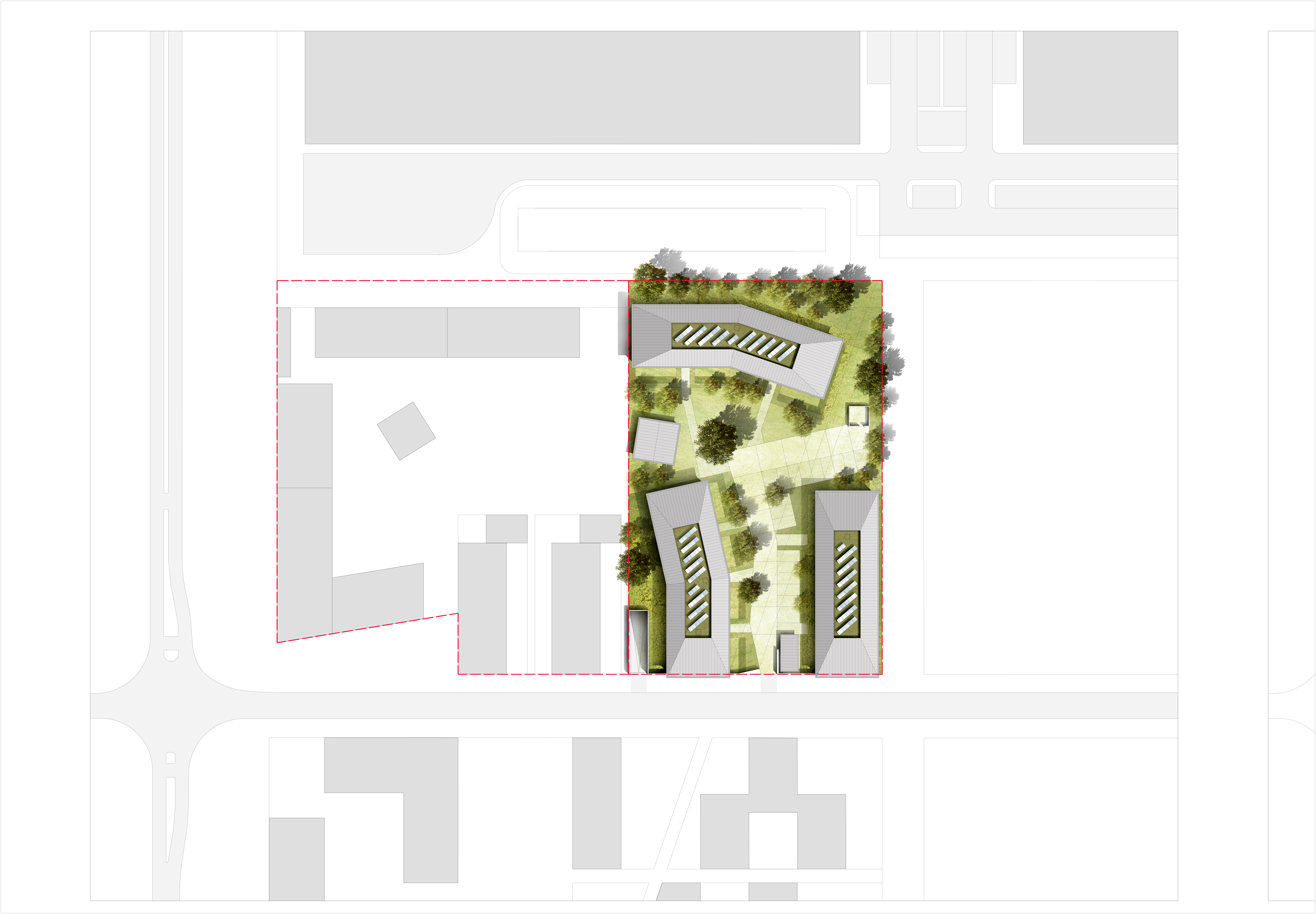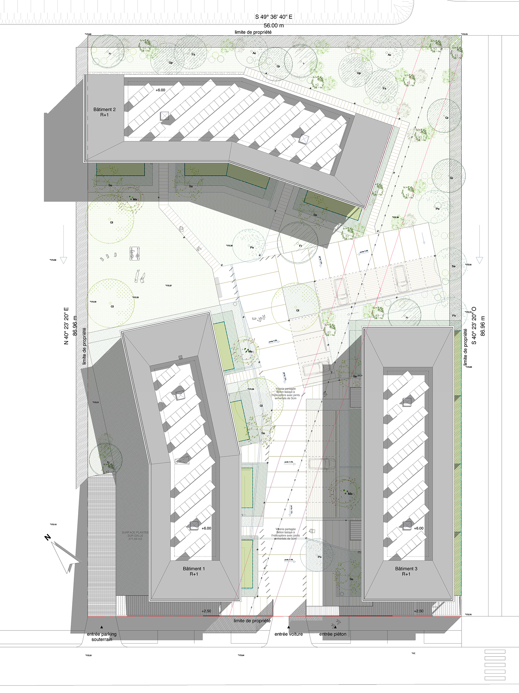 A l’origine du projet, les directives environnementales, urbaines, architecturales et paysagères de l’aménageur affichaient de manière claire les ambitions de la démarche B3 : BIM, BOIS/BIOSOURCE, et BEPOS. Tout en répondant positivement à cet enjeu, le projet voulait répondre un autre préalable : retrouver la tonalité rurale de l’ancien bourg était donc à retrouver dans un quartier une architecture contemporaine récente. Pour cela, la forme urbaine du projet avec son vide central arboré fait référence aux béguinages, véritables villages dans la ville. Nous sommes donc partis de cette image pour penser le vide central du projet qui nous a poussés à conserver trois bâtiments pour le contenir tout en l’ouvrant avec retenue. L’idée est de constituer une véritable intériorité ouverte et légère dans les relations d’entretiennent les bâtiments qui m’entourent. A l’échelle de l’îlot, il s’agit d’un cœur vert qui malgré la présence de la voiture, reste le lieu privilégié d’aventures, de découverte et de déambulation piétonne. Le projet se compose donc de trois de bâtiments de hauteur R+1 et que nous avons rendus plus épais dans notre recherche de compacité tout en proposant des logements traversants avec une épaisseur de 11.2 m (sans les terrasse filantes). Deux des trois bâtiments sont pliés de 10° environ de manière à casser la linéarité des longs corps bâtis et également pour mettre en place une élégante séquence d’approche faisant découvrir le cœur d’îlot dès l’entrée sur la parcelle. Se plis de façades guident le visiteur ou badaud en même temps qu’ils offrent des perceptions très différentes et décomposées des corps bâtis. Les trois bâtiments de hauteur R+1 sont constitués chacun de deux blocs regroupant 5 logements autour d’une cage. L’idée étant d’amoindrir l’échelle collective et urbaine pour retrouver une échelle plus domestique. Mais aussi offrir la possibilité aux futurs habitants de retrouver un réel intérêt d’habiter hors des villes constituées et denses. Egalement, en termes d’écriture et d’espace, il nous semblait important d’éviter tout effet de frontalité des corps bâti et de mettre en place une relation légère entre l’intérieur et l’extérieur que constitue ce nouveau paysage central. L’ensemble des panneaux solaires (photovoltaïques) sont disposés de manière invisible depuis le sol dans des toitures terrasses encastrés au centre des bâtiments et orientés de manière optimale au sud. Il nous paraissait inadéquat que l’ambition donnée au projet nous fasse produire un objet connoté techniquement. Nous préférerons donc qu’ils dessinent le ciel par sa silhouette. 30 places de stationnement sont implantées en surface autour d’un cheminement semi piéton menant jusque vers le fond de la parcelle : Ici, la voiture n’a pas de place particulière mais sa place est un peu partout et la relation avec l’automobile est dédramatisée. Ici, malgré cela, la voiture trouve sa place mais celle-ci est diffuse dans un ensemble, dans un paysage global et unique, dans un seul cœur d’ilot se déhanchant librement. A propos des logements, nous avons souhaité des bâtiments le plus épais possible mais de manière à ce qu’ils soient traversants et exposés au Sud (ou sud-Est). Notre priorité était de travailler avec le premier matériau gratuit et illimité : la lumière ! Nous avons donc apporté de manière contrôlée et dosée dans tous les espaces intérieurs, y compris dans les parties communes.