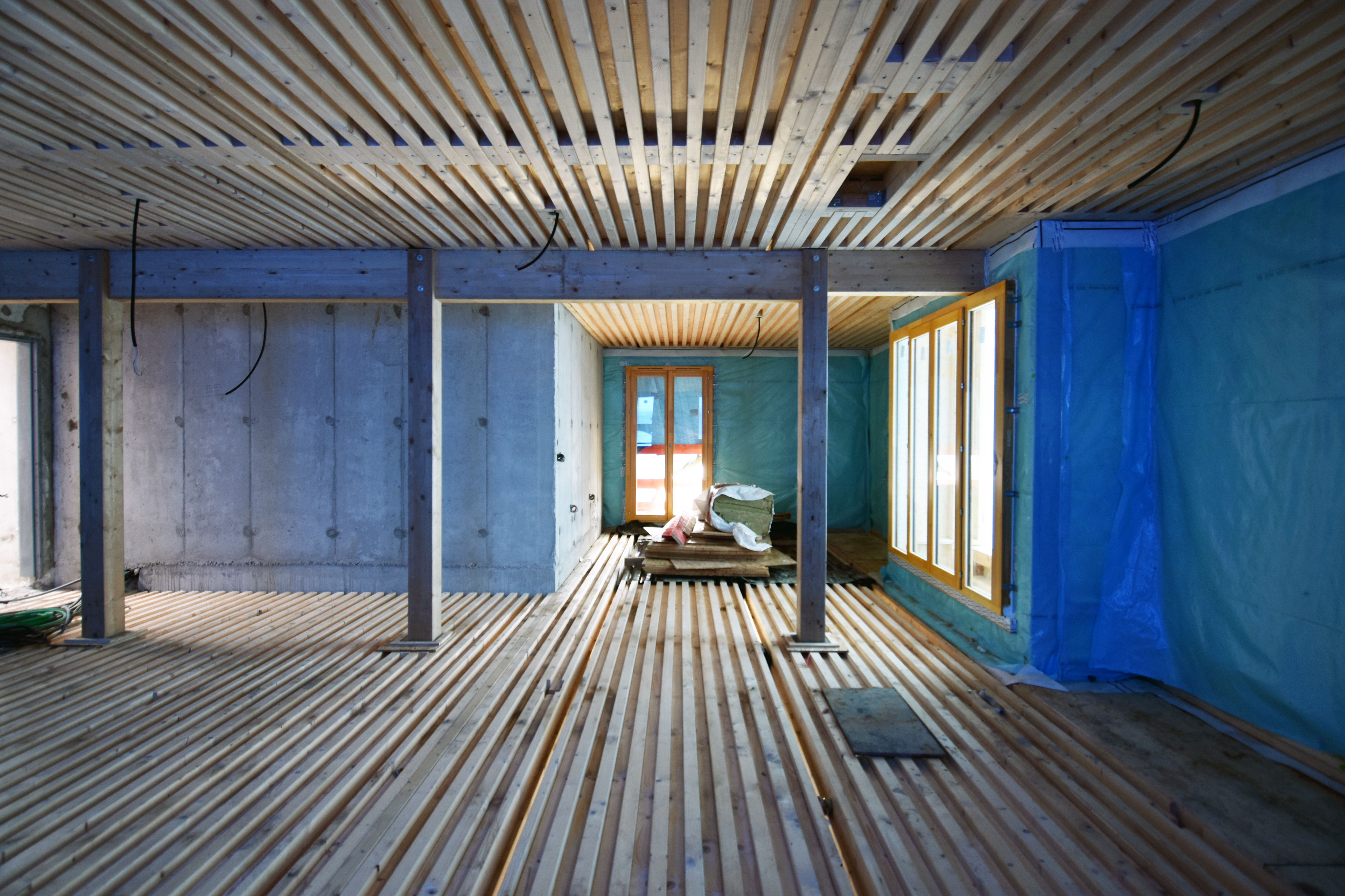 Descriptif technique : La structure des logements est constituée de panneaux « mur » en bois, préfabriqués, complexe sandwich isolant et porteur, épaisseur totale de la paroi de 32 cm, composé de : - d’une d’ossature principale - de panneaux de structure fixés en faces intérieure ou en face extérieure sur l’ossature - d’une isolation intérieure contre-cloison plâtre - système enduit (STO). Les modes constructifs retenus permettent une limitation des quantités de bois mises en œuvre et ainsi de réduire l’énergie grise. Ceci favorise la main d’œuvre et des emplois non délocalisables plutôt que l’industrialisation d’un procédé complexe, éventuellement à l’étranger. La solution technique retenue pour le mur en ossature bois extérieur (MOB extérieur) est la suivante : Ossature bois section 45x145 mm en KVH raboté 4 faces, panneau de contreventement extérieur, isolant laine minérale ép.145 mm entre montants, pare-vapeur et isolant rapporté type laine minérale de 50 mm entre pare-vapeur et doublage BA13, ainsi qu'un isolant de 100mm recevant l'enduit de finition extérieur. Pour les planchers entre appartements, la solution proposée est un plancher porté des planchers bois de type dalle O’portune, système développé par l’entreprise générale LIFTEAM et breveté par son directeur Jean-Luc Sandoz.