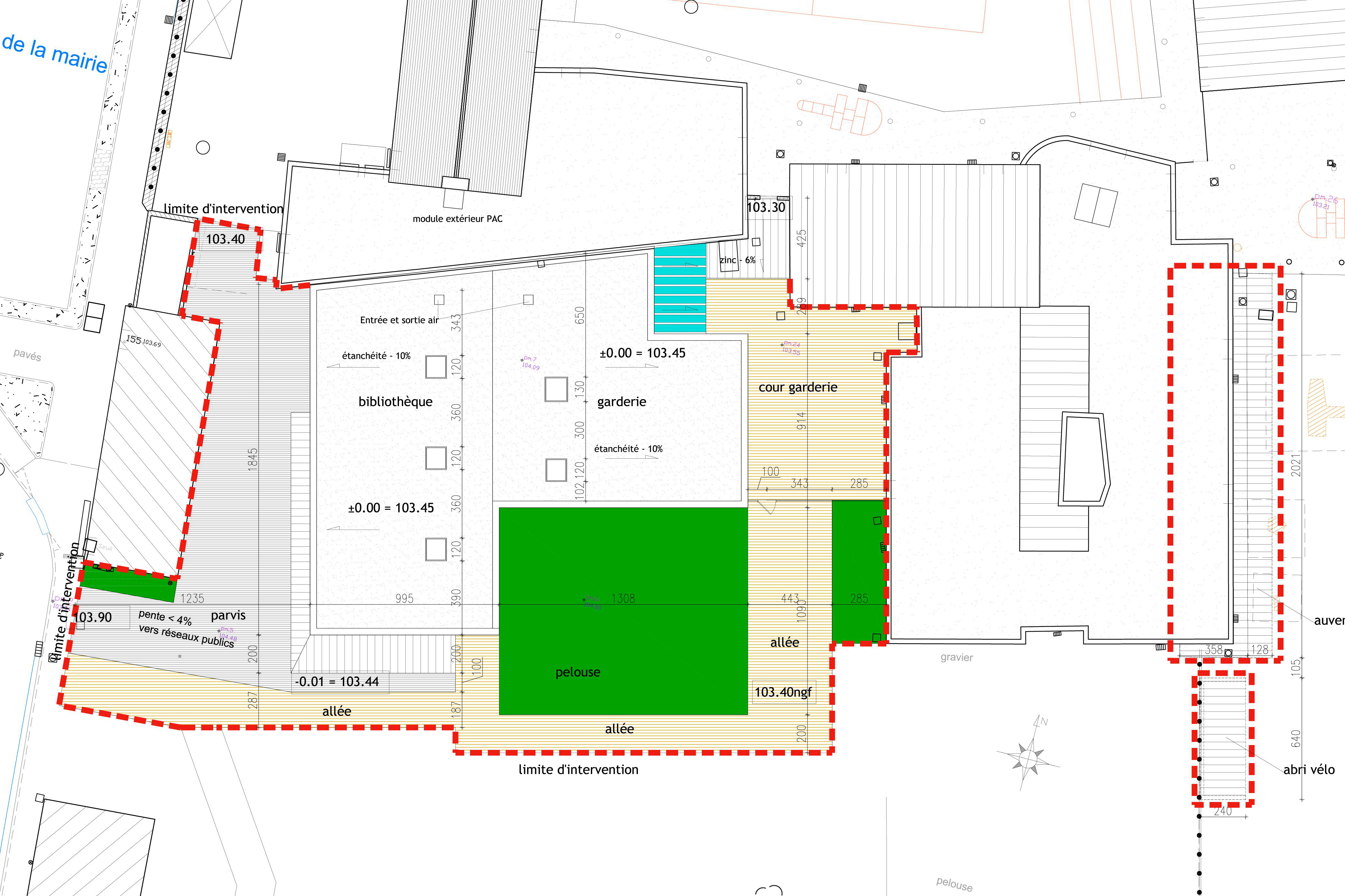 Le projet porte sur la construction d'une bibliothèque et d'une garderie en extension de l'école. Le projet fait le lien entre l'école et le bourg. L'usage de la bibliothèque est commun à l'école et aux habitants. La garderie est donc directement accessible depuis la bibliothèque et sert d'espace "tampon" avec l'école. La notion de sécurité des écoliers est ainsi préservée. Le bâtiment est construit en lieu et place d'une ancienne maison d'habitation les orientations sont Est et Ouest afin de réduire les apports solaires néfastes à l'usage des deux activités et réduisant les inconforts d'été.