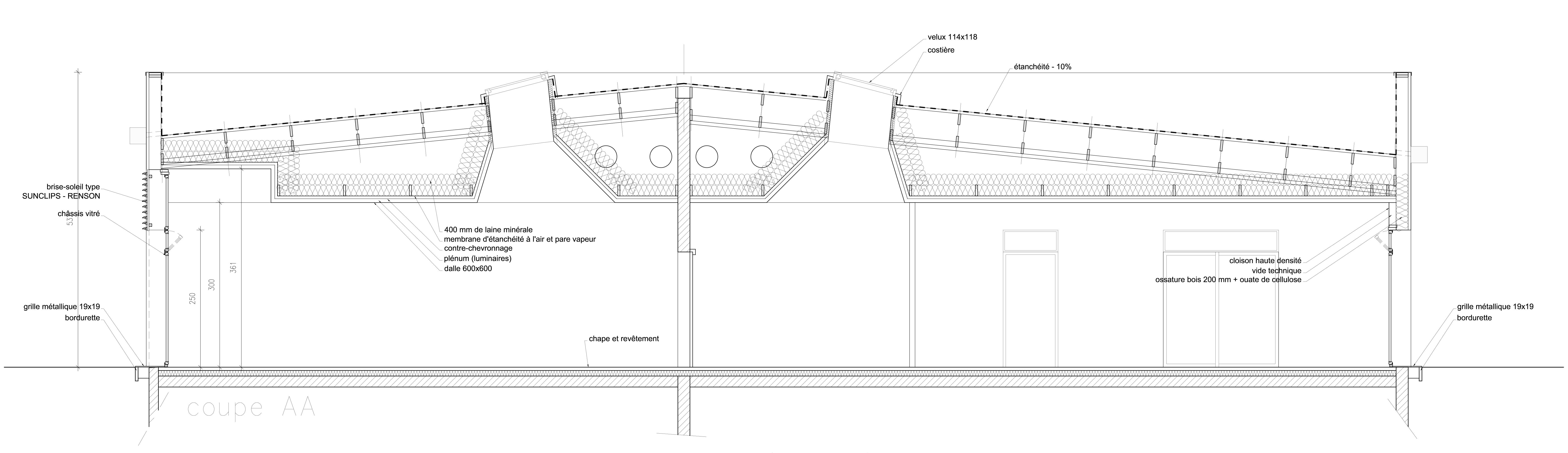 Descriptif technique : L'ossature bois a naturellement été retenue, sauf sur deux pans de murs qui recevront une salle de motricité en extension. La mise en oeuvre des diverses membranes a fait l'objet d'un travail de précision. Des puits de lumière permettent de faire rentrer le soleil en profondeur sans générer d'inconfort. Les matériaux en contact avec les utilisateurs sont sains et respectueux de l'environnement.