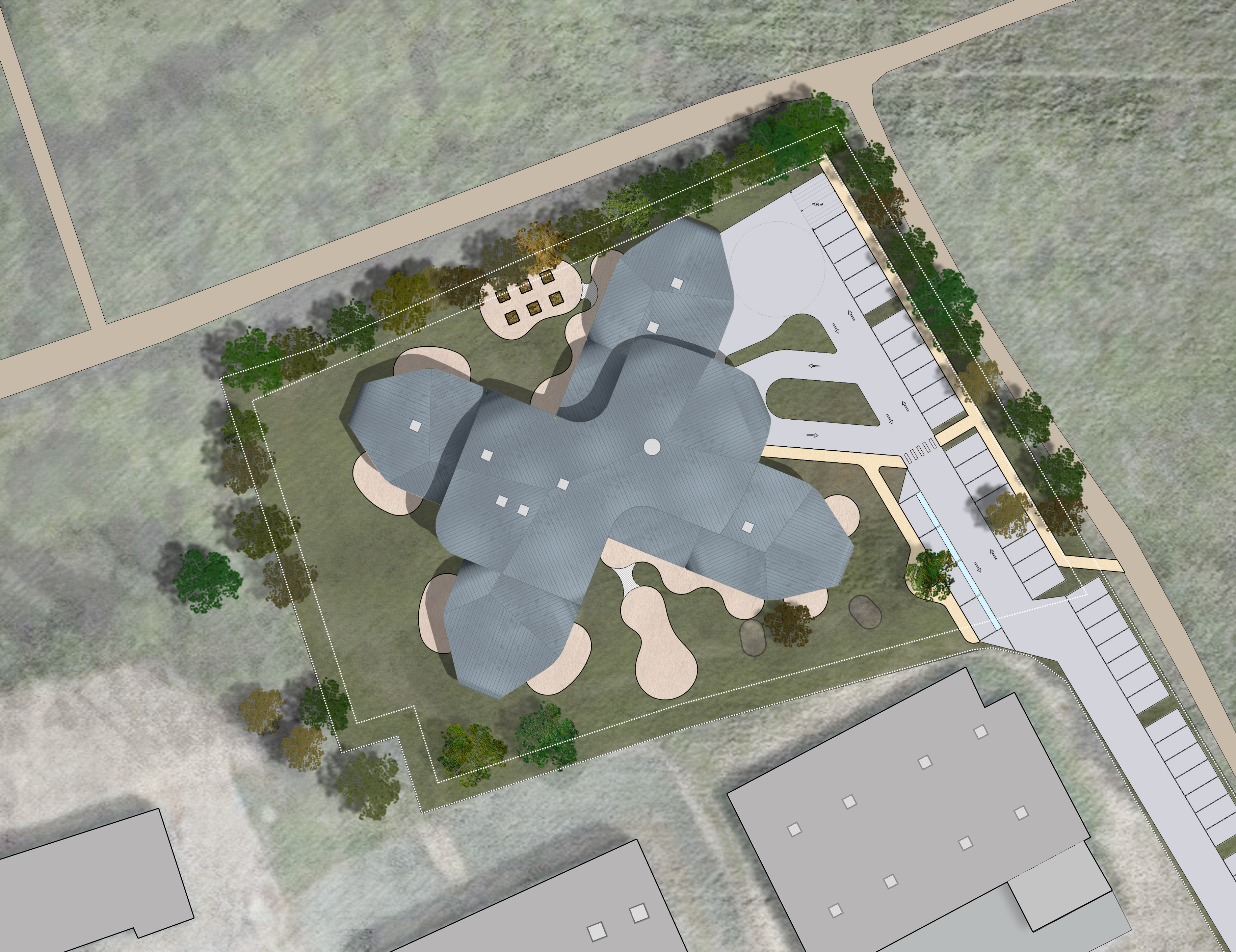 Approche environnementale : La forme du bâtiment en étoile est assez compliquée à valoriser d'un point de vue apports solaires. Les pièces à vivre ont cependant toutes été orientées au sud tandis que l'aile nord accueil les espaces plus techniques. Une important isolation en matériaux biosourcés et un noyau béton, pour l'inertie, permet d'optimiser les apports solaires. Un soin particulier a été apporté à l'implantation du bâtiment sur la parcelle afin de valoriser les points de vue sur l'extérieur et la qualité des espaces verts.