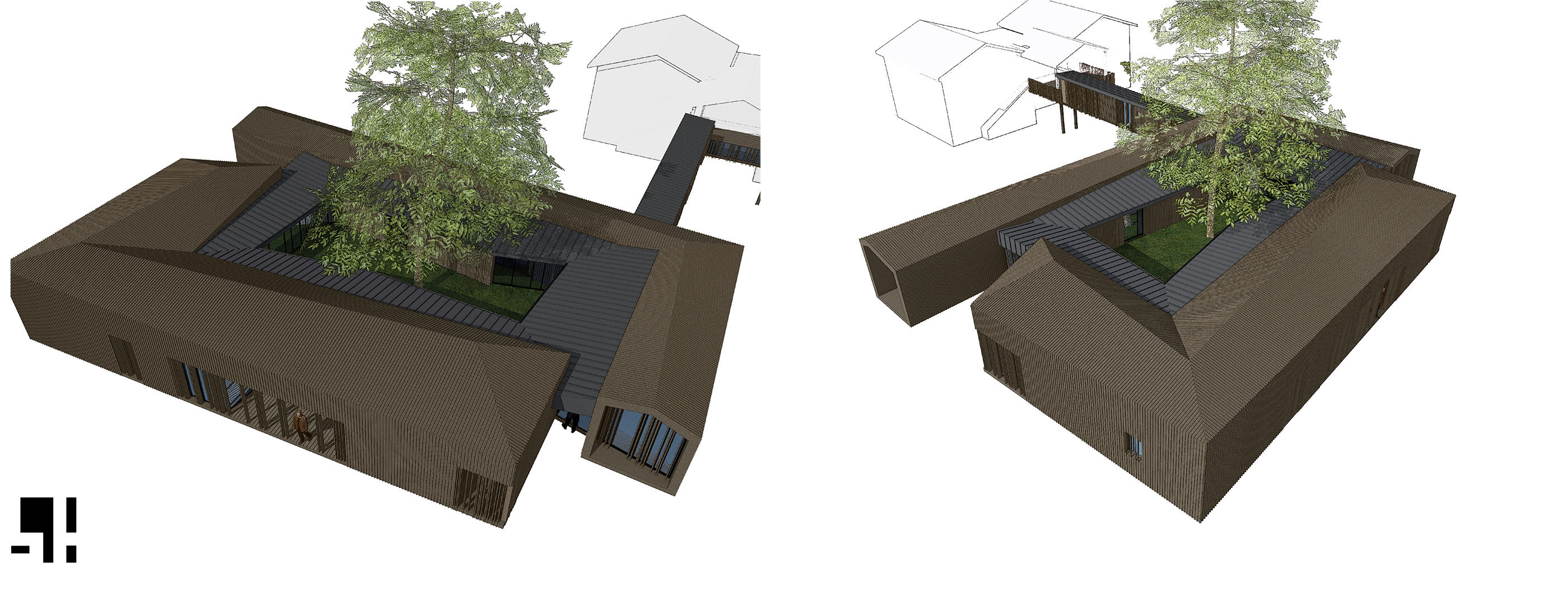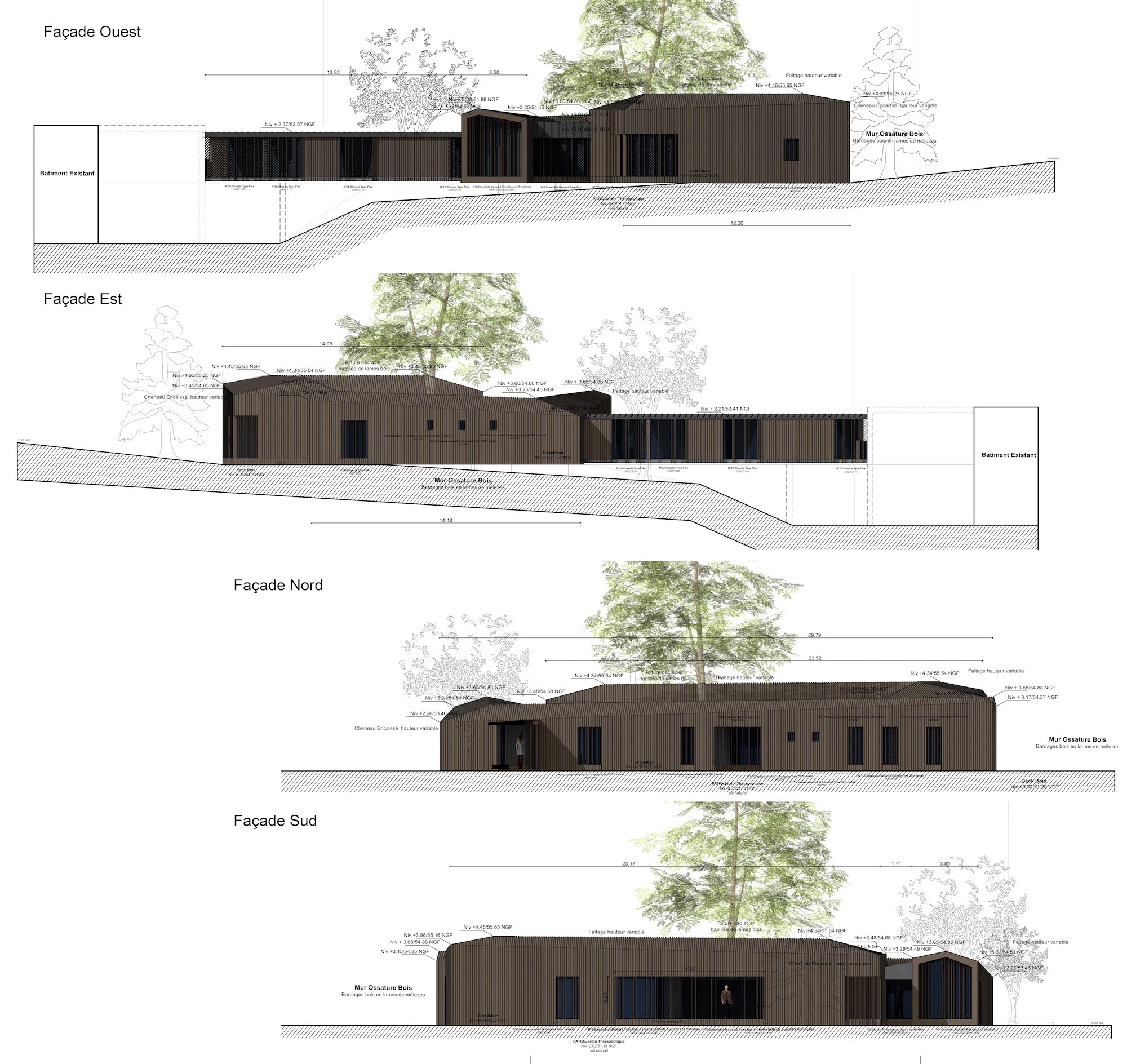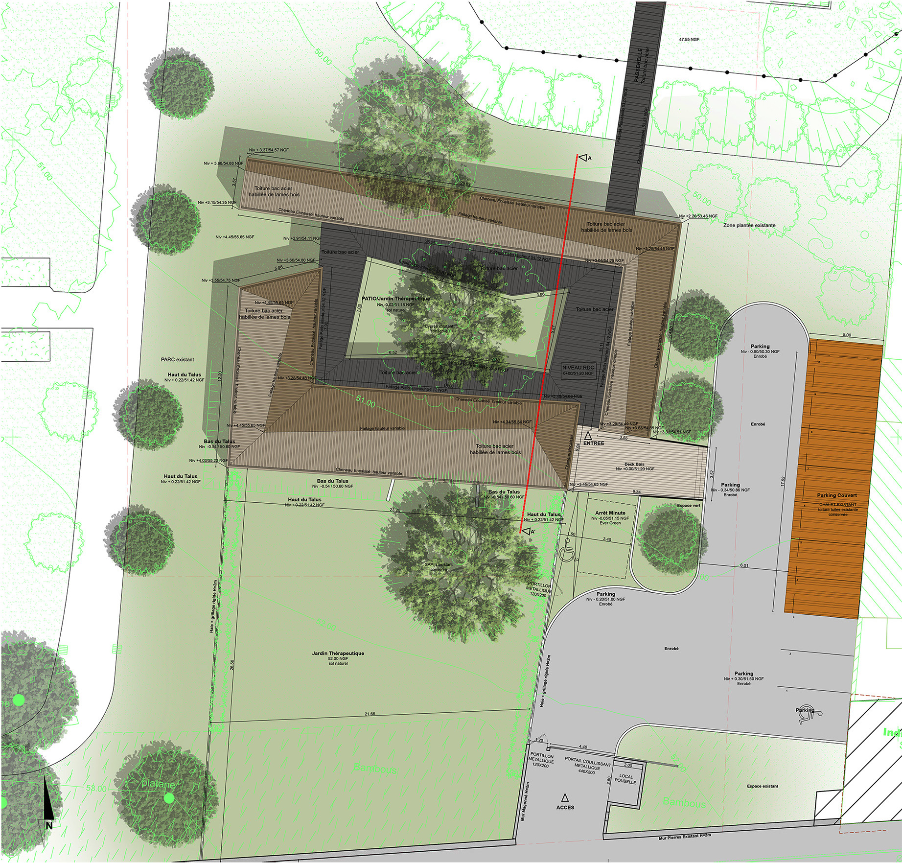 Le projet est un centre d‘accueil de jour pour malades d’Alzheimer, dans la continuité du parc l’EPHAD « Notre Maison ». Le parti pris se veut être une inclusion entre la volonté d’habiter le paysage tout en répondant à la volonté d’intégrer le patient dans ce type de structure. L’évidence était de réaliser un bâtiment en ossature et bardage bois (planchers, murs, toiture) pour permettre une insertion paysagère, un respect de l’existant (contraintes moins lourdes de mise en œuvre) et une meilleure approche sensorielle pour les malades.