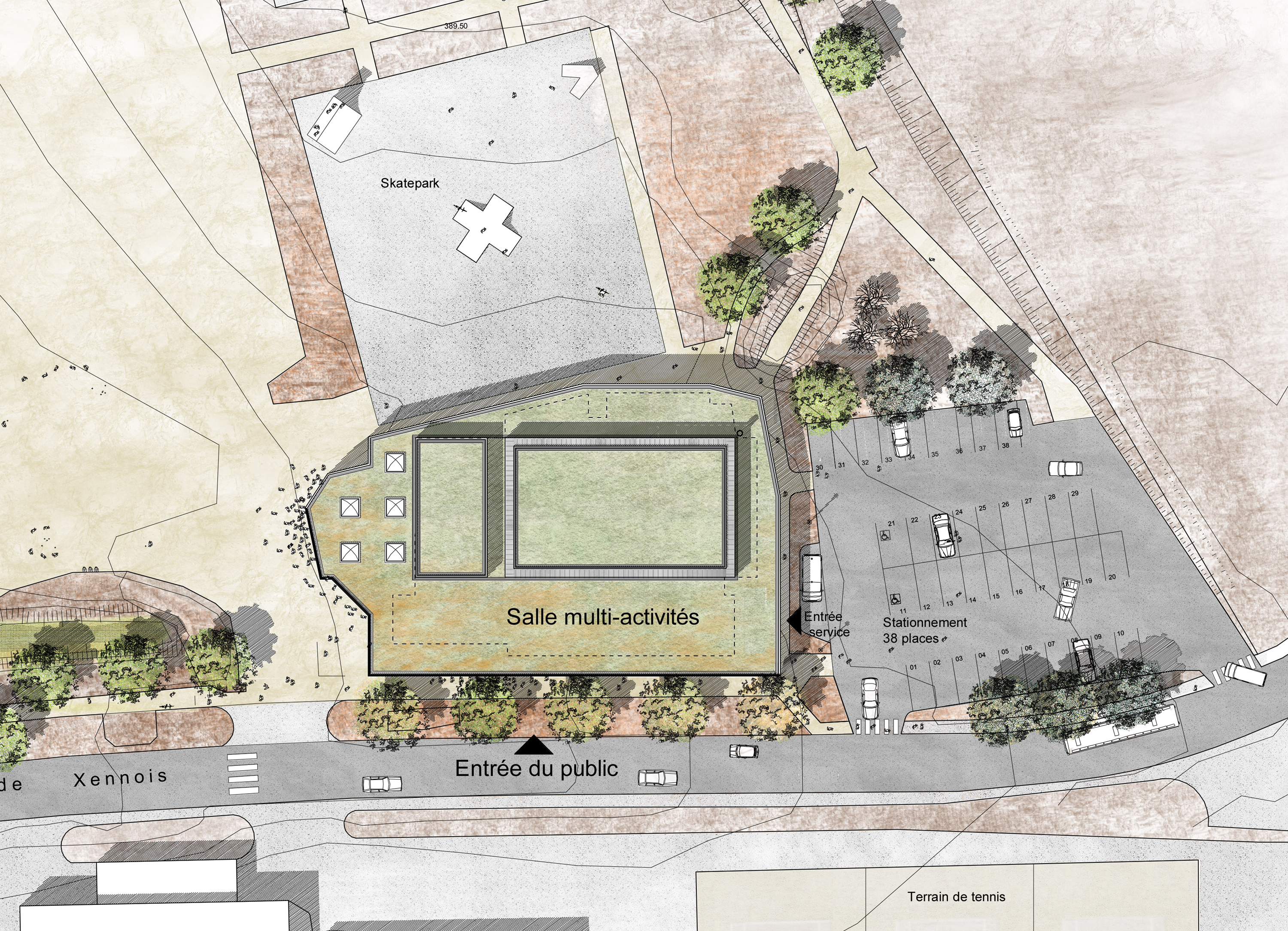 Face aux vallons boisés, de nombreuses activités s'articulent sur le site de la Moutière. Les espaces extérieurs couverts protègent le bâtiment de la salle multi-activités et permettent ainsi de prolonger et de croiser les usages. La position géographique d'entrée de ville valorise le bâtiment comme un signal dans la ville. La charpente de la salle multi-activités, couronnée de vitrage, s'élève au-dessus des toitures. Elle dessine une émergence qui guide et caractérise, au même titre que le clocher et l'horizon vallonné.