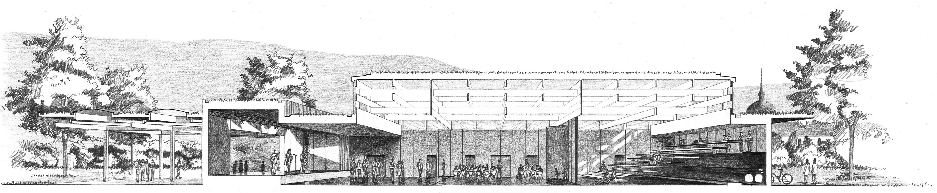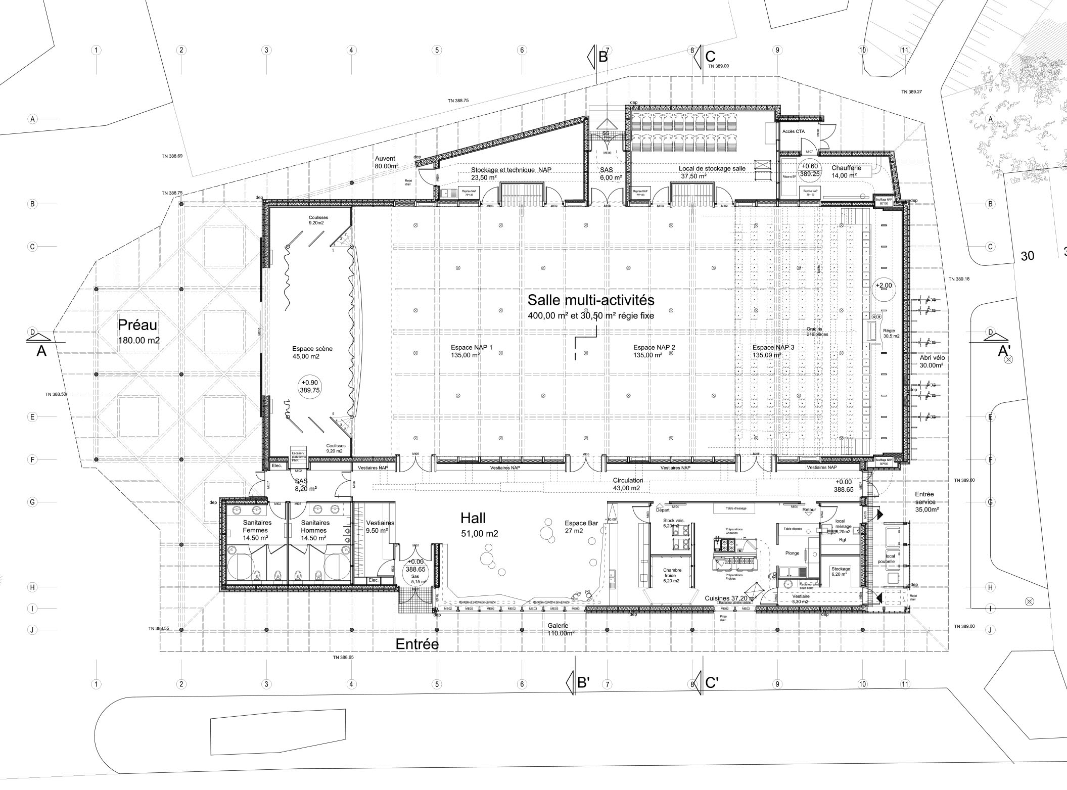 Approche environnementale : Le bâtiment est construit comme un dispositif en gigogne d'enveloppes successives. Au centre, les MOB de la salle multi-activité, bardés de panneaux acoustiques forment la première enveloppe. Une deuxième enceinte, est constituée par les MOB du hall et l'ensemble des locaux annexes. Les espaces extérieurs, couverts par une toiture végétalisée, forment la troisième enveloppe et permettent de tempérer l'air autour du bâtiment. L' efficacité thermique et acoustique se traduit à la fois dans le système constructif en ossature bois et dans l'organisation des espaces.