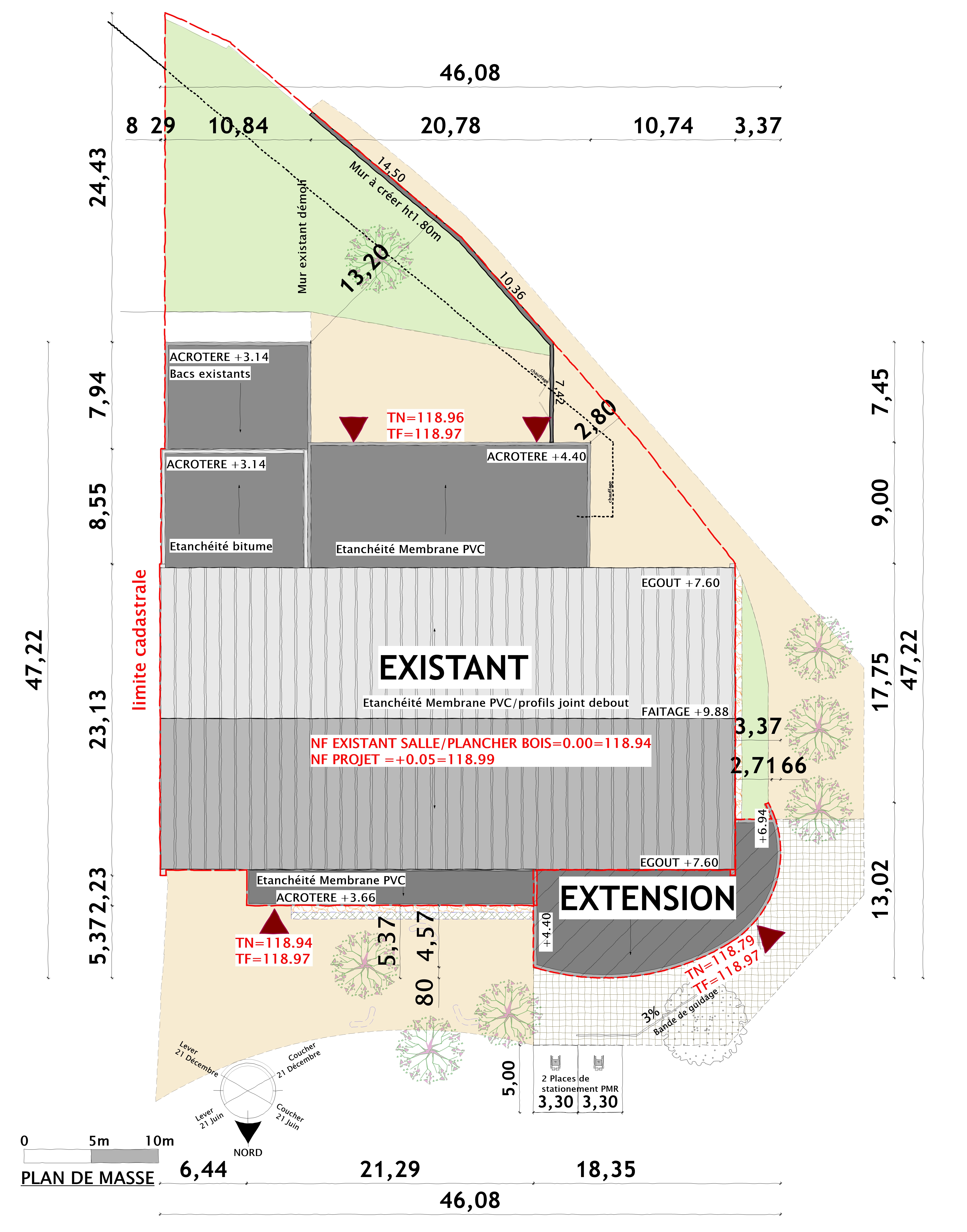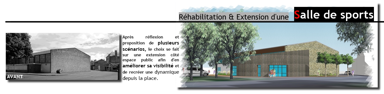 Restauration complète de la salle de sport vieillissante avec mise en valeur de sa charpente métallique. Redistribution totale et création de 4 vestiaires/sanitaires, 2 vestiaires arbitres dans le volume existant avec accès directs sur l'extérieur et local infirmerie afin de répondre aux demandes des fédérations sportives. Extension de la salle comprenant le club house et le bar. Cette extension est l'occasion de retravailler l'accueil de la salle et son ouverture sur l'espace public. Le volume bois cintré marque en douceur cette entrée, la rendant plus accueillante et redynamise la place.