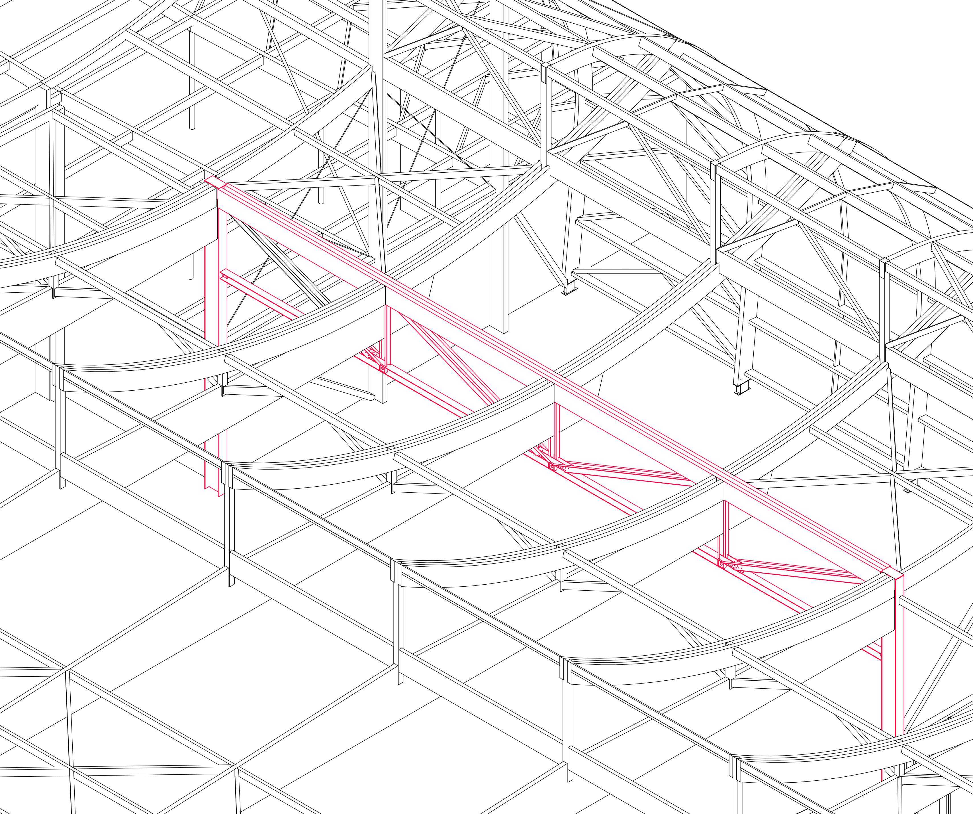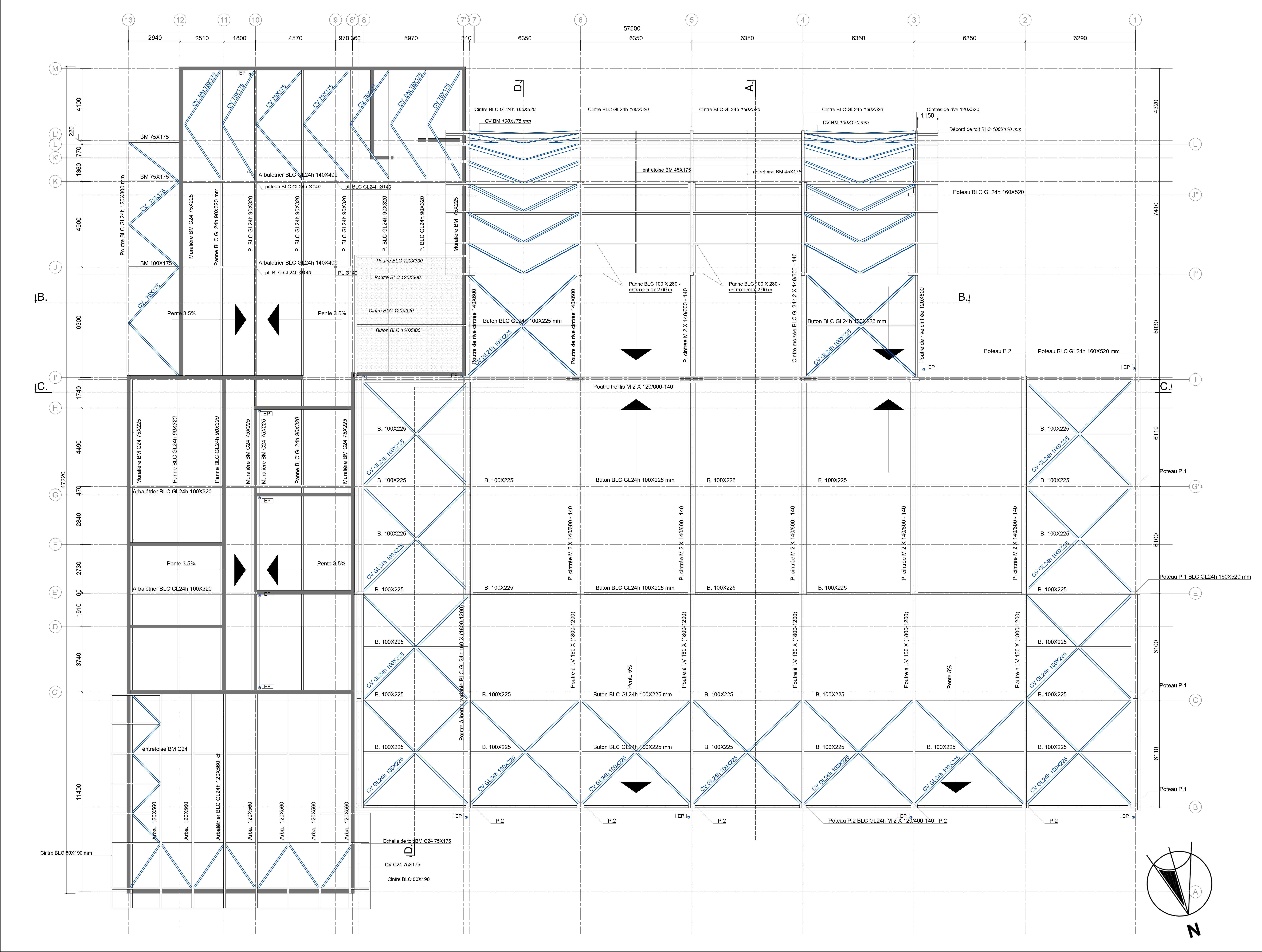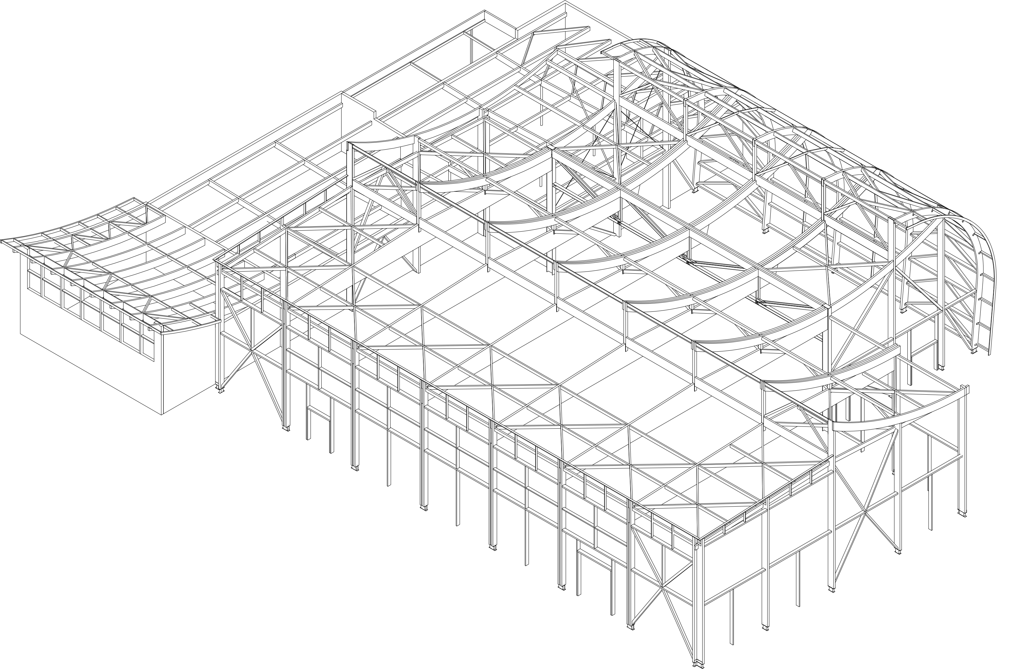 Descriptif technique : La charpente en lamellé collé est composée d’arbalétriers primaires à inertie variable de 24 m de portée reposant sur poteaux moisés pendulaires en bois et sur une poutre treillis mixte bois métal. Les poutres cintrées moisées des sheds de 24m de longueur sont liées aux arbalétriers par l’intermédiaire de potelets. En extrémité, elles sont fixées aux arbalétriers cintrés, support du complexe de couverture de la salle d’escalade. La poutre treillis de 25m de portée est constituée d’une membrure supérieure en lamellée collée et d’une membrure inférieure, de potelets et de diagonales en acier. Le contreventement est assuré par des poutres au vent en bois dans le plan de la toiture. Le complexe multicouche de couverture est constitué d’un plateau porteur de grande portée disposé entre portiques bois espacés de 6.30m. La forme trapézoïdale du plateau permet de s’adapter au cintre de la couverture et de s’affranchir de pannes intermédiaires. Marquage CE