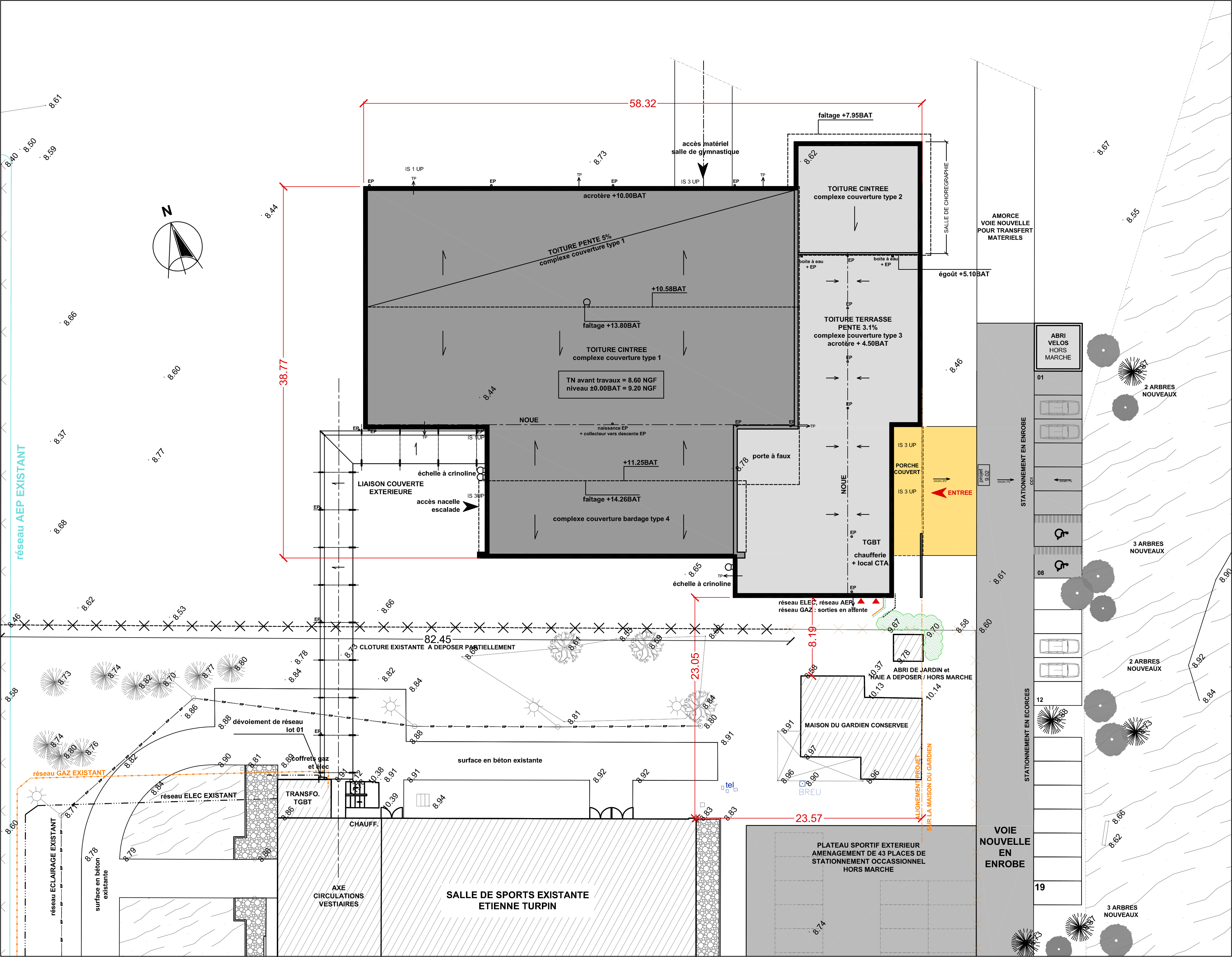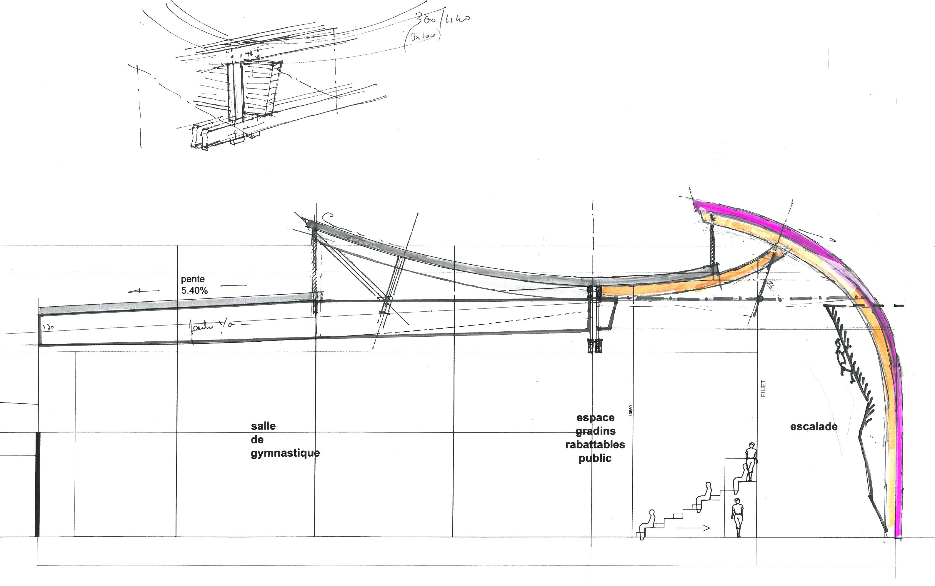 Approche environnementale : L’architecture traduit ainsi une réponse fonctionnelle et technique. La volumétrie du projet naît de la volonté d’éclairer naturellement l’espace en tout point et ceci uniquement depuis la façade nord pour éviter tout éblouissement des gymnastes lors de la pratique des agrès. Ainsi, les formes convexes et concaves des arbalétriers dessinent deux sheds en toiture qui éclairent à profondeur successive la salle de sport.