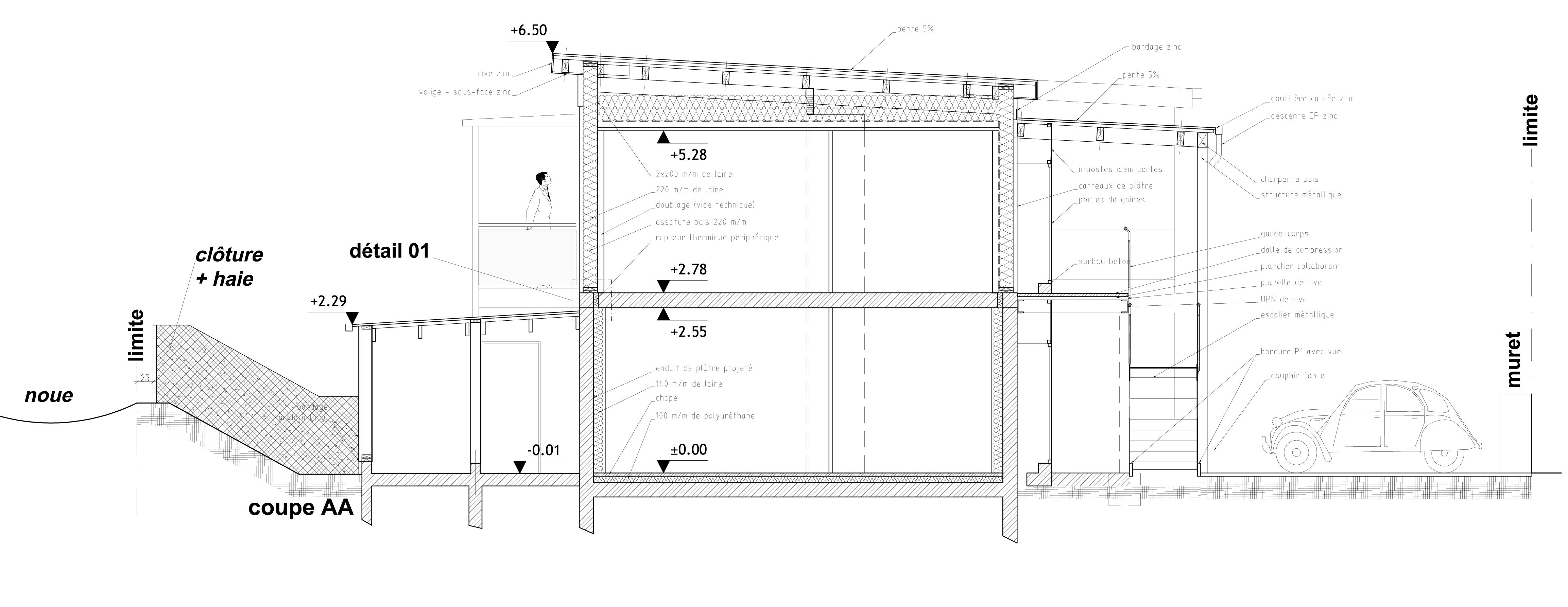 Descriptif technique : Le socle et la dalle intermédiaire en béton permettent à moindre coût d'assurer l'affaiblissement acoustique de 53 dB entre logement. L'étage et la charpente sont en bois. Les éléments décoratif et annexes sont également en ossature bois et en douglas. L'ossature bois de 220 mm permet d'atteindre une très bonne efficacité thermique. Peu d'ouvertures au nord pour limiter les déperditions et de larges ouvertures au sud assurent des apports solaires passifs. Les protections solaires pour assurer le confort d'été sont assurées par les balcons et les débords des balcons.