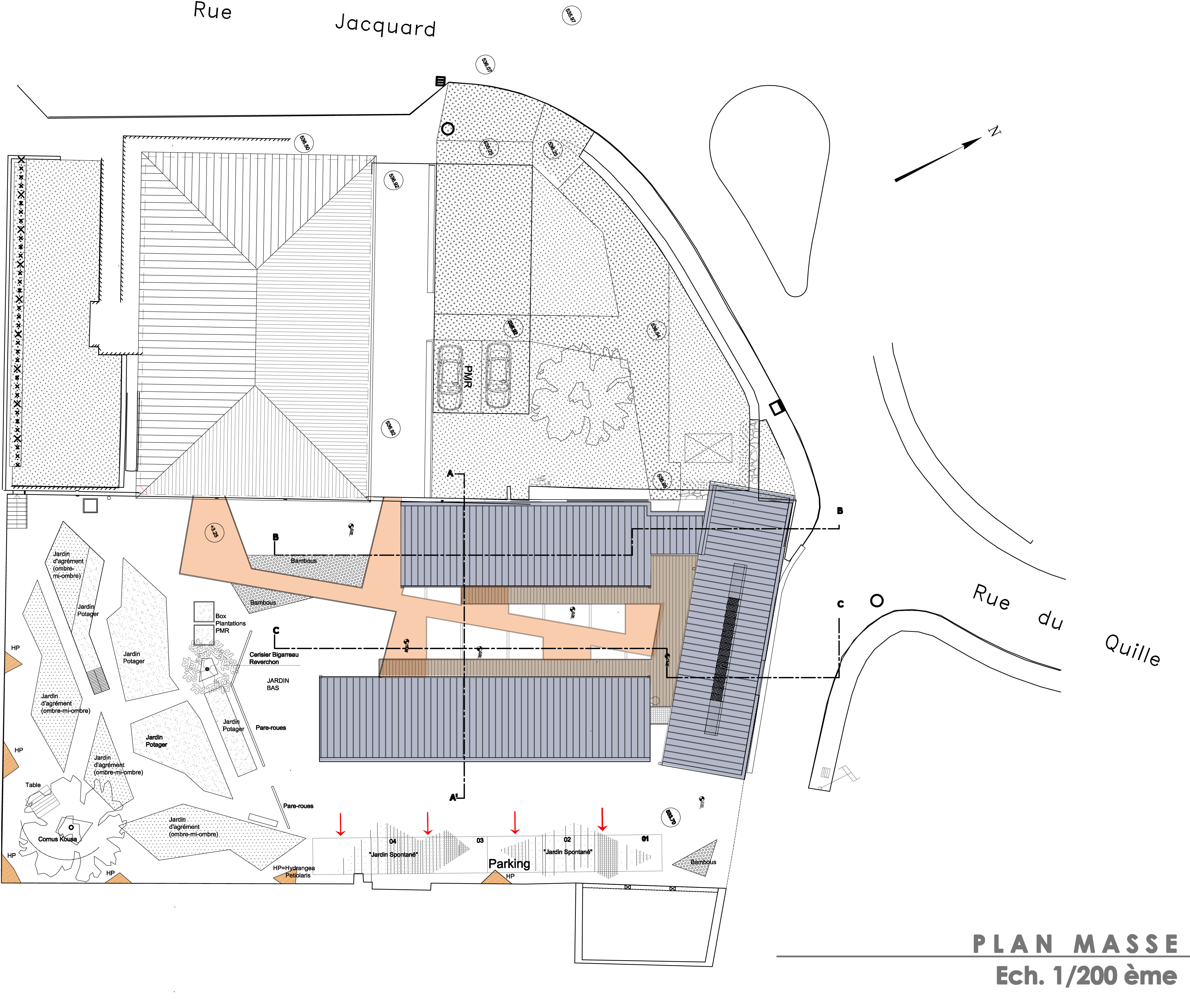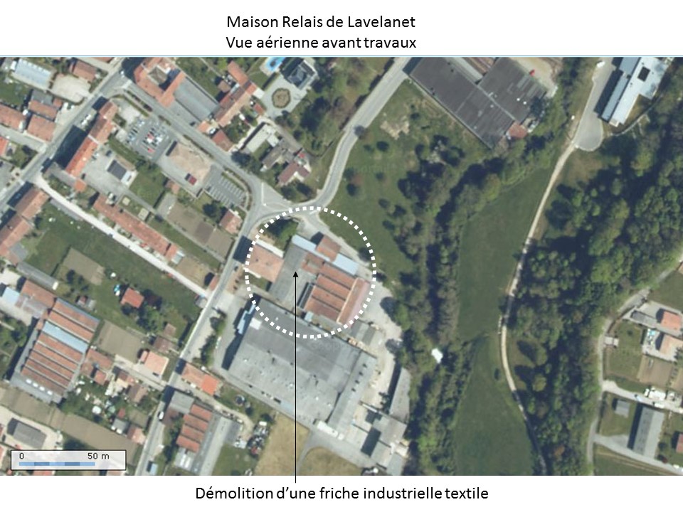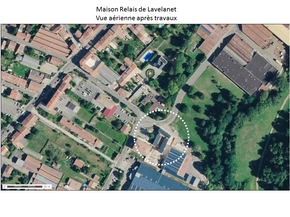 Maison Relais de 19 appartements pour la Croix Rouge et le relogement de personnes en difficultés. Le bâtiment découle d'une composition ouverte, selon trois corps de bâtis qui épousent la géométrie urbaine et qui forment une cour intérieure en U, préservant l'intimité des locataires. Les passerelles de circulations en bois sont conçues comme une promenade architecturale ouverte sur le paysage. Chaque appartement est traversant. La construction en ossature bois utilise du bois régional (filière courte, filière sèche, recyclage) pour ses qualités esthétiques et son rapport économique (légèreté, préfabrication en atelier, rapidité de pose). Les façades sont pour la plupart enduites sur ITE. Le toit accueille des panneaux solaires pour la production d’ECS.