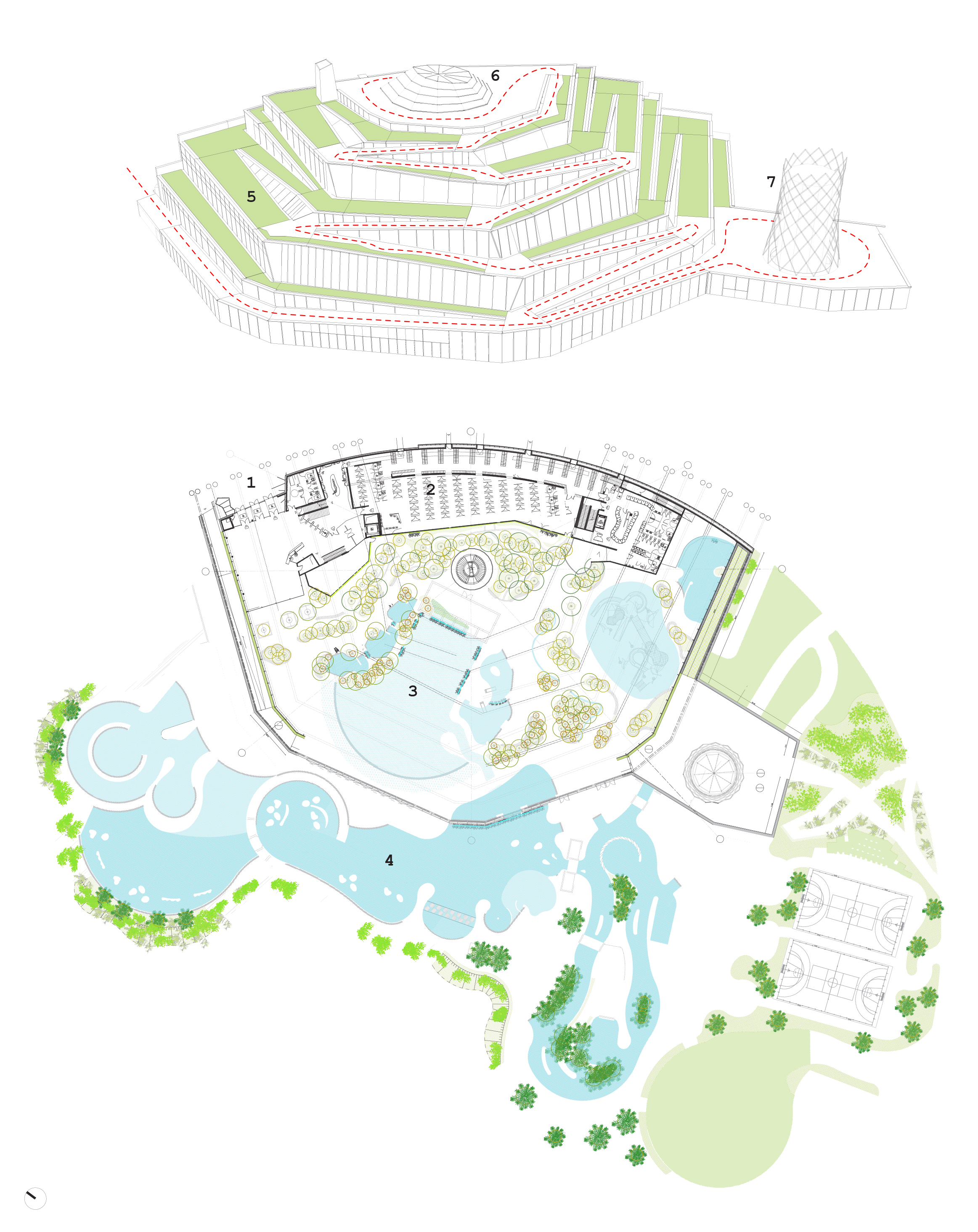 Icône de Villages Nature Paris, le parc aquatique Aqualagon se constitue d’une pyramide de verre portée par un chapiteau de bois prolongée d’espaces extérieurs dont un lagon. Aqualagon offre un monde récréatif de découverte et de détente novateur et entièrement connecté à la nature. Au pied d’une large étendue d’eau, il se déploie comme un origami pour culminer à une vingtaine de mètres. Cascades, brumes, vapeurs d’eau, plantes aquatiques, jardins suspendus forment un paysage construit : l’ambigüité entre paysage et construction est omniprésente. Les visiteurs sont invités à vivre une expérience supplémentaire aux divertissements aquatiques intérieurs en arpentant ce paysage et à découvrir des vues plongeantes vers l’intérieur de l’Aqualagon, sur le village et ses environs. L’origami, en se déployant, crée des vides remplis de larges panneaux vitrés qui laissent la lumière naturelle pénétrer à l’intérieur et procurent aux baigneurs la sensation de continuité avec l’extérieur.