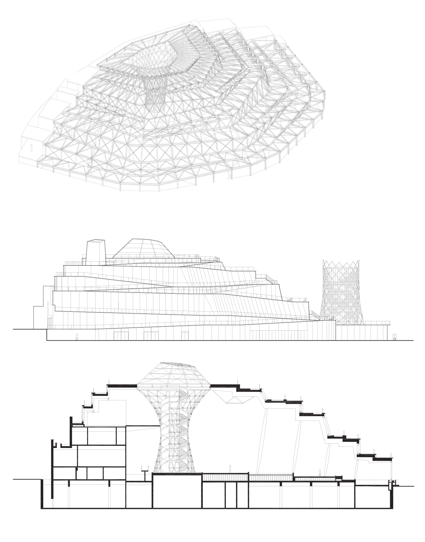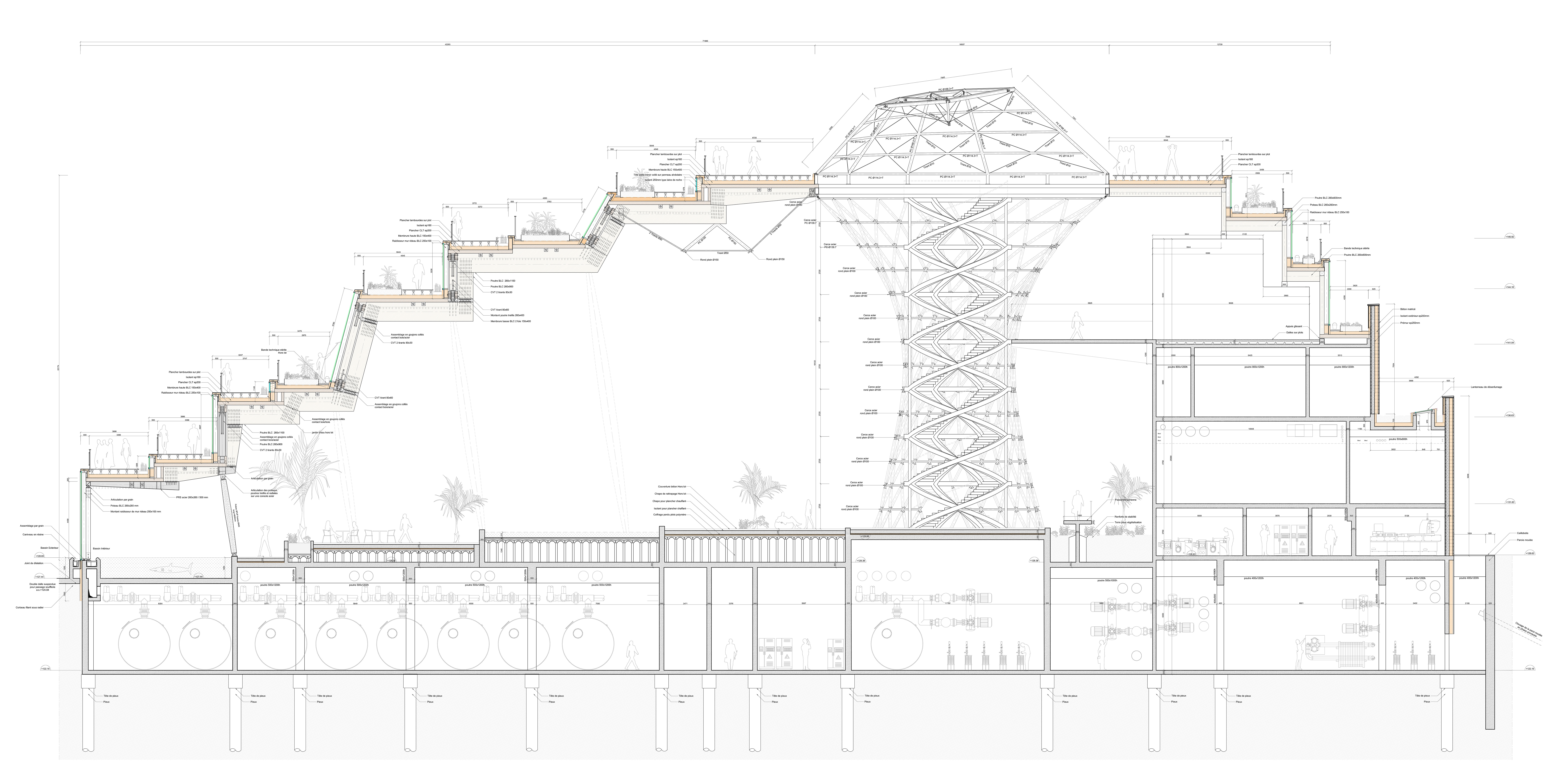 Descriptif technique : Le caractère unique de cette structure en bois & acier de grande portée complexe (jusqu’à 30m) est d’avoir trouvé une typologie structurelle qui résolve l’accessibilité au public de la toiture tout en permettant l’optimisation du nombre d’appuis compte tenu de l’aménagement du RDC. Des poutres treillis placées dans les plis de l’origami, « tangentes » à la surface permettent un positionnement plus libre des appuis et intègrent la structure à la forme de la couverture pour donner en sentiment de transparence. L’ensemble est un Grid Shell à géométrie aléatoire constitué par l’assemblage des poutres treillis bois&acier, de poutres brisées rayonnantes en lamellés collés et de planchers en CLT. Ce projet inhabituel a permis l’expérimentation de procédés innovants : assemblages par gougeons collés, une modélisation avancée des ossatures bois et la réalisation d’une couverture en panneaux bois dans un milieu à très forte hygrométrie (procédure ATEX). PEFC (Gestion forestière durable) CTB P (Produits de traitement) NF Portes résistant au feu en bois Marquage CE NF Bâtiments Tertiaires Démarche HQEe