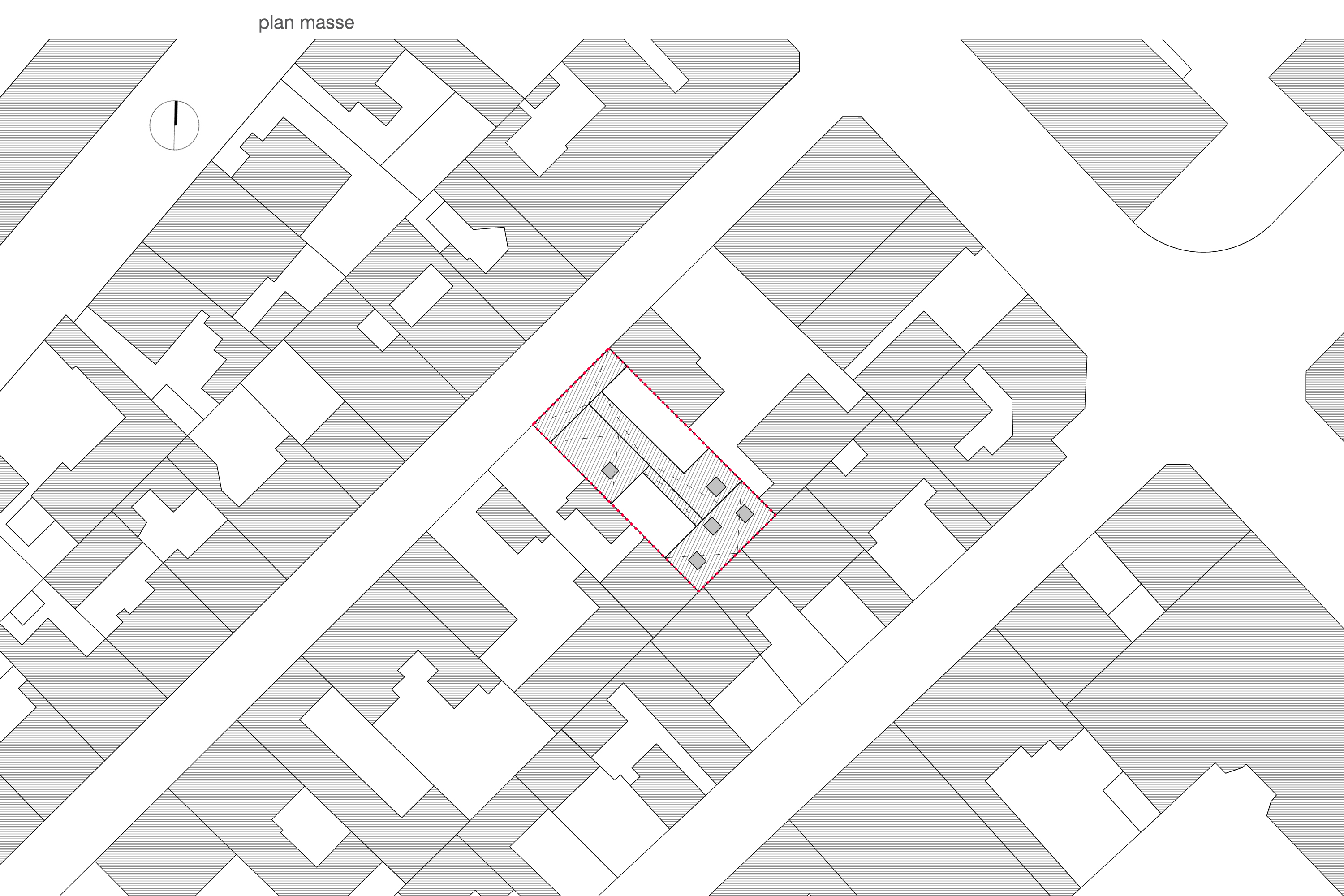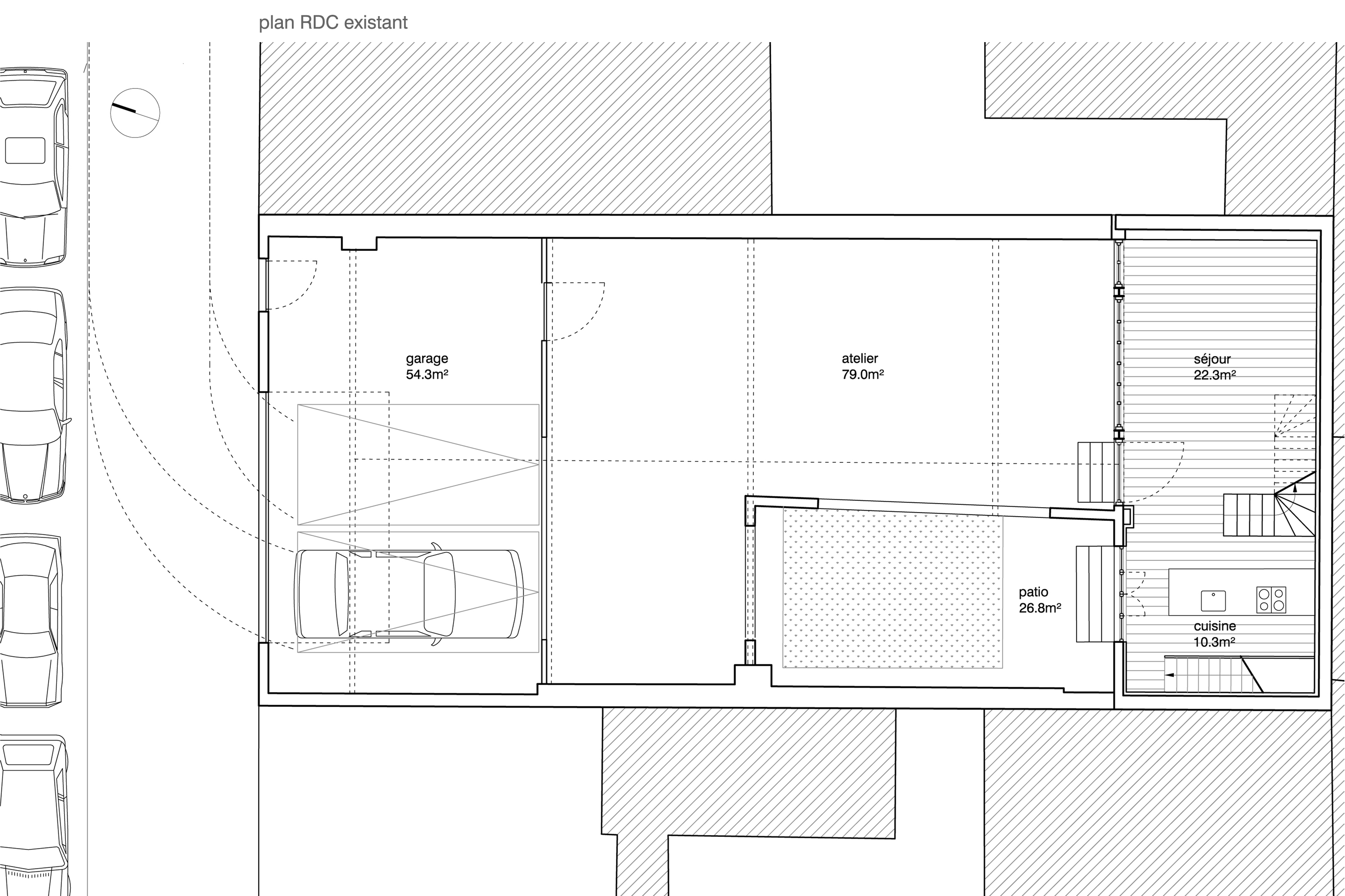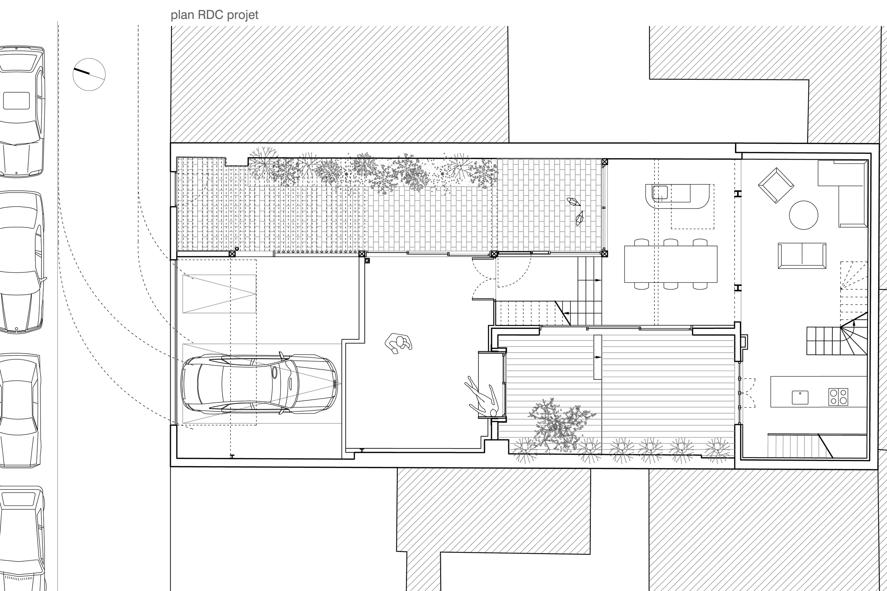 Le projet visait à améliorer un existant : une parcelle 100% construite dans un quartier dense au cœur de la ville de St Ouen. La parcelle se divisait en 3 parties : un garage sur rue, un atelier (ancienne usine) et une maison en fond de parcelle. La maison a été récemment réhabilitée et abrite au RDC un salon / cuisine, au R+1 deux chambres, une salle de bain et un WC et au sous-sol une buanderie ainsi qu’une grande chambre d’ami. La maison au RDC restait très sombre malgré les travaux effectués. Le but du projet est à la fois d’augmenter la surface de la maison en agrandissant le salon et créant, entre autres, une salle d’activité, un bureau, une chambre avec salle de bain, et aussi de gagner en luminosité et ouvrir les vues. Le projet est conçu dans un souci d’économie de moyen ou les éléments existants restent en place. Nous proposons de créer une maison entre deux patios qui seront les outils spatiaux pour apporter de la lumière, dégager des vues et gérer les programmes supplémentaires. Nous envisageons deux opérations de soustraction dans la masse : - nous profitons du patio qui a déjà été réalisé - nous créons un autre patio le long de l’autre limite séparative allant du salon jusqu’à l’accès sur rue. Ainsi, le salon est étendu jusqu’aux deux patios pour profiter d’un maximum de lumière alors que les espaces plus privatifs comme la salle d’activités, le bureau et la chambre avec salle d’eau viennent se loger dans l’ancien atelier largement ouvert sur les deux patios. L’entrée de la maison se situe à l’interstice là où la maison est la plus étroite. Pour accentuer, le jeu entre ouvert / fermé d’une typologie à patio, nous brouillons le rapport dedans/dehors en jouant sur des espaces accessibles, des espaces vues et des niches donnant une épaisseur aux parois vitrées.