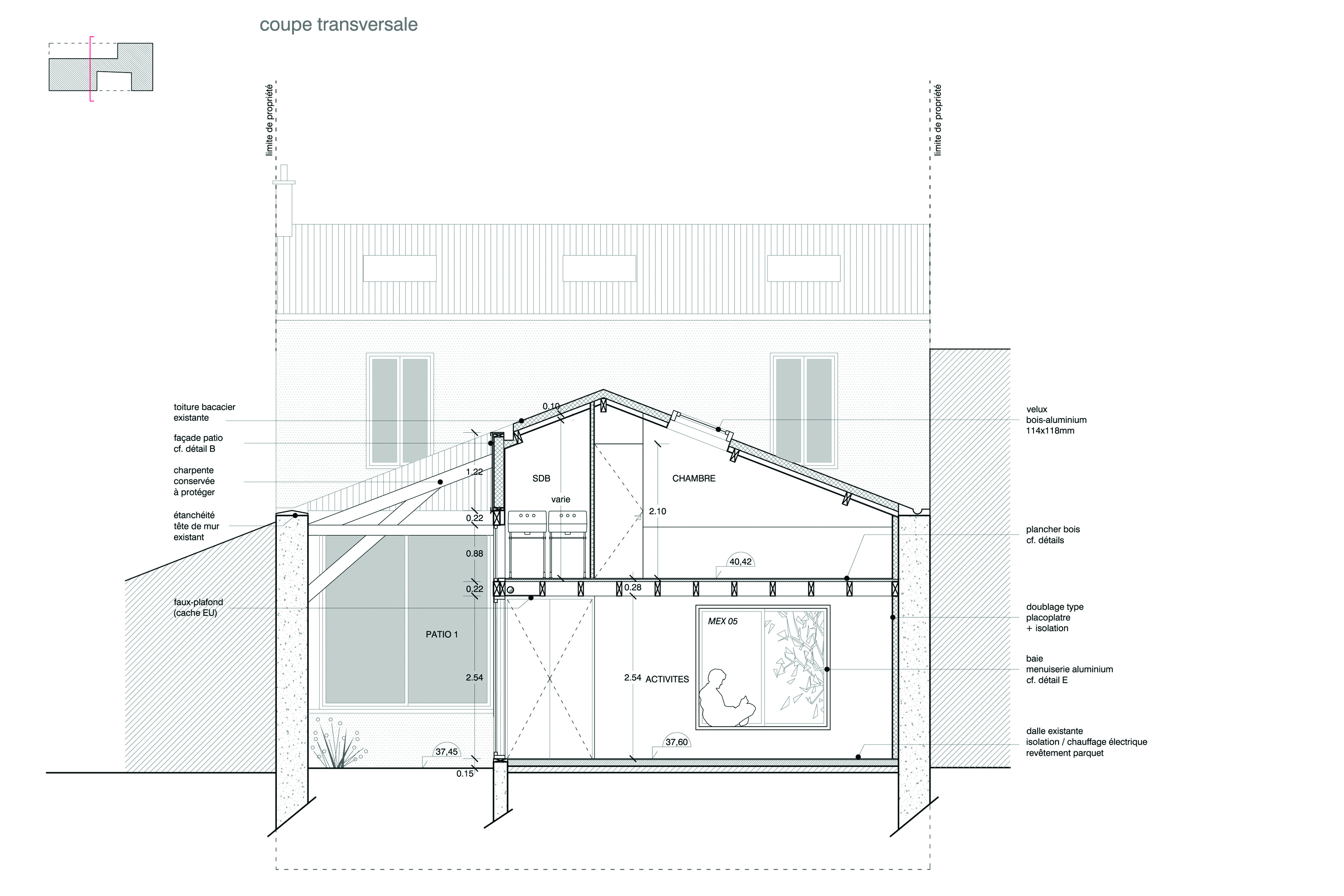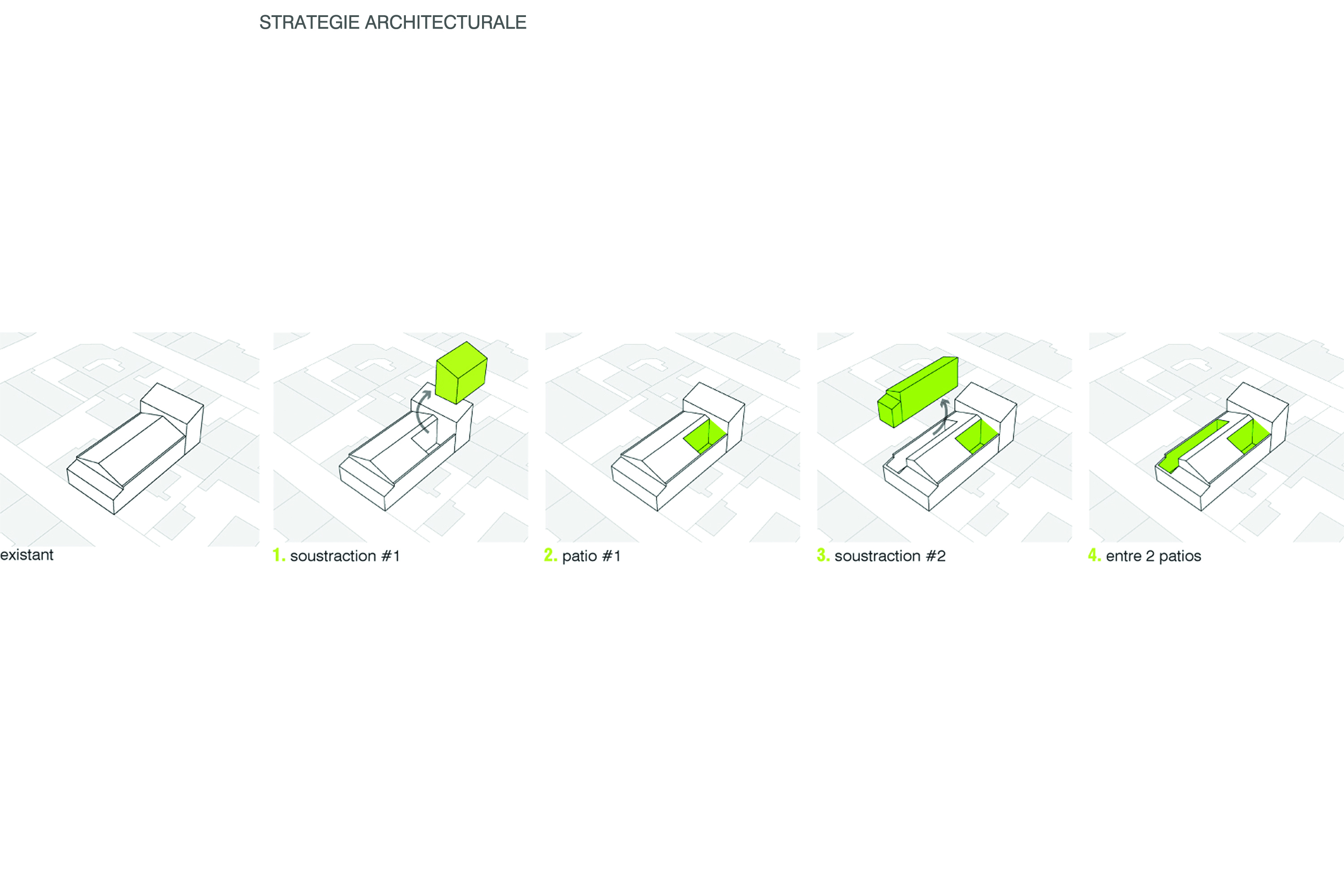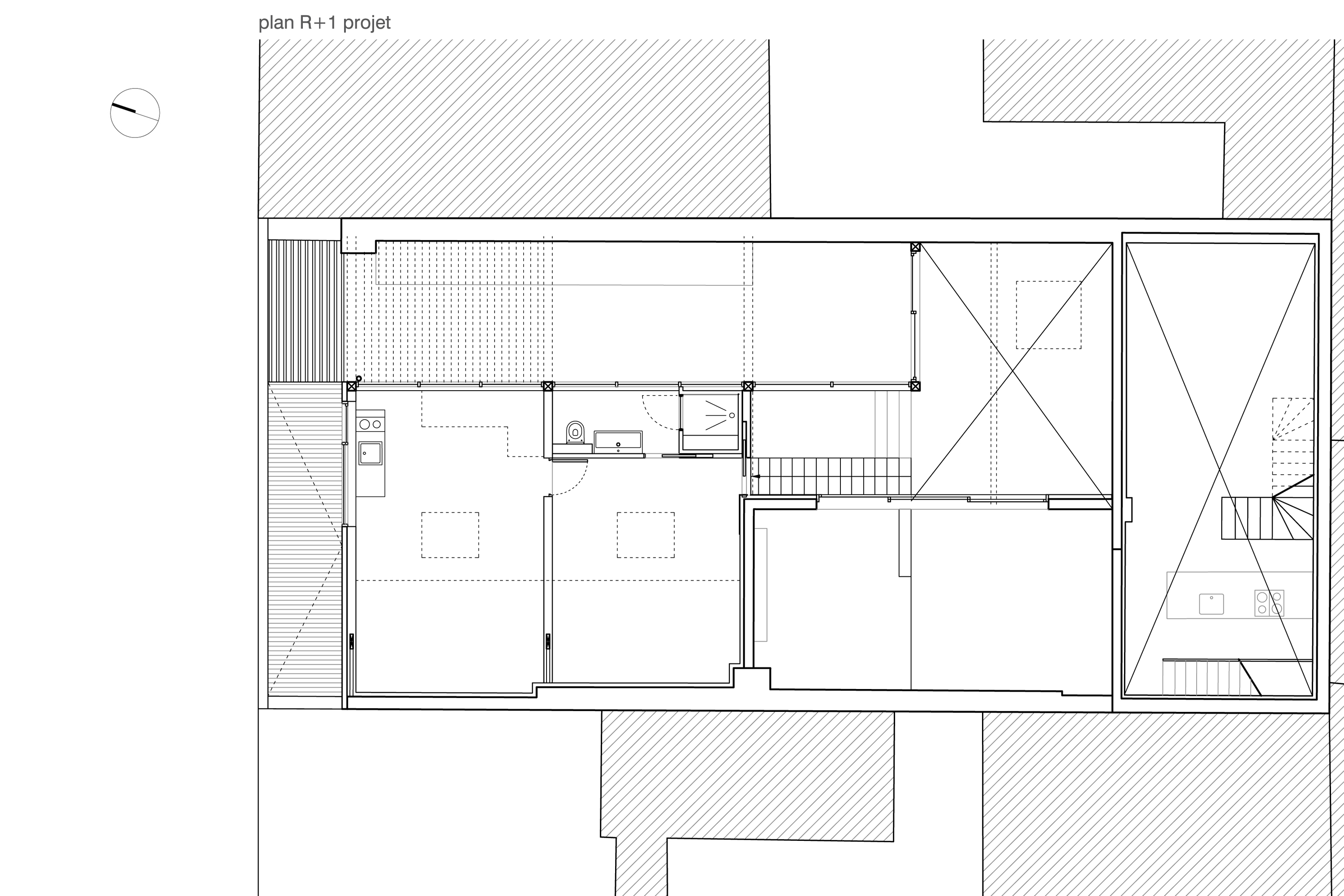 Le projet visait à améliorer un existant : une parcelle 100% construite dans un quartier dense au cœur de la ville de St Ouen. La parcelle se divisait en 3 parties : un garage sur rue, un atelier (ancienne usine) et une maison en fond de parcelle. La maison a été récemment réhabilitée et abrite au RDC un salon / cuisine, au R+1 deux chambres, une salle de bain et un WC et au sous-sol une buanderie ainsi qu’une grande chambre d’ami. La maison au RDC restait très sombre malgré les travaux effectués. Le but du projet est à la fois d’augmenter la surface de la maison en agrandissant le salon et créant, entre autres, une salle d’activité, un bureau, une chambre avec salle de bain, et aussi de gagner en luminosité et ouvrir les vues. Le projet est conçu dans un souci d’économie de moyen ou les éléments existants restent en place. Nous proposons de créer une maison entre deux patios qui seront les outils spatiaux pour apporter de la lumière, dégager des vues et gérer les programmes supplémentaires. Nous envisageons deux opérations de soustraction dans la masse : - nous profitons du patio qui a déjà été réalisé - nous créons un autre patio le long de l’autre limite séparative allant du salon jusqu’à l’accès sur rue. Ainsi, le salon est étendu jusqu’aux deux patios pour profiter d’un maximum de lumière alors que les espaces plus privatifs comme la salle d’activités, le bureau et la chambre avec salle d’eau viennent se loger dans l’ancien atelier largement ouvert sur les deux patios. L’entrée de la maison se situe à l’interstice là où la maison est la plus étroite. Pour accentuer, le jeu entre ouvert / fermé d’une typologie à patio, nous brouillons le rapport dedans/dehors en jouant sur des espaces accessibles, des espaces vues et des niches donnant une épaisseur aux parois vitrées.