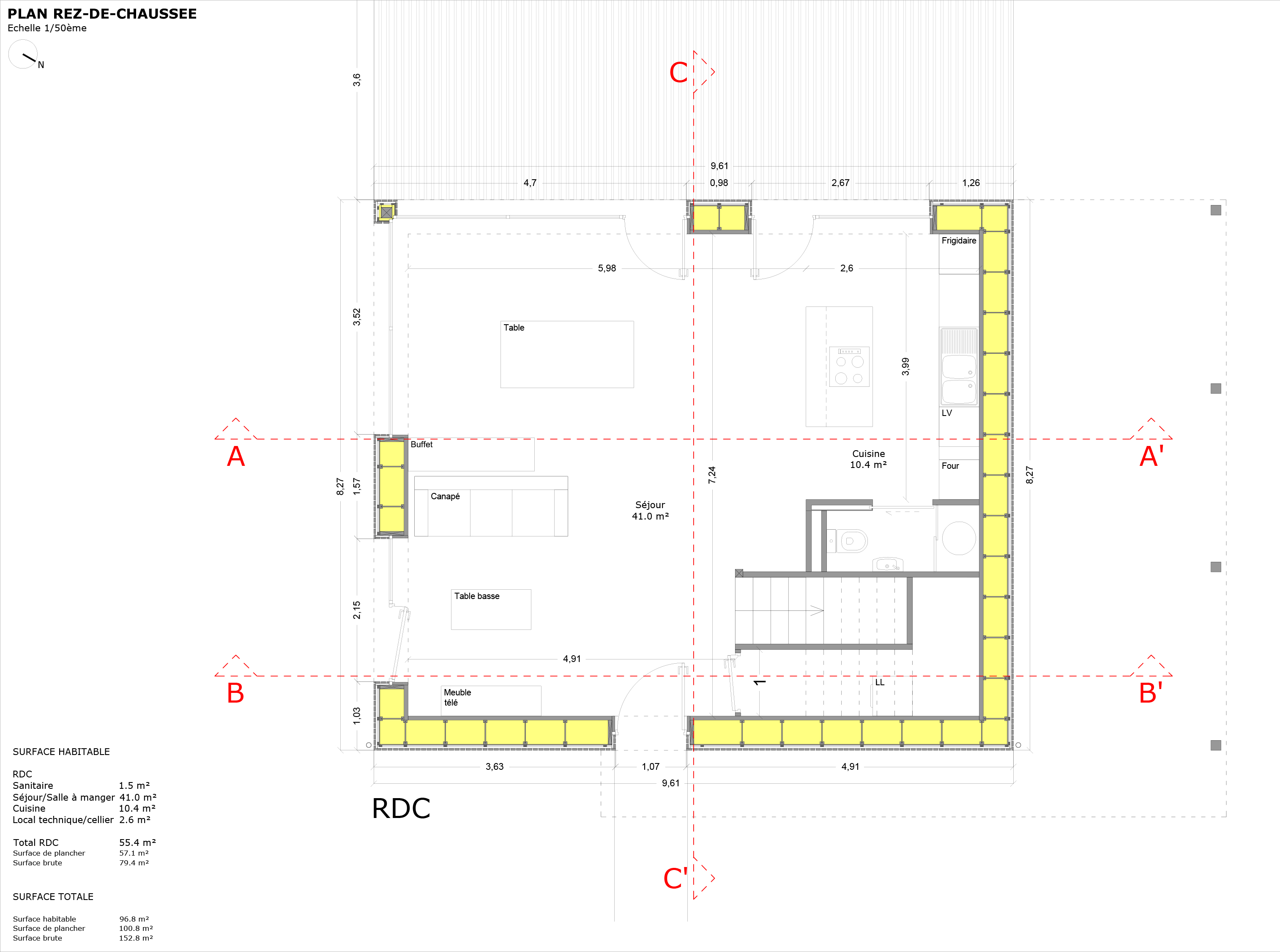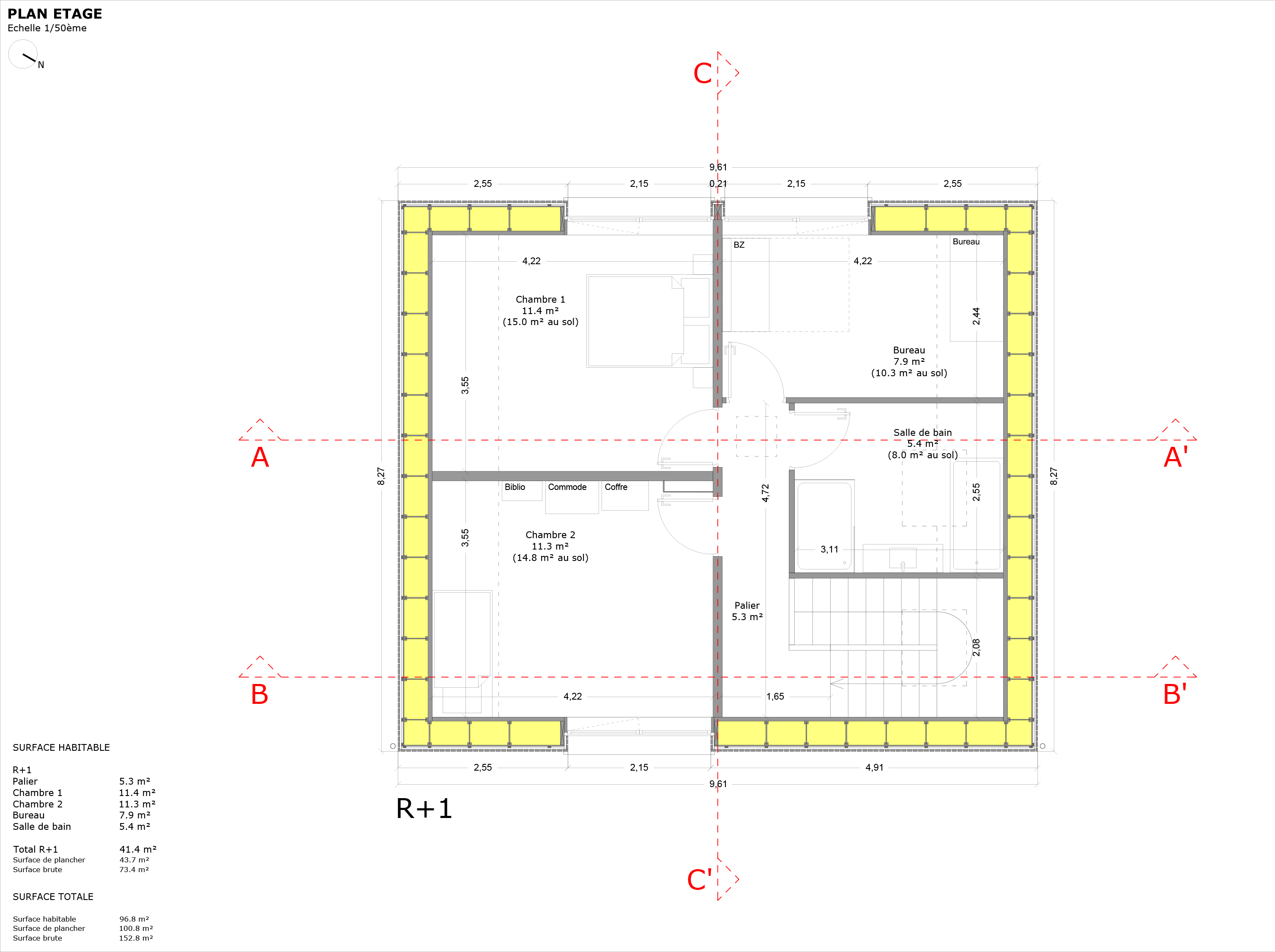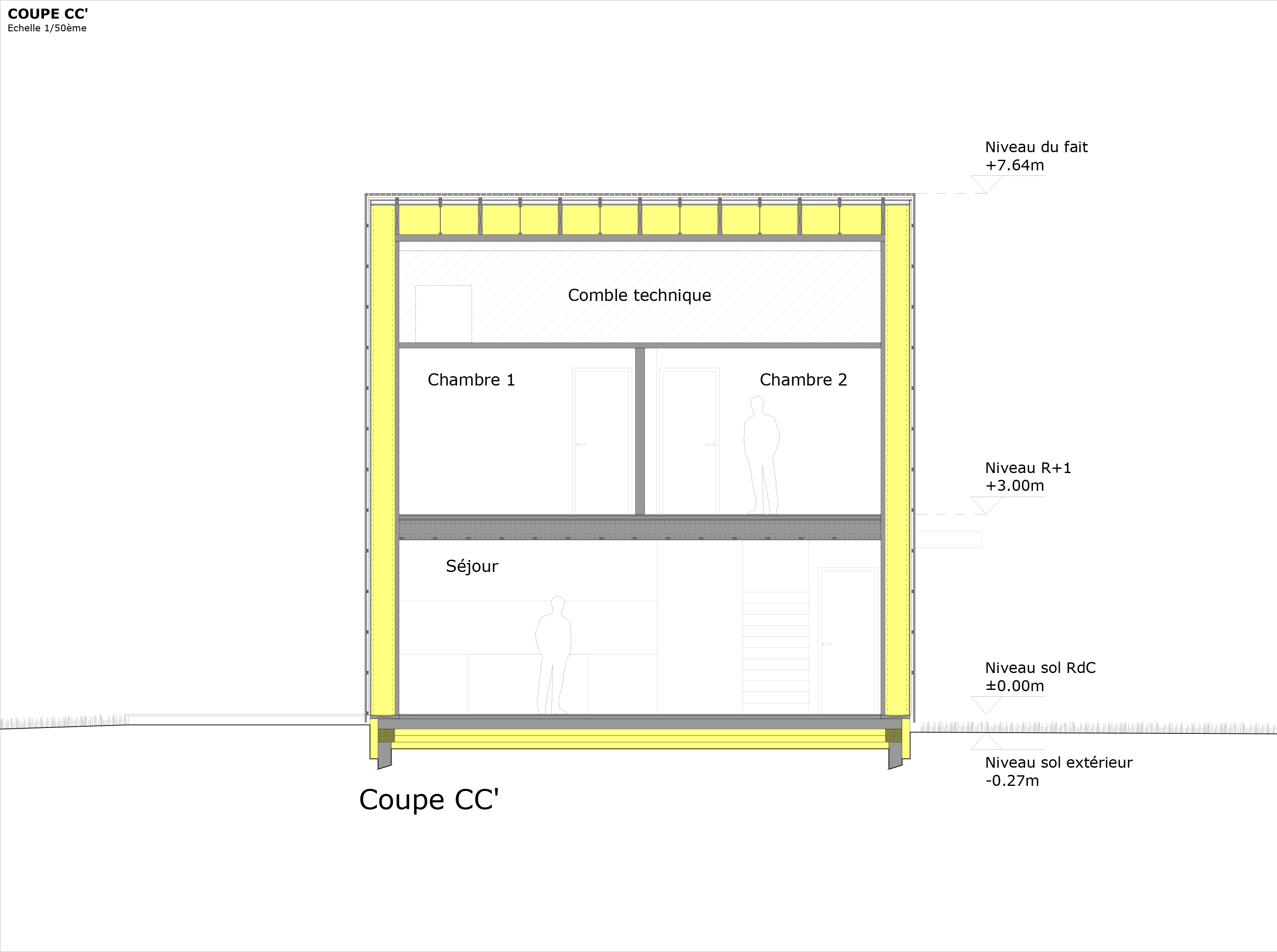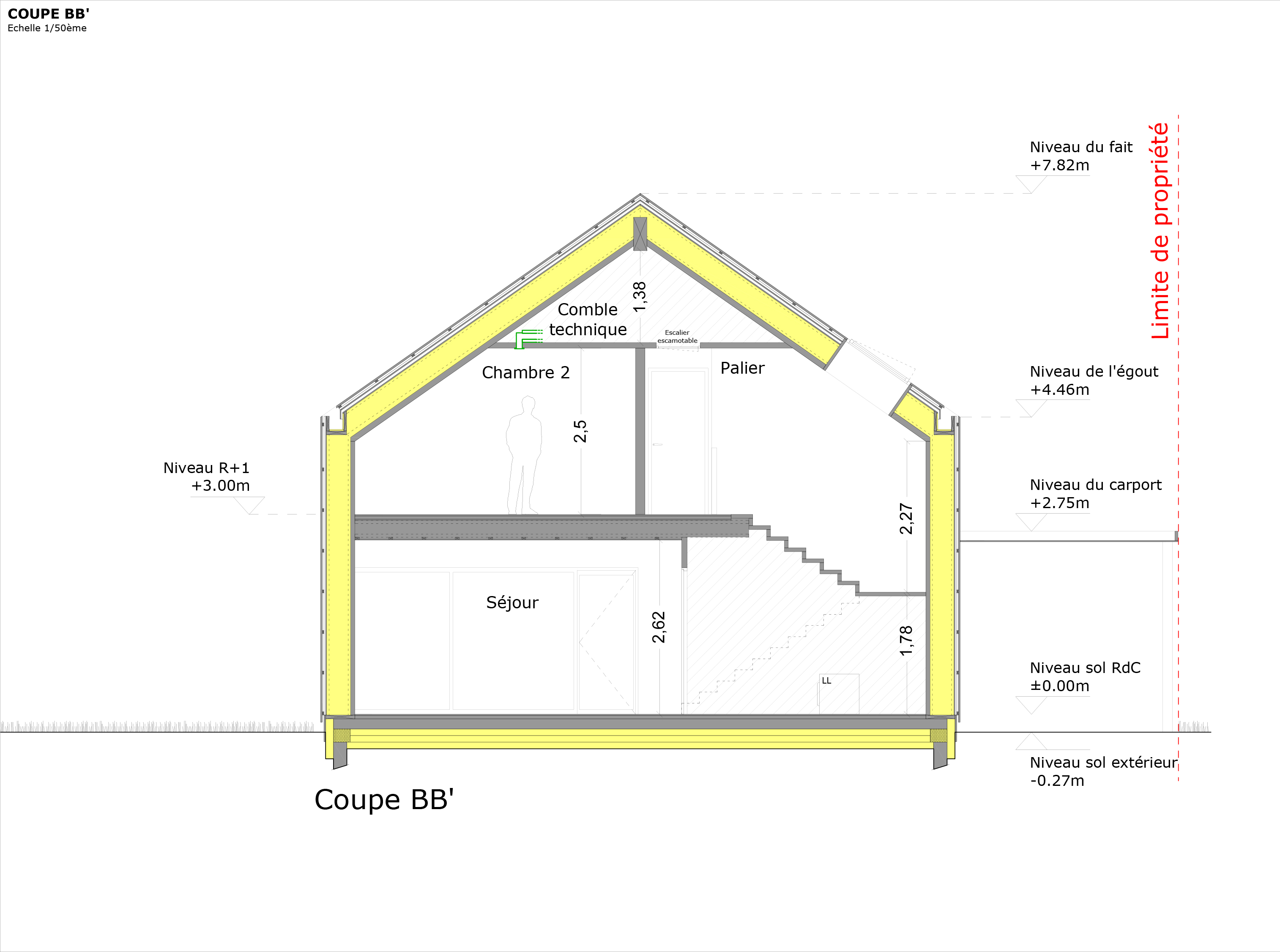 Approche environnementale : Ossature bois massif / Isolation en Ouate de cellulose (Ossature) / Fibre de bois (Pare pluie) / Fibre de bois (Cloisons) / Menuiseries PVC Alu triple vitrage / Etanchéité à l’air / VMC double flux / Cuve d’eau de pluie