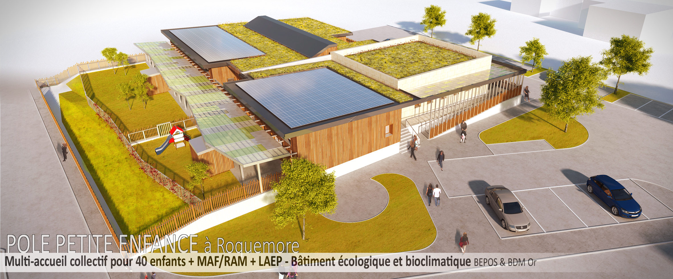 Approche environnementale : Le projet du Pôle petite enfance de Roquemaure est le résultat d'un véritable travail d'équipe entre Maîtrise d'Ouvrage, Équipe pédagogique et Maîtrise d'œuvre. Ce bâtiment s'inscrit dans une réelle volonté de tous ces acteurs de réaliser un projet exemplaire, écologique, innovant, durable, sans oublier la priorité de qualité d'usage permettant d'offrir aux enfants et aux personnels, un lieu sain où il fait bon d'évoluer, de grandir ou de travailler. Cette volonté s'est appuyée sur la Démarche BDM Occitanie, et s'est traduite par une conception bioclimatique, des performances thermiques, énergétiques, d'étanchéité à l'air supérieurs aux exigences réglementaires, la mise en place de panneaux photovoltaïques permettant d'atteindre le niveau BEPOS, et une intégration maximale de matériaux bio-sourcés locaux. En synthèse les Maîtres d'œuvre se sont attachés à concevoir et réaliser un bâtiment à l'enveloppe performante (bâtiments passifs en pierre, bois, paille et terre) à laquelle ont été ajoutés quelques équipements techniques performants (pompe à chaleur géothermique et ventilation double flux). Les panneaux photovoltaïques permettent à ce bâtiment passif d'être Bepos.