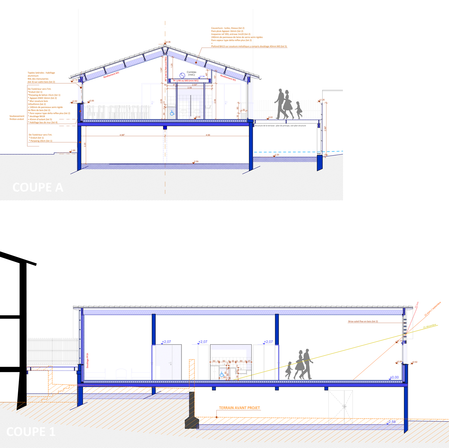 Approche environnementale : Le terrain proposé pour l'extension de l'école était constitué de la cour existante (entourées de murets hauts) et d'un parking situé entre contre-bas de celle-ci. L'implantation du projet dans la pente a permis de limiter les terrassements nécessaires à un minimum, d’agrandir la cour et de créer une percée depuis le portail de l’école jusqu’à l’entrée du bâtiment, vers les collines du lauragais et les Pyrénées. L'implantation de l'école perpendiculairement à la pente permet de bénéficier des meilleures expositions dans les salles d'activités : Sud-Est et Sud-Ouest. Le dortoir se trouve lui au calme, au nord du bâtiment. Des protections solaires adaptées ont bien-sûr été prévues pour les orientations concernées. Comme dans tous les projets de l’agence Collart, les matériaux mis en œuvre sont les plus naturels et biosourcés possible.