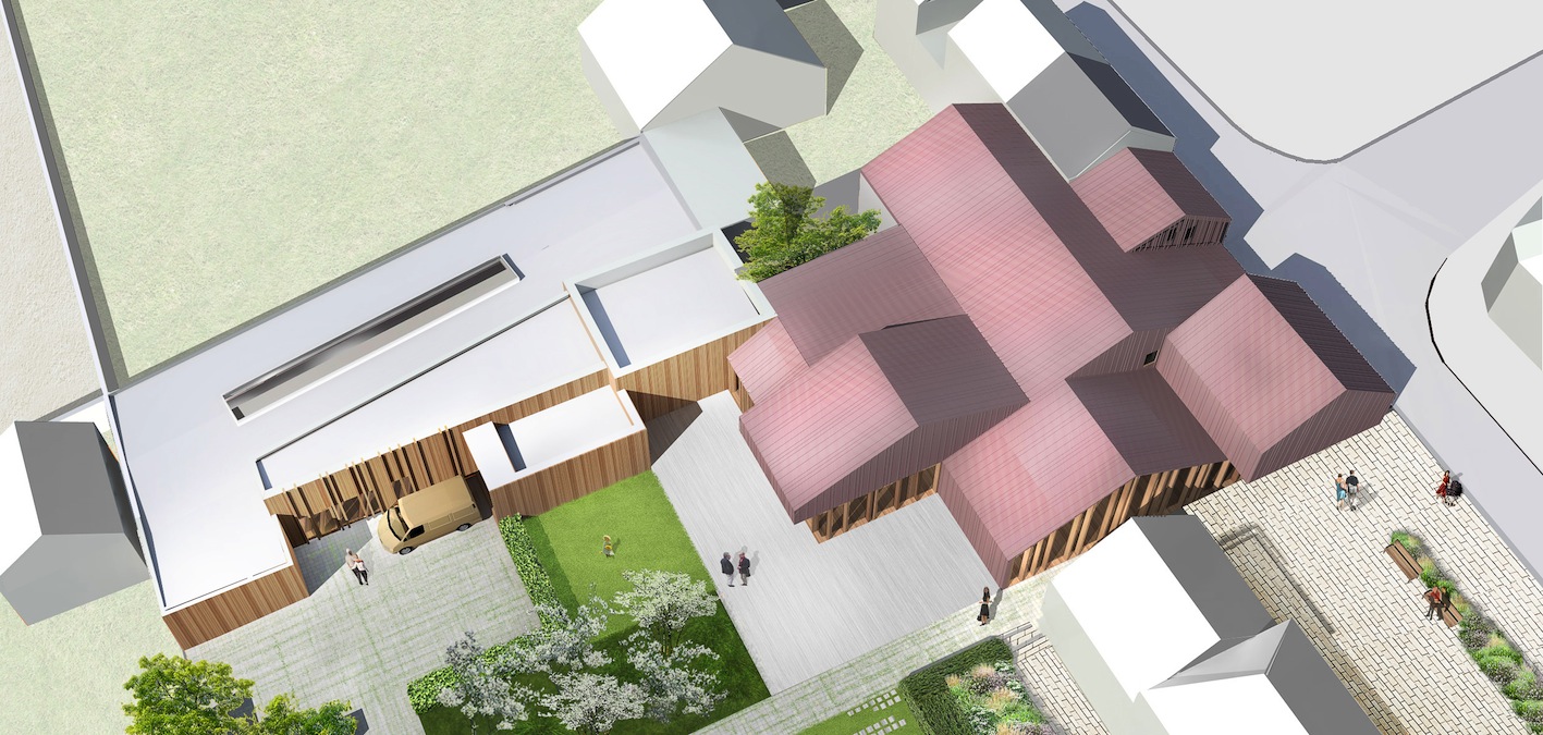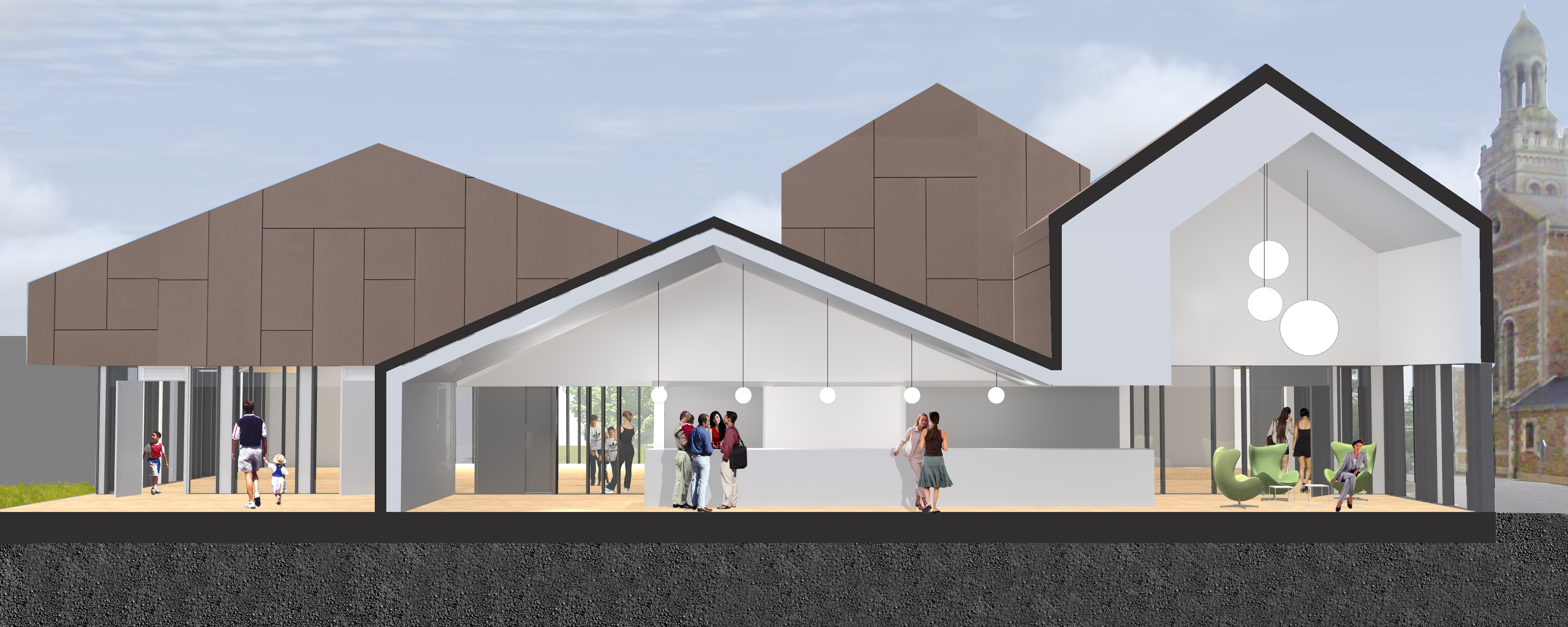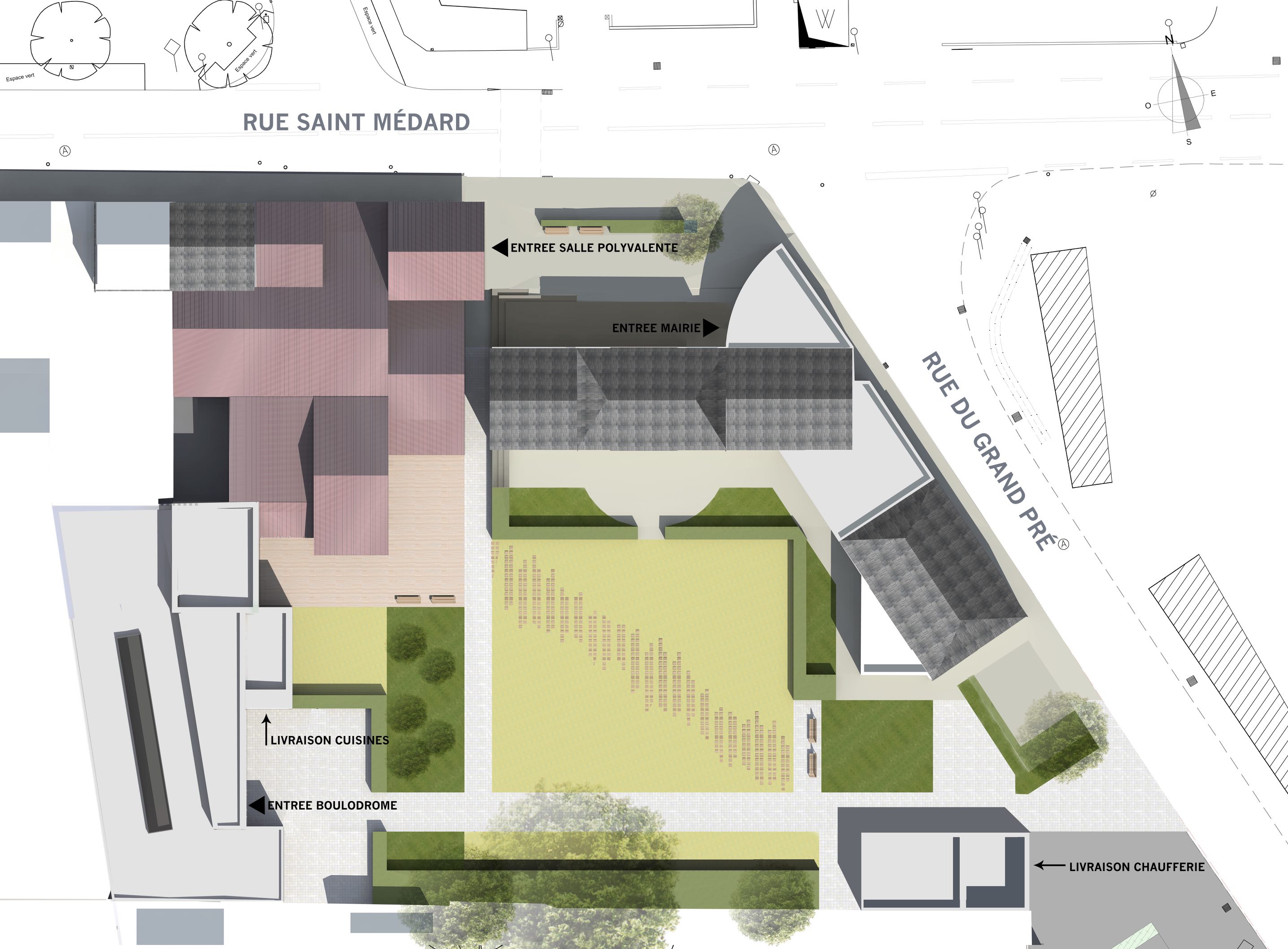 Implanté en limite de d’emprise publique, le bâtiment s’attache à reconstituer le front bâti de la rue St Médard. Le projet s’inspire largement des volumes des constructions voisines, en reprenant leur typologie de maisonnettes mitoyennes. Cependant, afin de détacher cet équipement public du vocabulaire de la maison individuelle, une architecture contemporaine aux lignes épurées est affirmée. Le système se déploie vers le parc formant un assemblage de 6 « maisons ». L’une d’elles est détachée du sol et mise en porte à faux pour faire place à l’entrée de la salle.