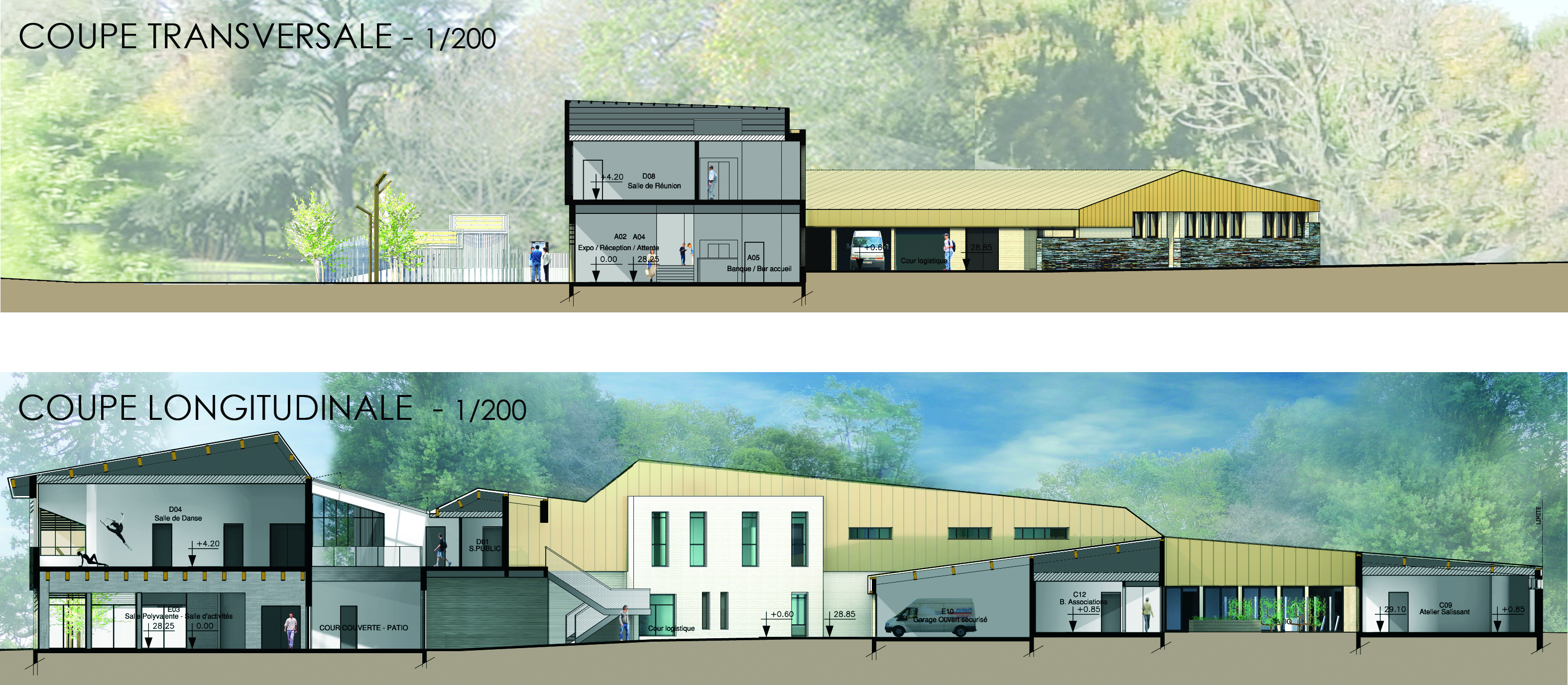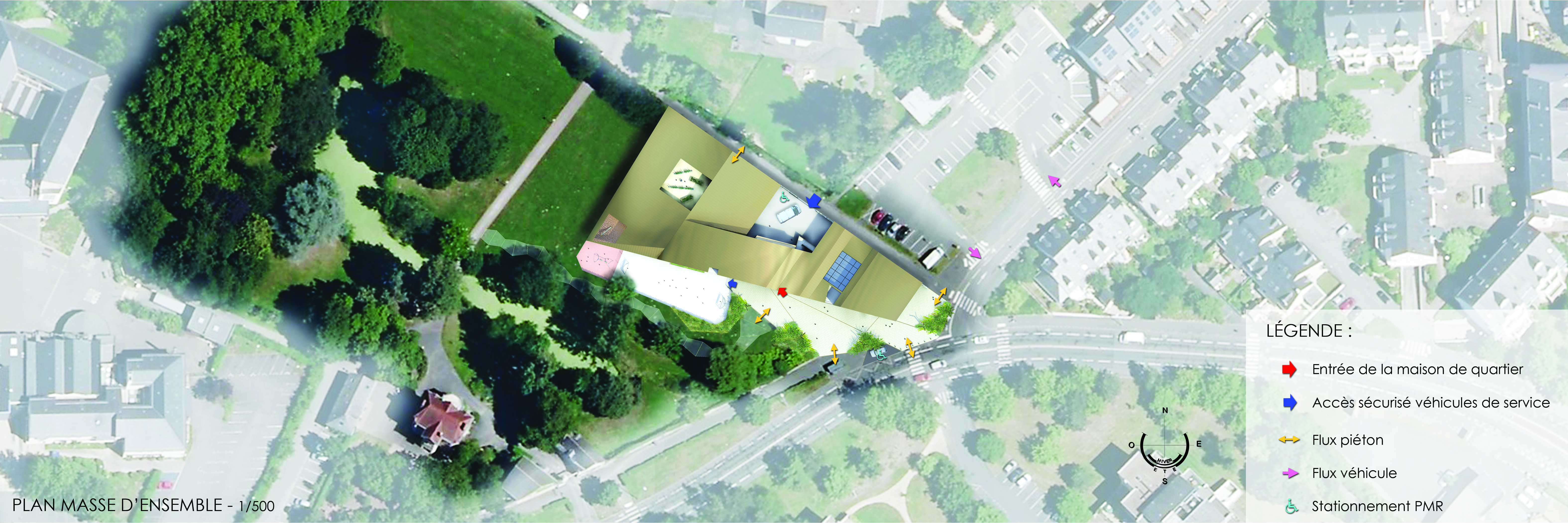 Le bâtiment s'impose sur 2 étages comme un signal fort du renouveau et de la polarité du site dans ce cœur de quartier. La maison de quartier tend sa peau de bois et son toit facetté de zinc « or perle », en offrant un parvis accueillant et très dégagé sur la rue. Elle épouse la topographie naturelle du terrain par un jeu de demi-niveau. L'origami de la toiture fait écho aux variations d'altitude du paysage arboré et symbolise dans son rythme ses multiples fonctionnalités en utilisant un vocabulaire architectural homogène constitué de trois matériaux exclusifs: le bois, le zinc et le schiste