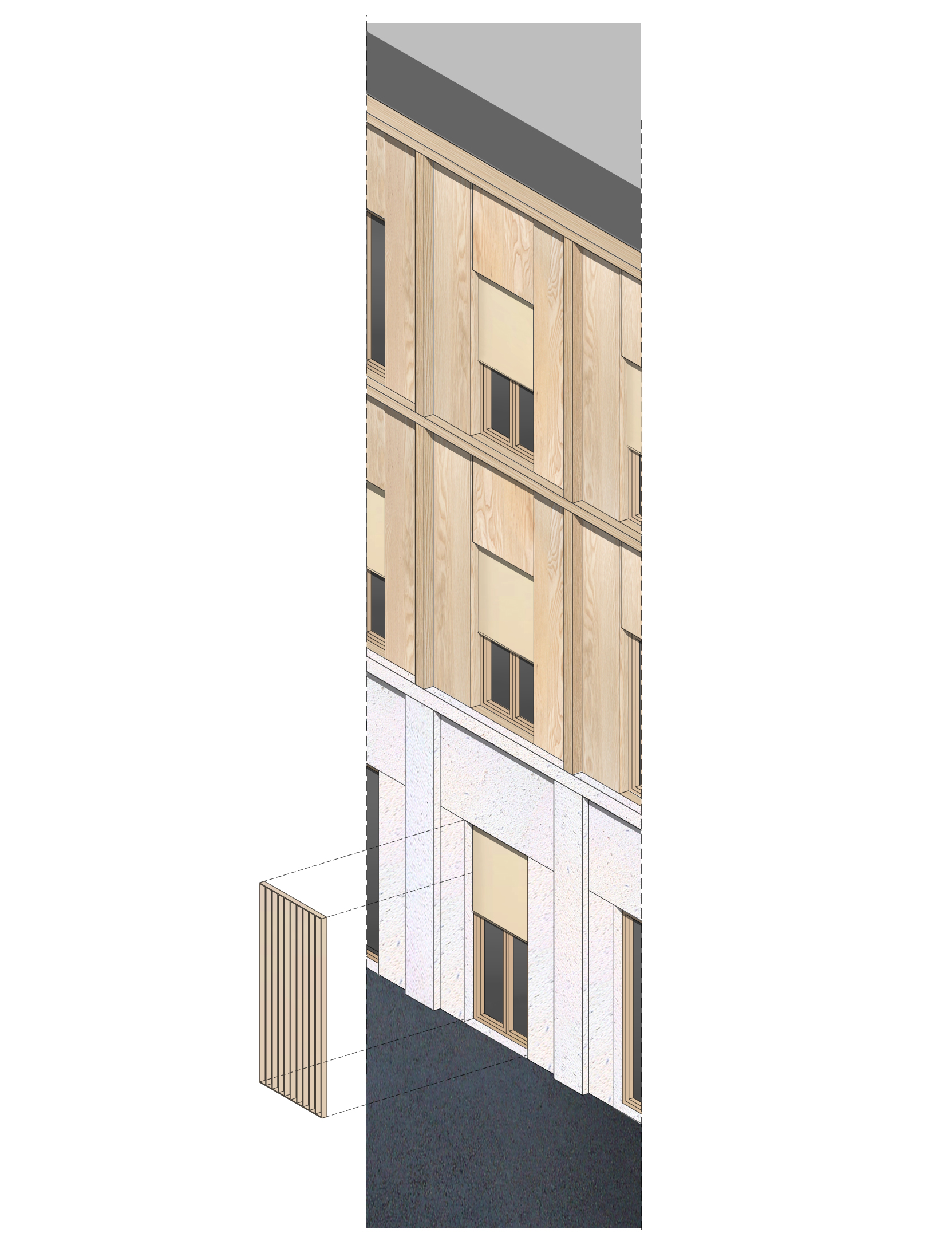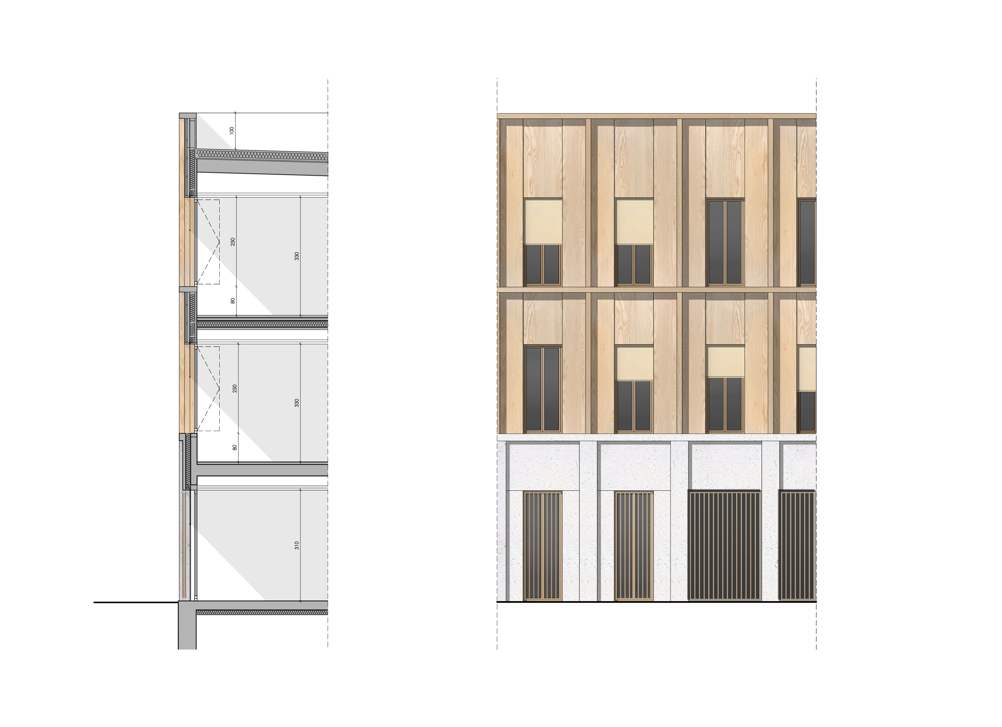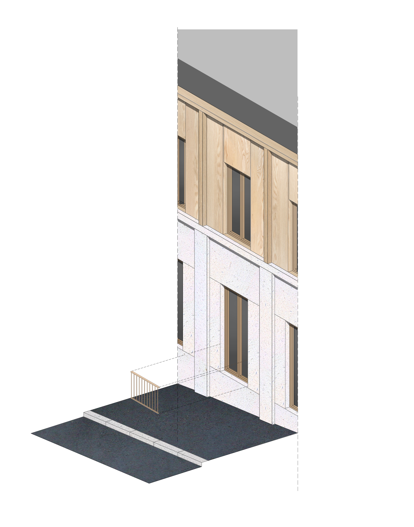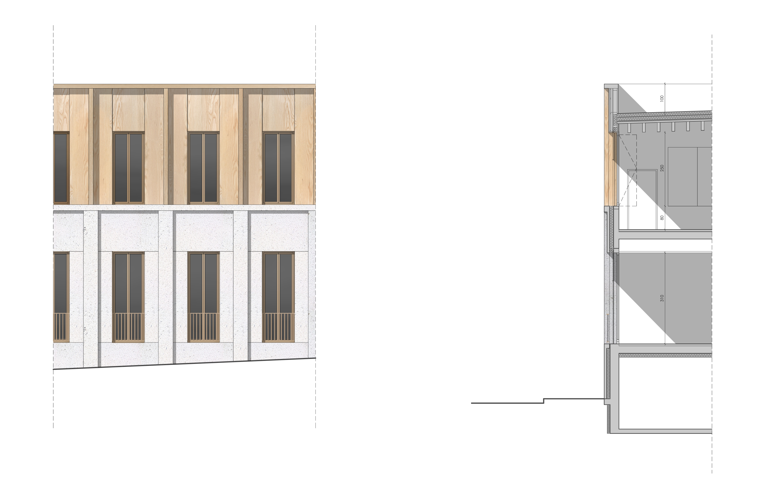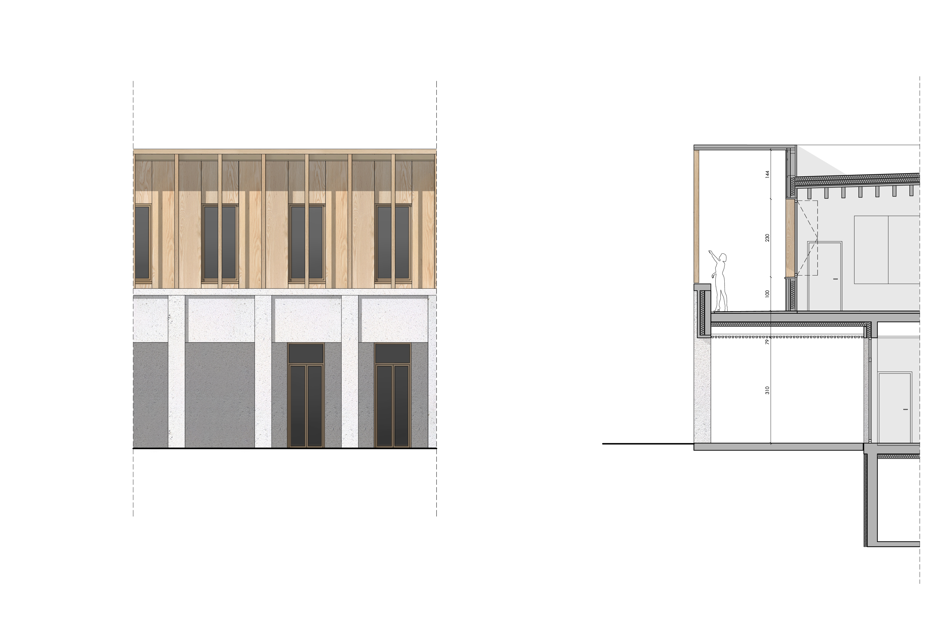 Descriptif technique : Le rez de chaussée de l'ensemble est en maçonnerie. Le bois se tient au dessus. Il s'agit de s'adapter à des différences d'usage et de les signifier. Les plans d'étage, construits en bois, reçoivent les activités d'enseignement. Le rez de chaussée de maçonnerie, reçoit toutes les activités, moins réglées, qui accompagnent l'enseignement. Mais il s'agit aussi de donner une juste mesure à l'intervention de chaque corps d'état. En ne faisant pas porter toute la charge de la réalisation au charpentier et au menuisier bois, nous savons permettre aux acteurs régionaux du bois d'être concurrentiels face aux industriels européens. PEFC (Gestion forestière durable) FSC (Gestion forestière responsable)