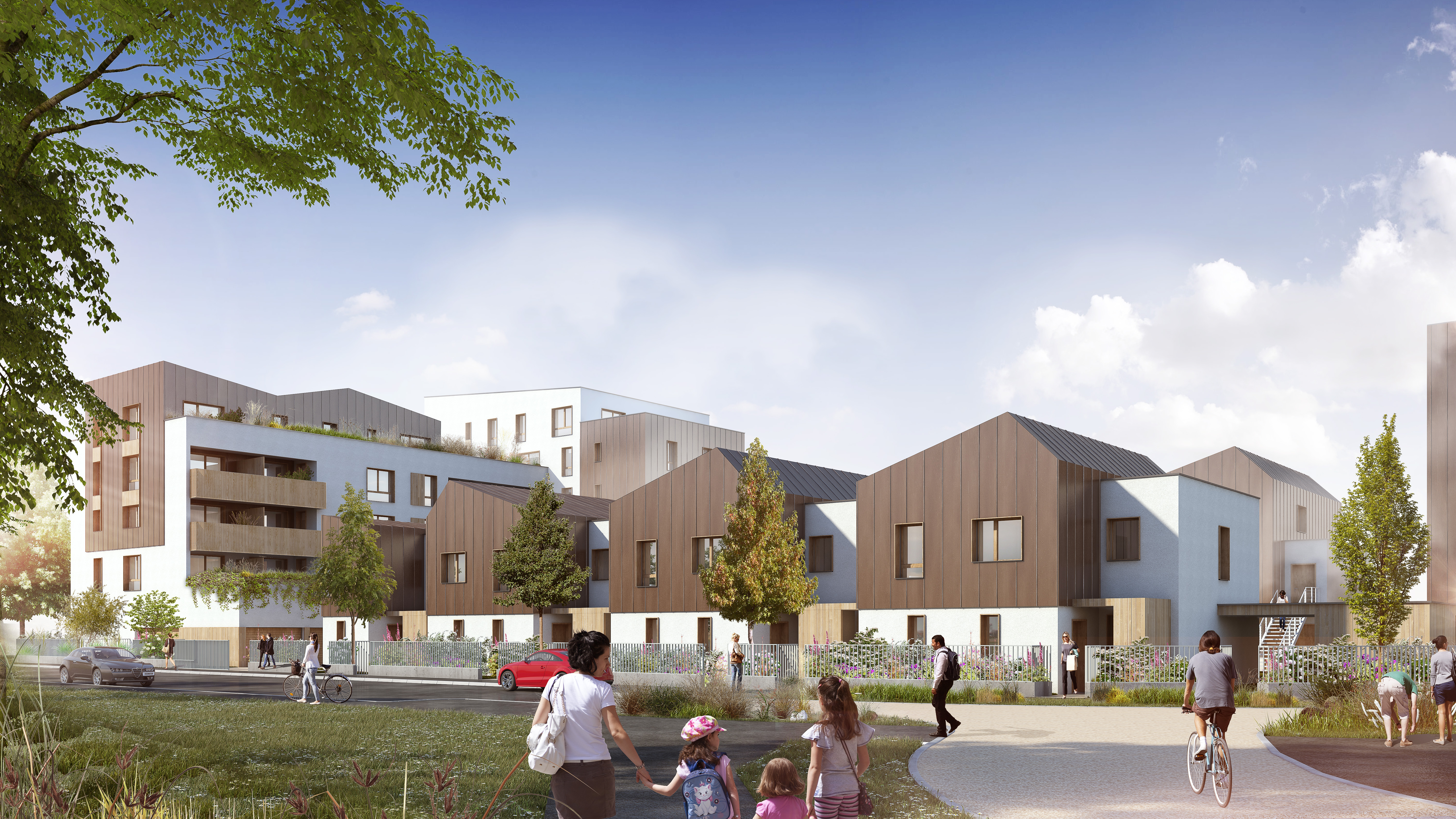 Descriptif technique : Un nouveau principe de conception développé et pratiquement figé avant-même le dépôt de permis de construire de sorte à lier les choix de techniques et les matériaux de construction avec FDES certifiée INIES, un mode de chauffage à plus de 75 % d'énergies renouvelables à l'année (géothermie sur nappe naturelle rhénane) et l'usage de la technique d'ossature bois pour les attiques et les pavillons accolés. Coût : 1 630 euros HT/m² SHAB, avec VRD PEFC (Gestion forestière durable) CTB P (Produits de traitement) Certification bas taux de formol (CARB) NF Portes résistant au feu en bois NF Contreplaqués (CTBX - CTBC) NF Fenêtres Bois et Portes Extérieures - Acotherm NF Parquets Marquage CE