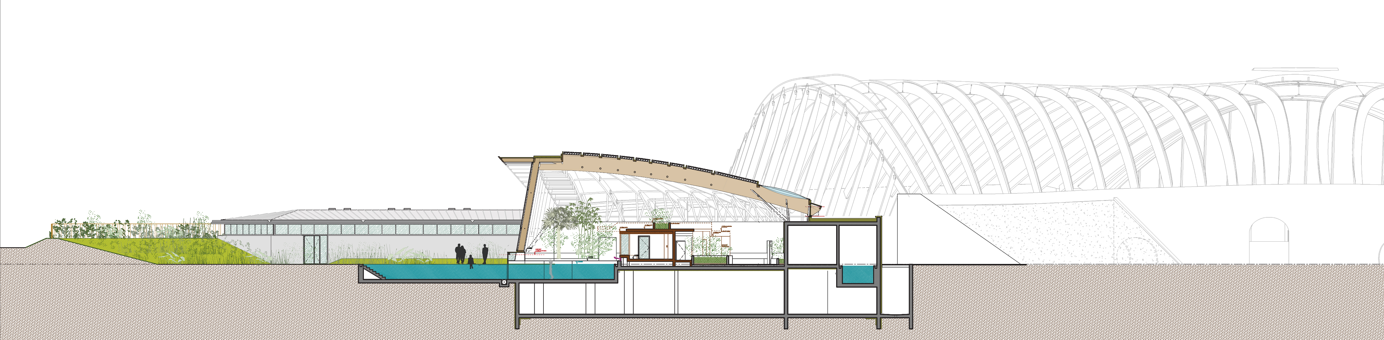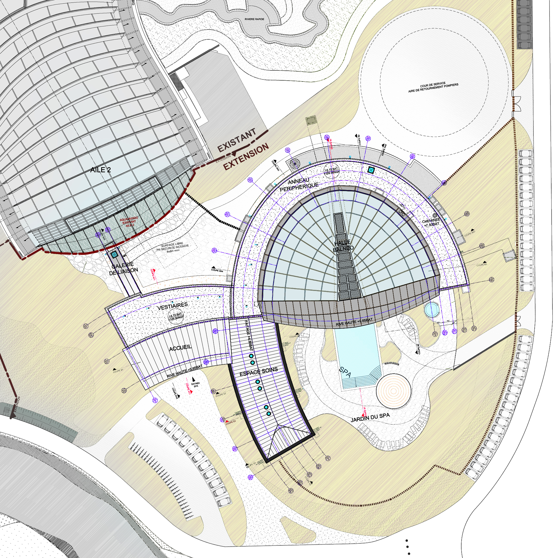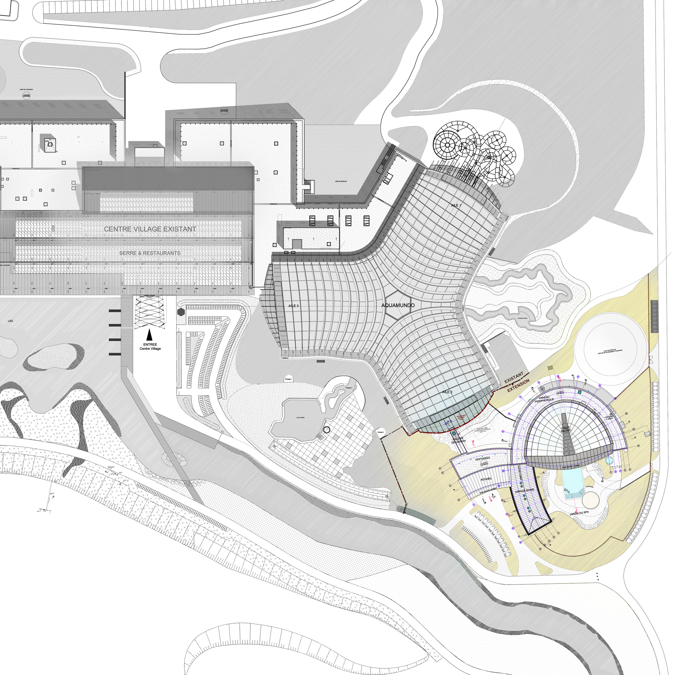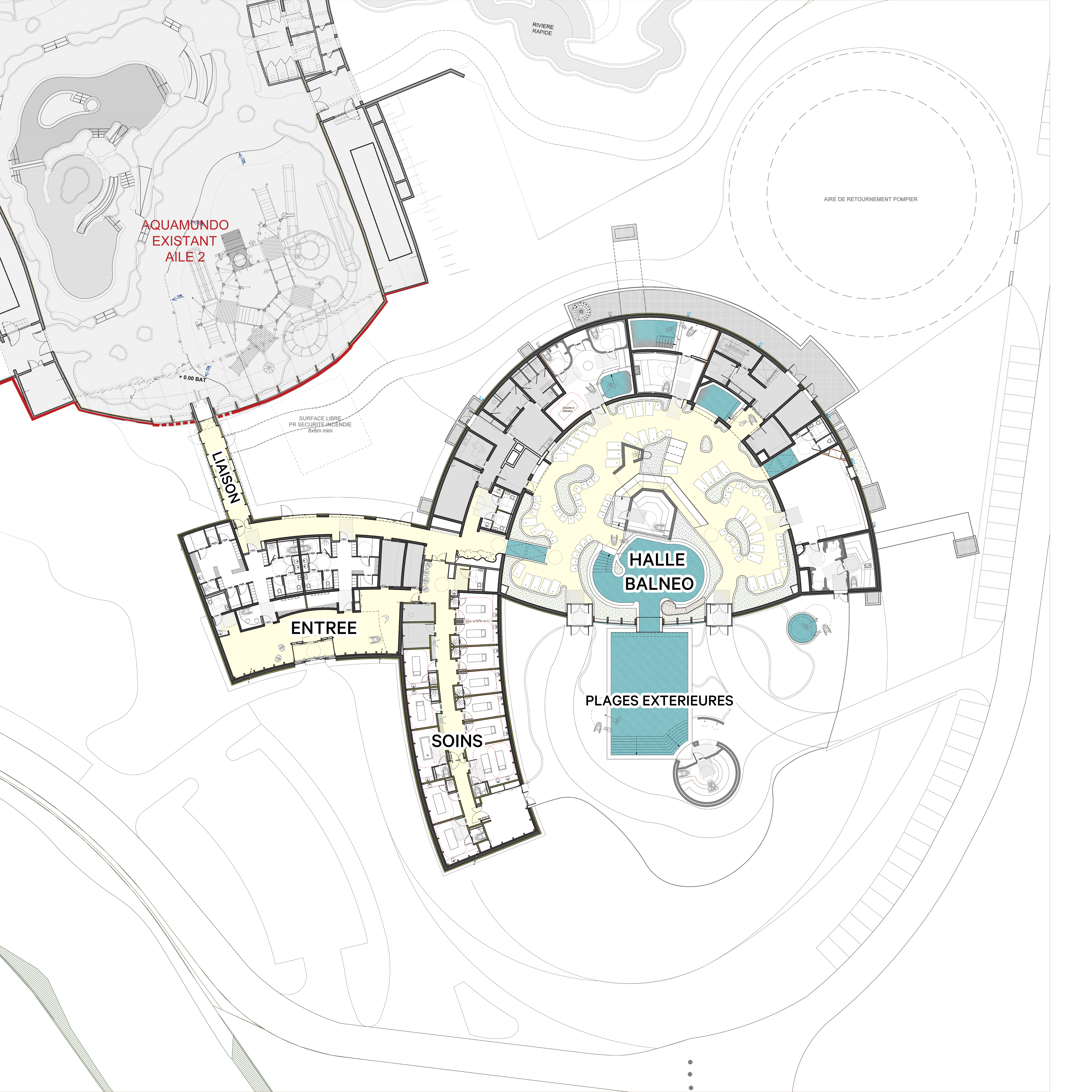 Le SPA est une extension du Center Parcs Moselle conçu par Art'Ur. - Un pavillon largement vitré et élancé, avec sa couverture aux débords généreux joue les rôles de signal d'entrée et de liaison avec l'aquamundo. - La Halle de forme demi-ovoïde aux allures de coquillage abrite des bassins et plages, est éclairée par sa grande façade courbe vitrée au sud. Un talus périphérique en anneau forme une enceinte protectrice à l'établissement, ses bassins et espaces extérieurs . - Les espaces soins, intimes, sont à demi enterrés dans ce talus. La SDP de 1658m² correspond à un clos couvert de 3098 m²
