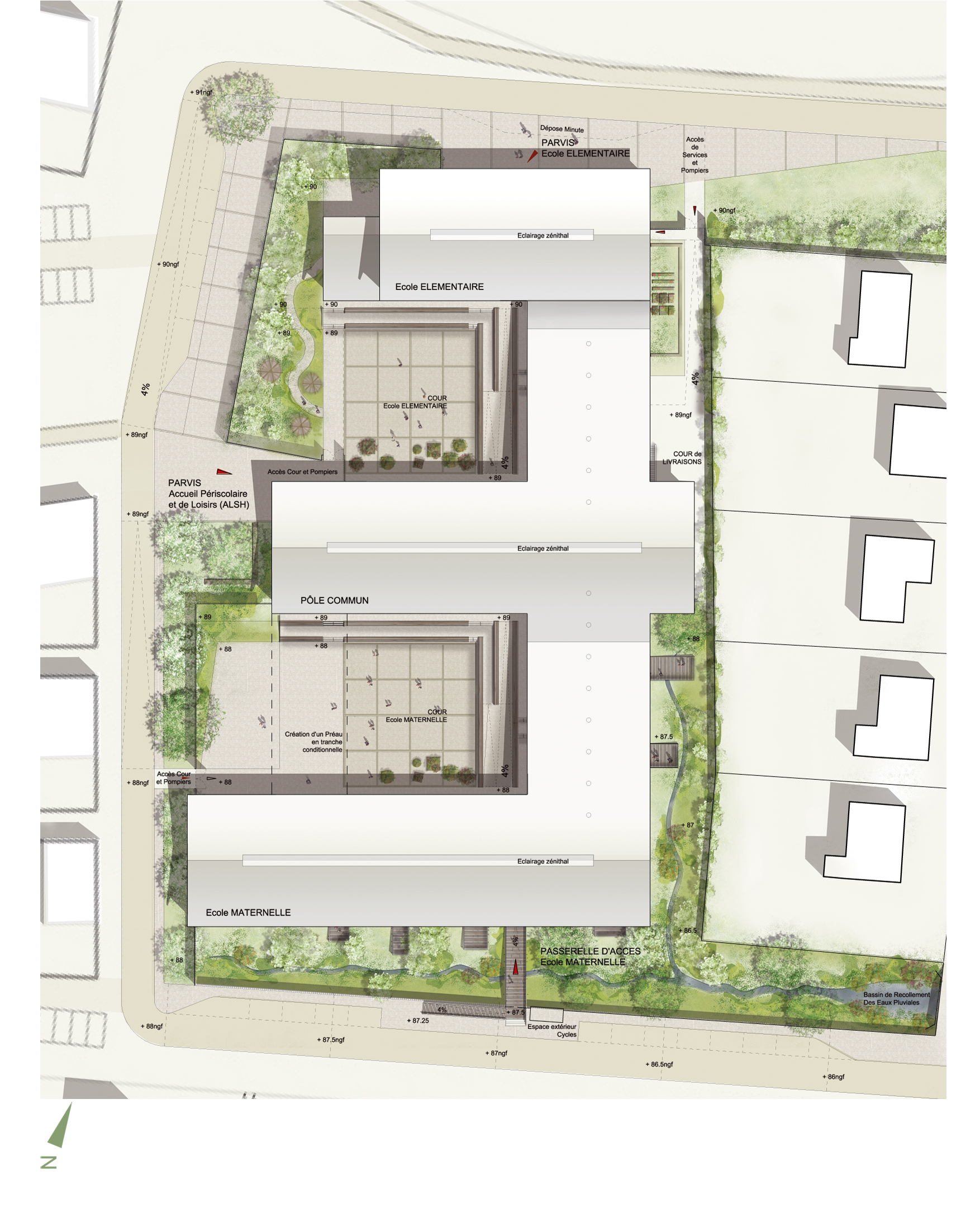 Approche environnementale : Lumière naturelle au cœur des espaces (sheds dans circulations pour second jour des salles) avec maîtrise des orientations solaires (pour éviter surchauffe). Conception rigoureuse de l'enveloppe (forte inertie de masse et haute performance isolante) isolants boisourcés Protection des bardages et réduction des apports solaires d'été par débords de toitures généreux. Respect du terrain naturel par terrasses successives. Gestion des eaux de pluies avec noues paysagères favorisant la biosphère. Production de chaleur par géothermie verticale + PAC / traitement d'air double flux / ECS Solaire