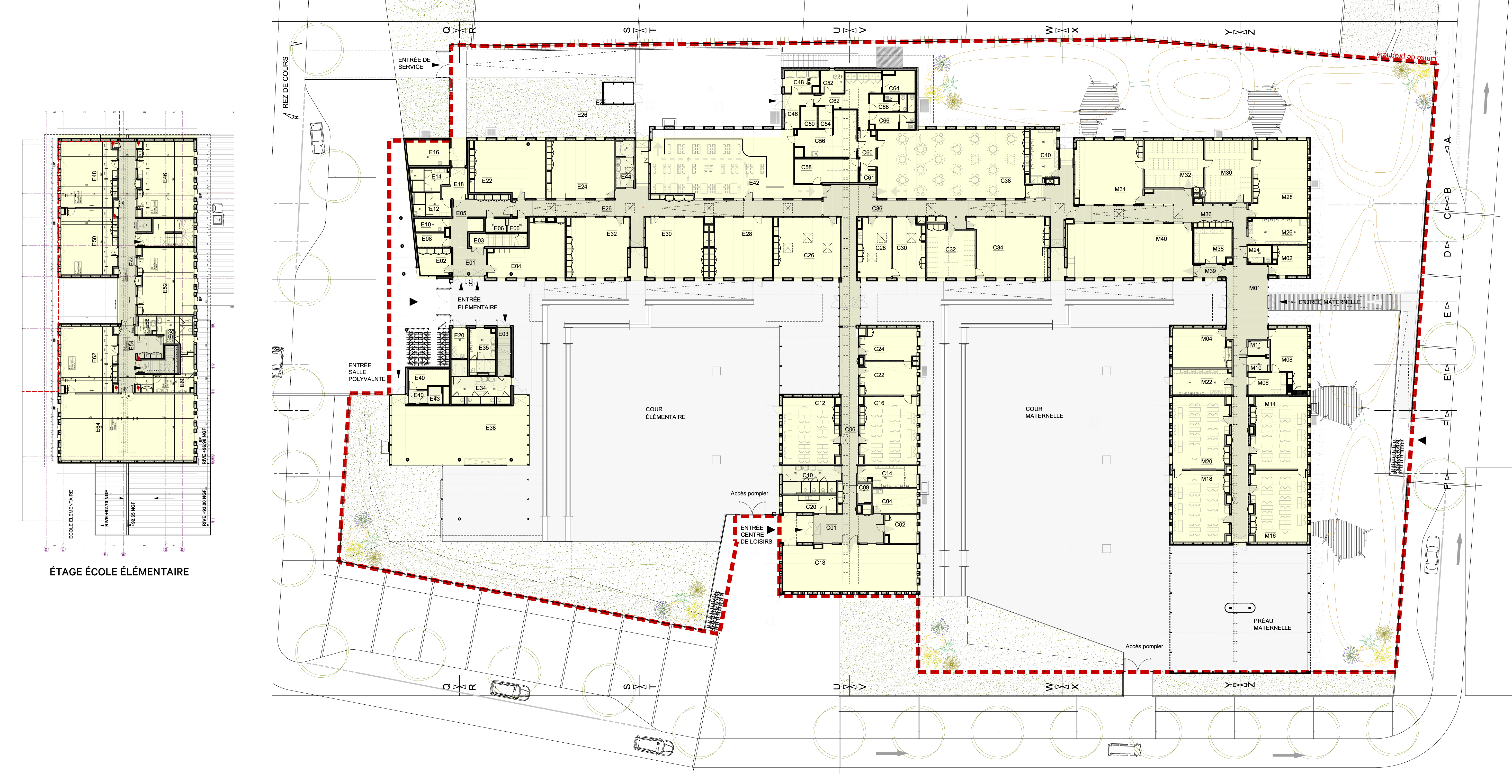 Descriptif technique : Construire a été possible dans les budgets et temps impartis grâce à des procédés constructifs préfabriqués et tramés: limiter in situ la prestation du gros œuvre aux ouvrages enterrés, à la dalle de plancher de l'école élémentaire, aux cages d’escalier et d'ascenseur. pré fabriquer en temps masqué toutes les structures bois jusqu’au clos couvert. Assurer un montage par tranches verticales qui assure à l’avancement l’étanchéité à l’eau et à l’air, rendant disponible ainsi le chantier aux corps d’état secondaires.