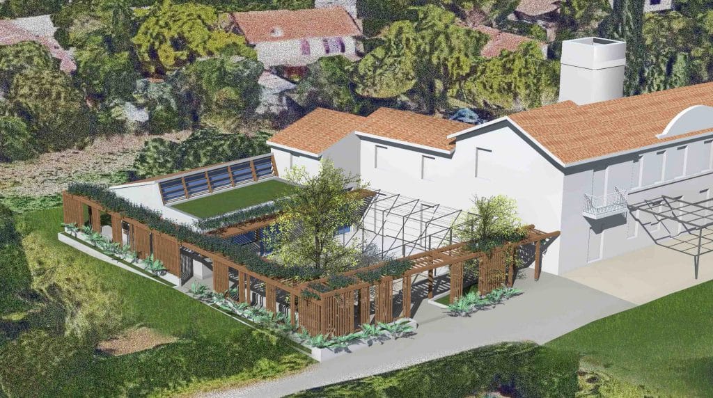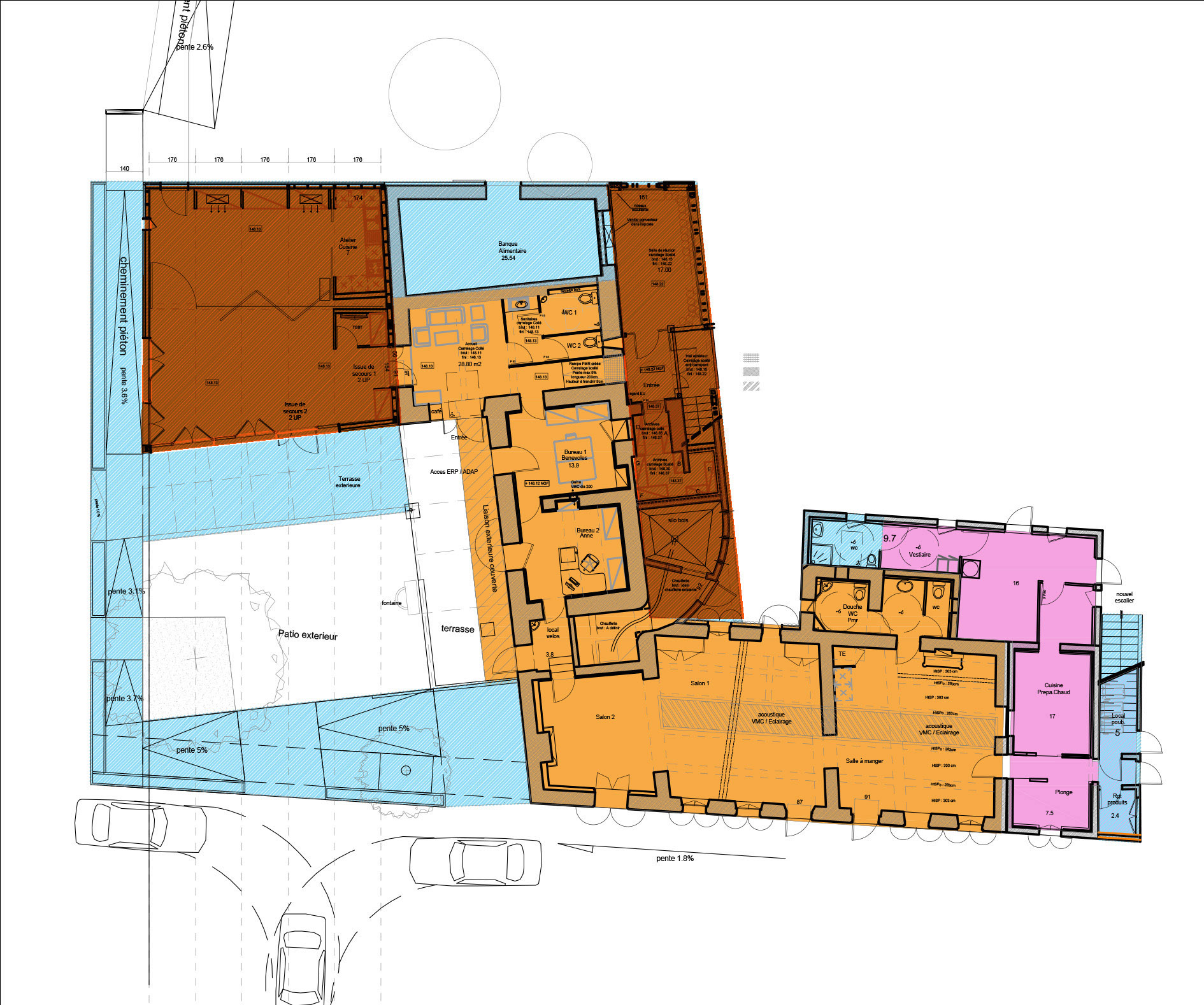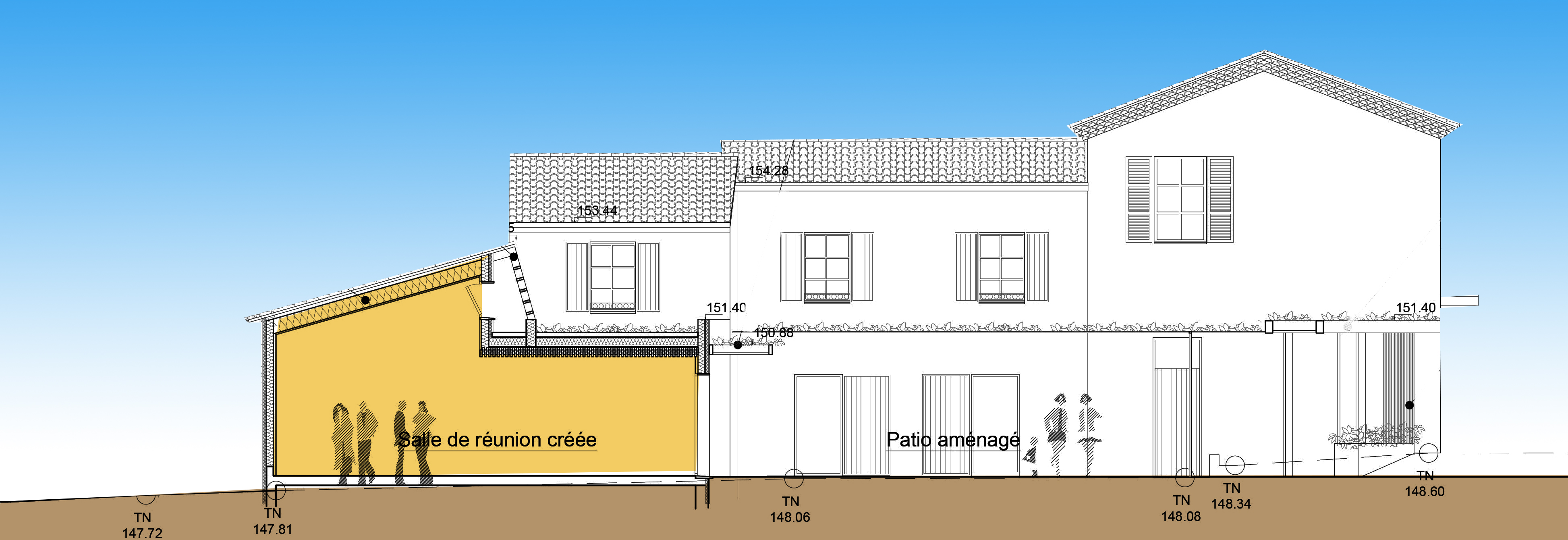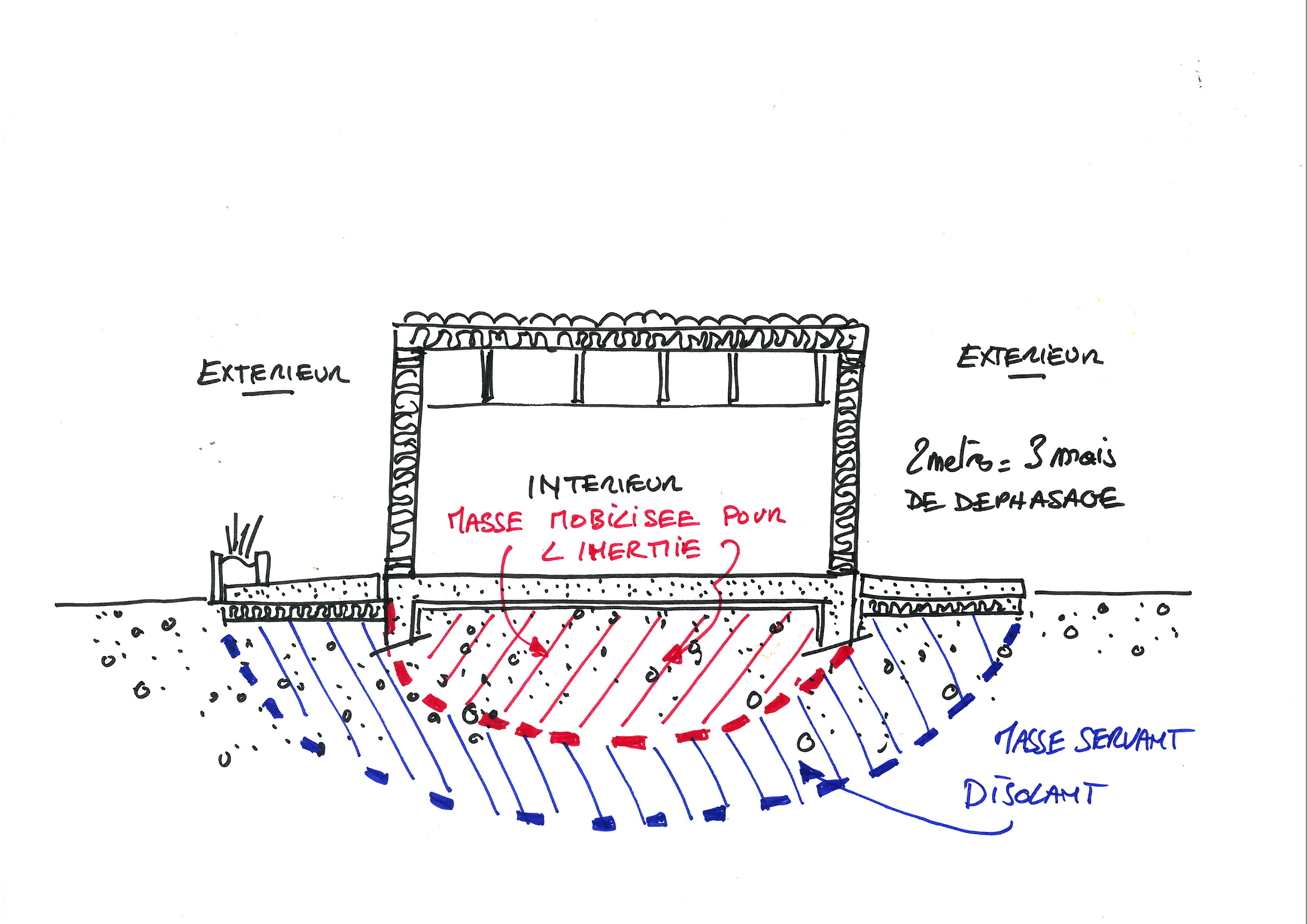 Descriptif technique : Le bâtiment, est équipé d'un système de rafraîchissement adiabatique et joue sur la ventilation naturelle nocturne. L'une des extensions innove par la mise en place d'un système d'inertie déportée qui marche à merveille.la salle profite de l'inertie du sol d'une saison à l'autre. Les granulés de bois ont remplace le gaz pour le chauffage grâce a une nouvelle chaudière. Les systèmes sont réduits, au maximum passifs et facile d'entretien. Un travail de performances sur l'enveloppe accompagne ces choix.