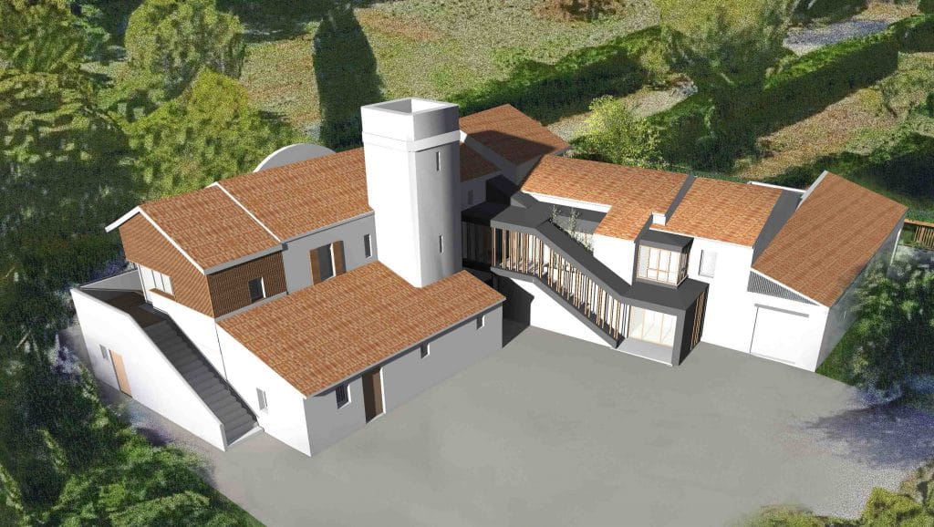 Approche environnementale : Approche bioclimatique du bâtiment, utilisation de matériaux bio-sourcés et de solutions passives et low tech pour un projet de rénovation et de restructuration, sont les maîtres mots de ce projet le plus confortable et écologique possible : Utilisation du bois en structure et en isolant pour les extensions, peinture naturelle à base d'algues, chanvre et chaux pour la rénovation, approche bioclimatique d'ensemble, intégration forte du végétal dans le projet et attention au confort d’été sont les marqueurs de ce lieu de vie. le bâtiment est BDM OR en conception et réalisation