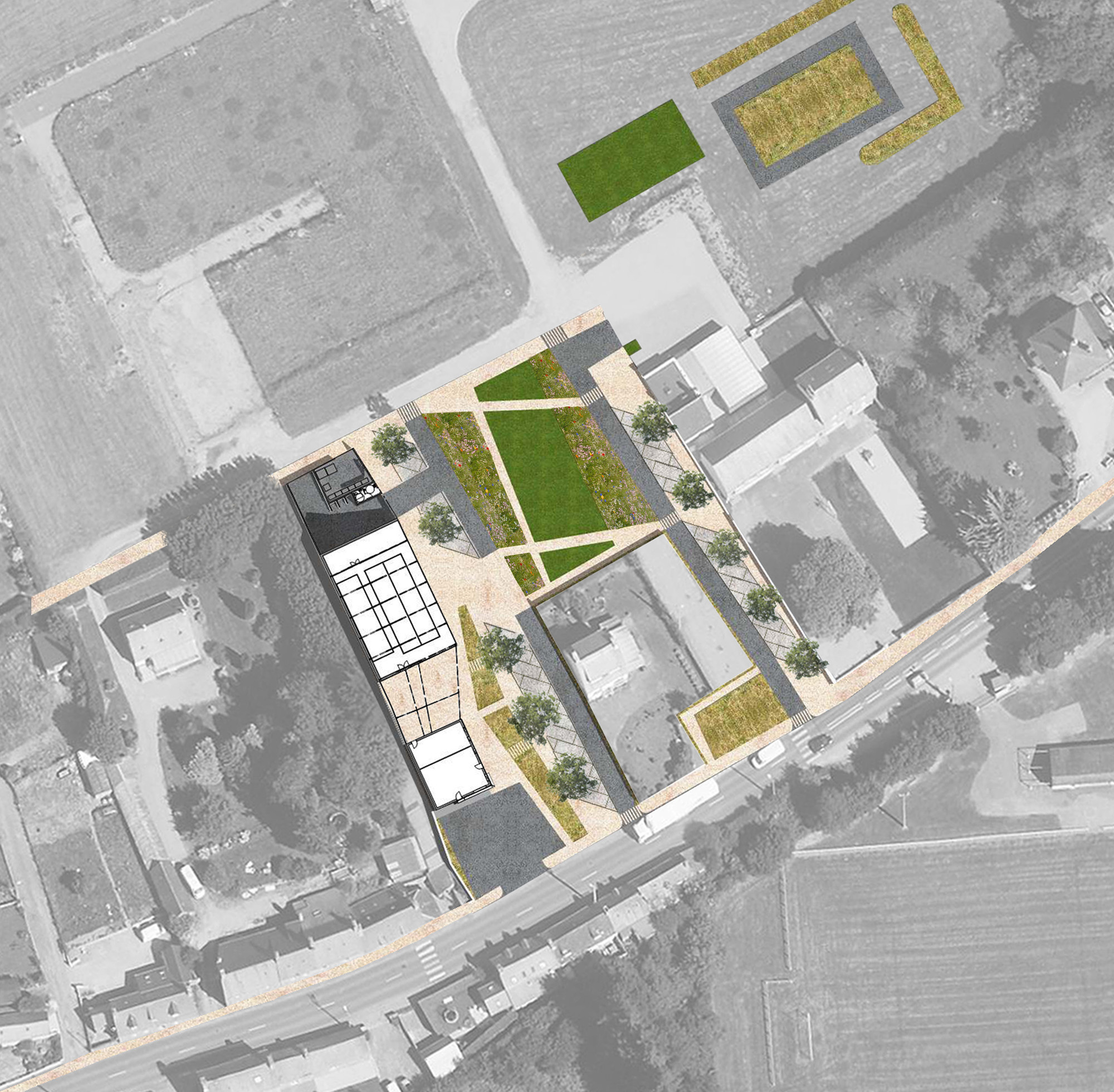 Le projet d’origine nécessitant un boulodrome pour les associations est l’occasion d’une plus large réflexion sur l’aménagement de ses abords et pose la question de l’intégration de l’existant dans la transformation du site. Après démolition, le parti-pris du projet est de libérer au mieux l’espace et d’intégrer l’épicerie/bibliothèque dans un équipement polyvalent.