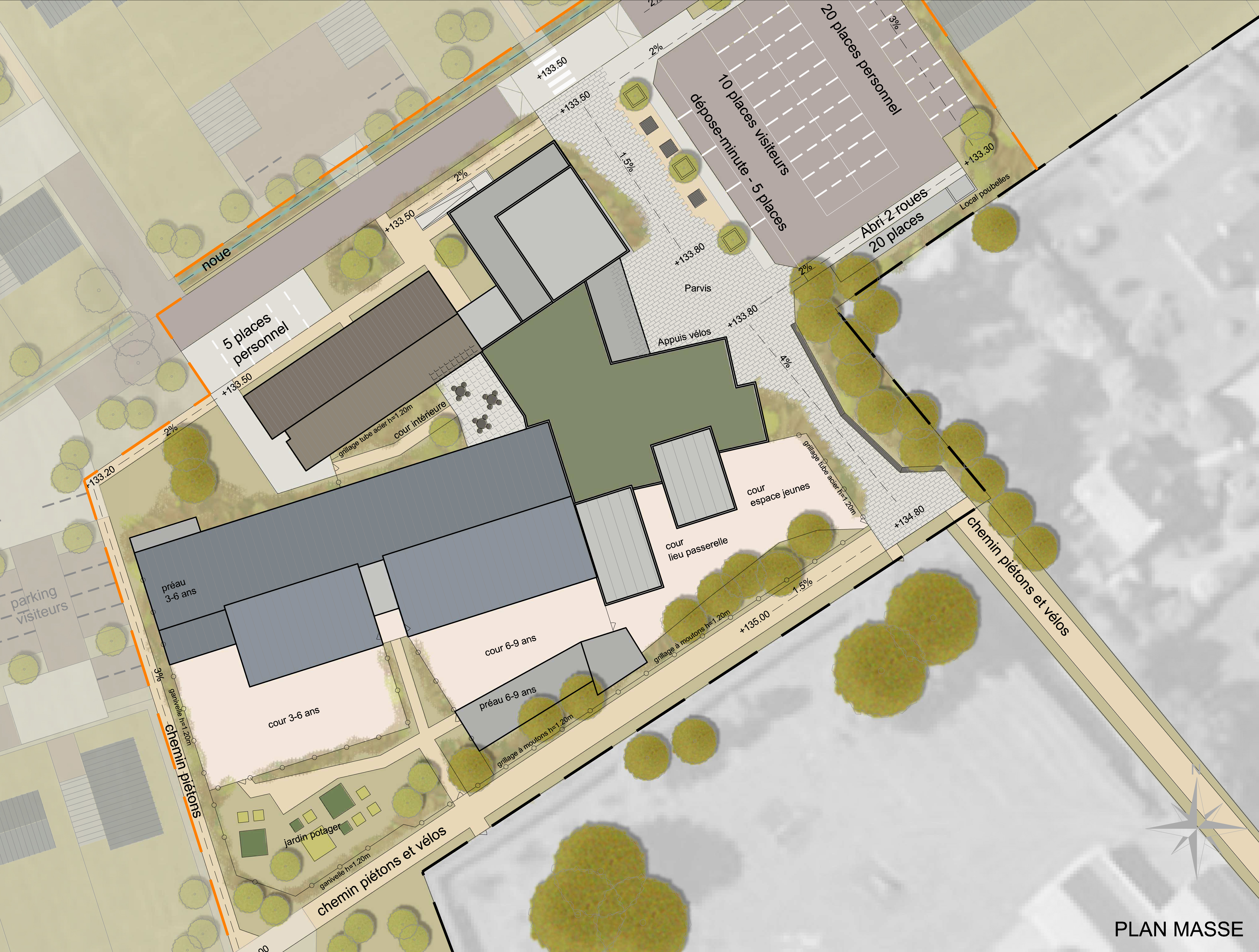 La construction de la Maison de l'Enfance et des Services s’inscrit dans une démarche forte de performance énergétique et environnementale. Cette ambition a guidé notre équipe très en amont du projet, tant dans la définition de l'aménagement de la parcelle que dans les grandes lignes du parti architectural. Pour la pertinence du projet, nous avons cherché, par une conception judicieuse des systèmes constructifs et des équipements techniques, à préserver les ressources naturelles, à maîtriser les impacts sur l’environnement et à créer des ambiances intérieures confortables et saines.
