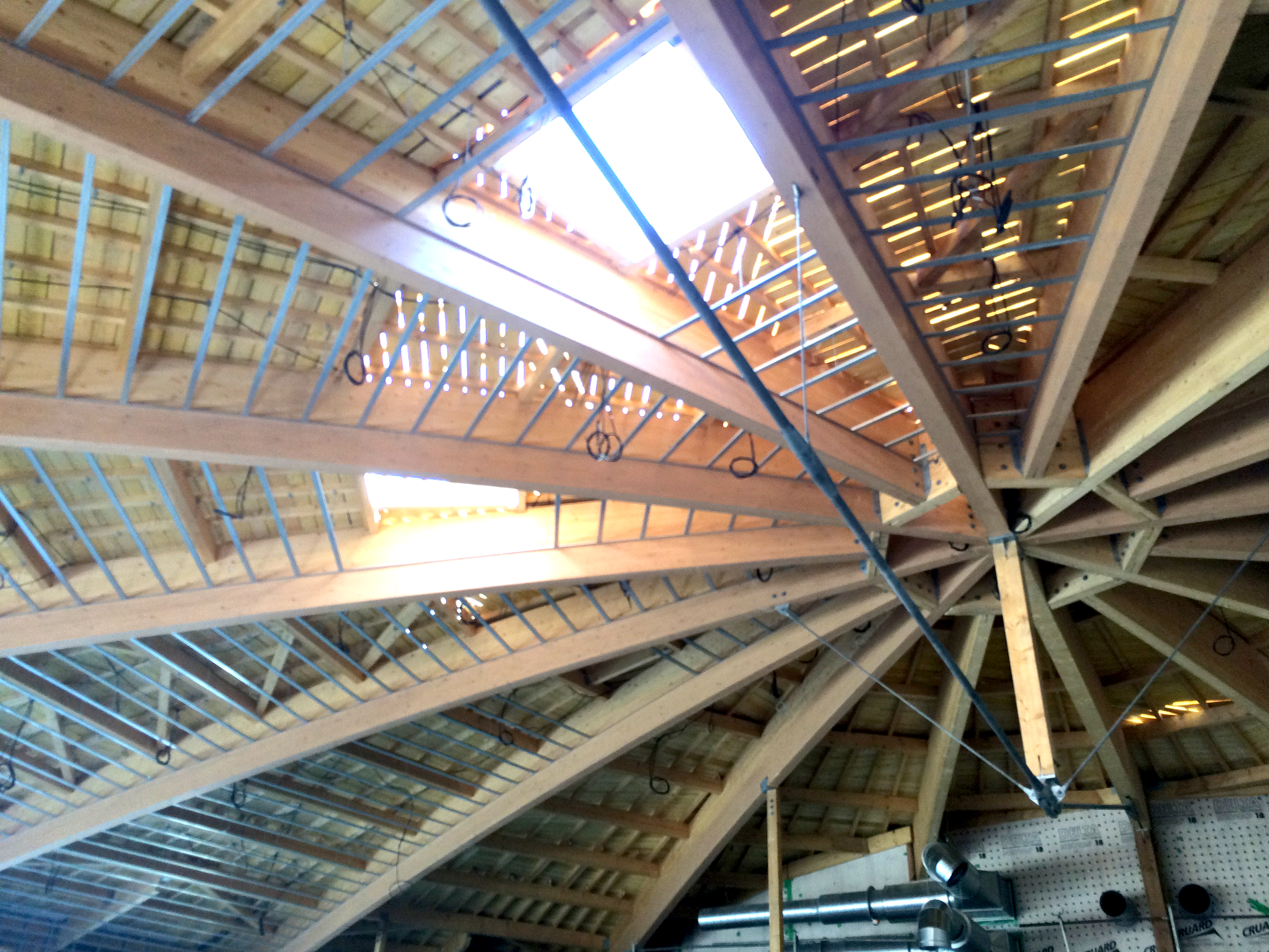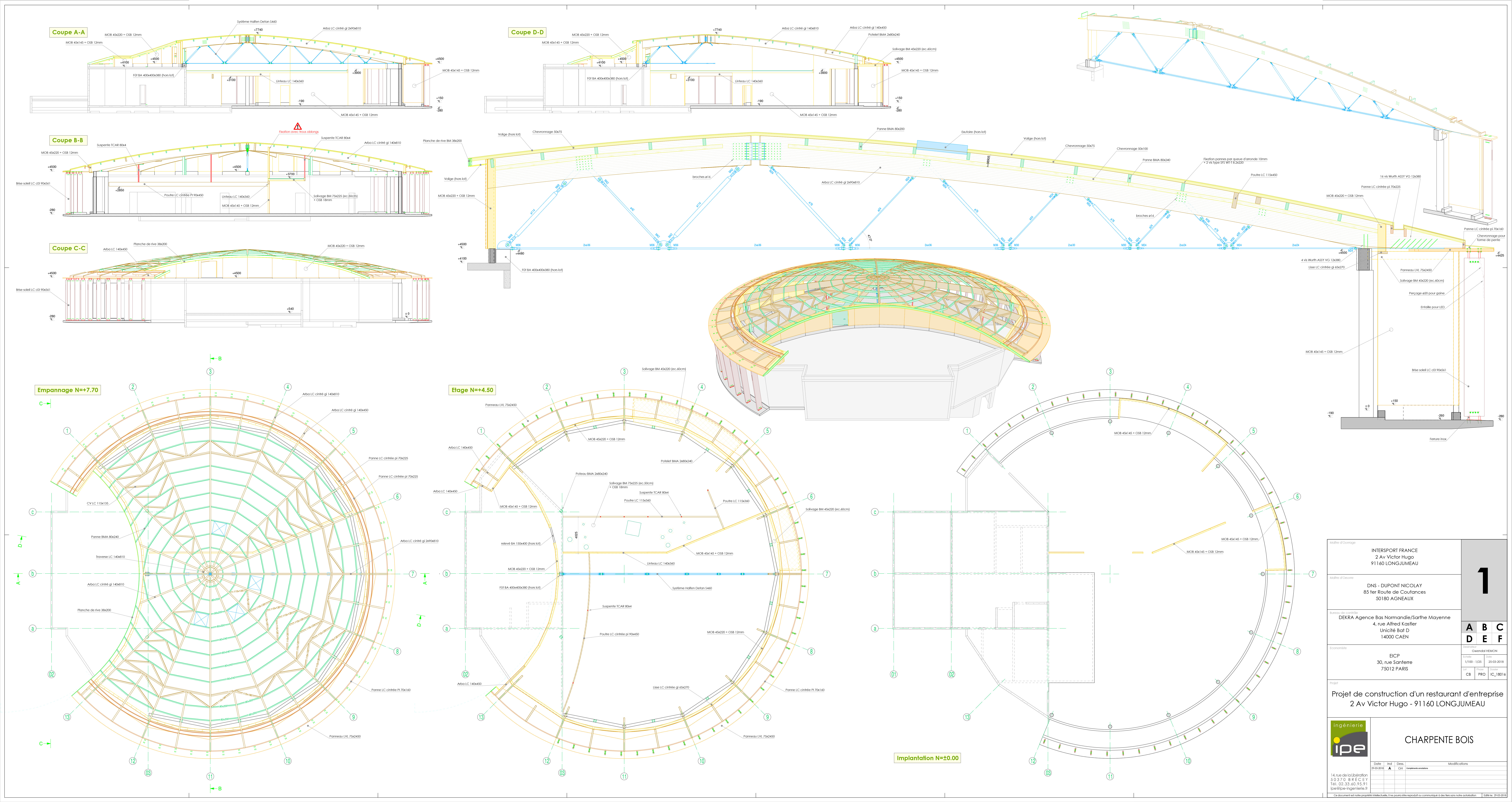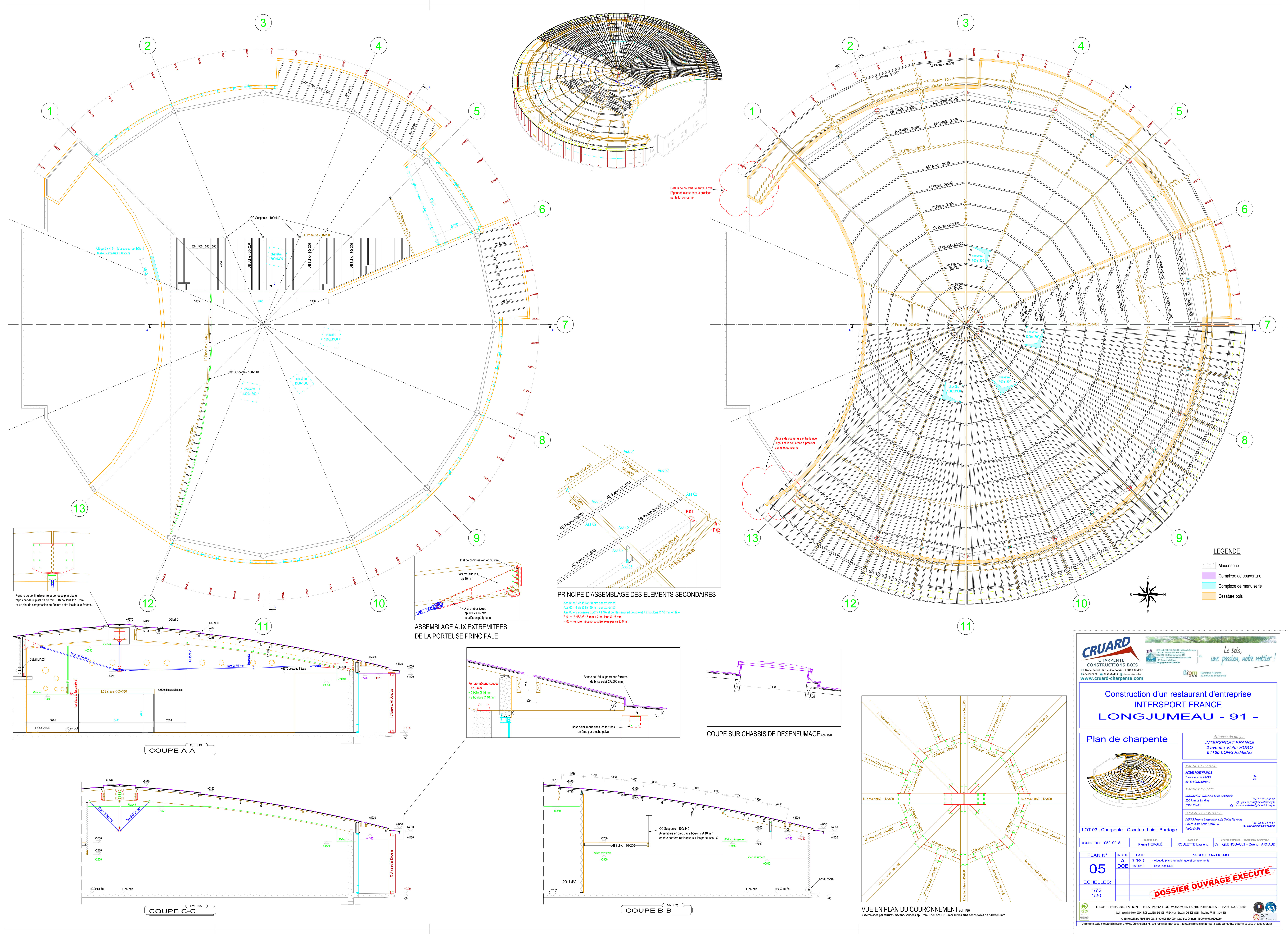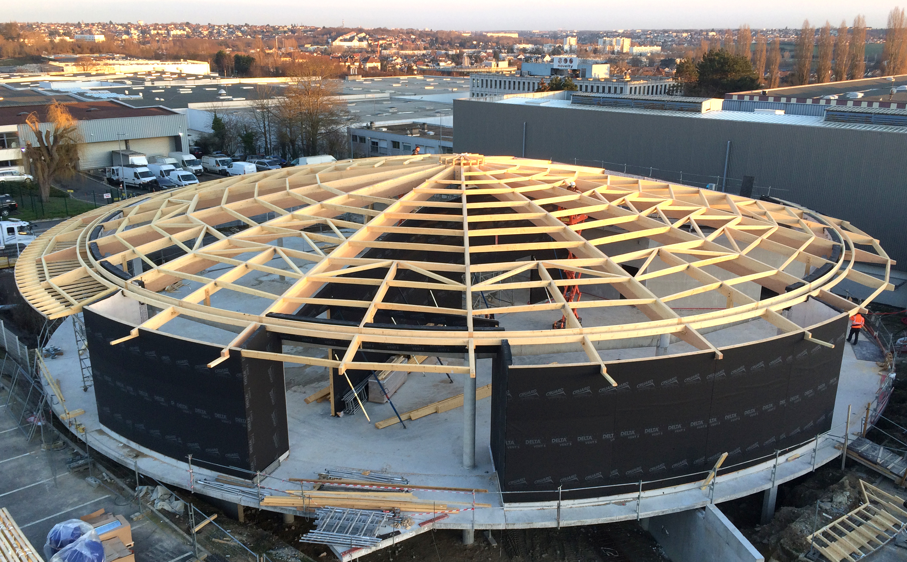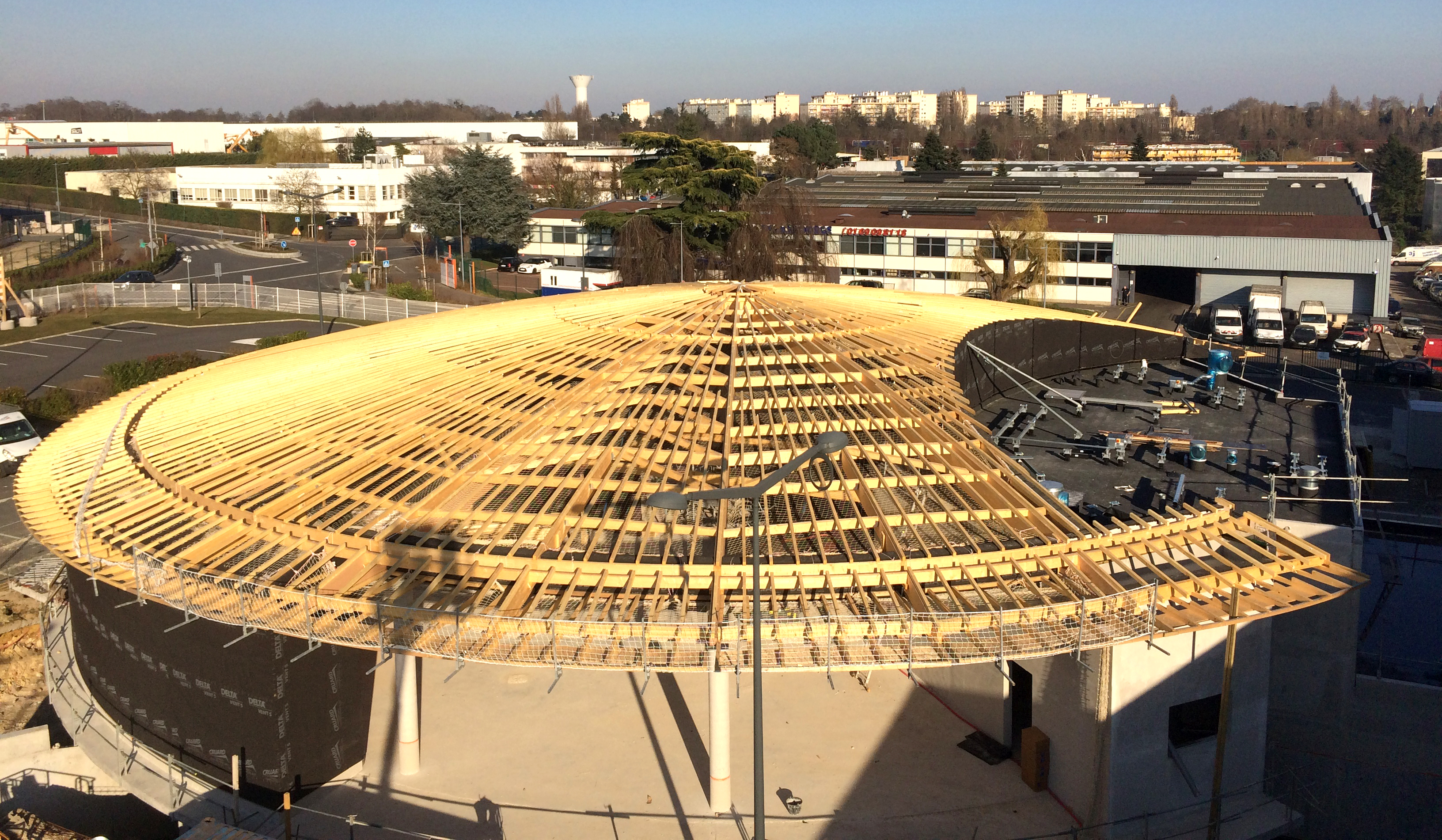 Descriptif technique de l'aménagement : La structure de la charpente est obtenue par la mise en place de poutres cintrées rayonnantes en lamellé collé. Les 12 poutres qui composent la coupole sont assemblées sur une poutre maitresse sous tendue mixte (bois/acier) Les poutres principales sont débordantes et amincies et permettent de créer le porte à faux important en rive. L’ensemble des pannes sont chantournées pour assurer au dôme un aspect parfaitement sphérique. Le montage a été effectué depuis le noyau central mis en place provisoirement sur une tour d’étaiement. Les 12 poutres principales rayonnantes ont été ensuite assemblées.