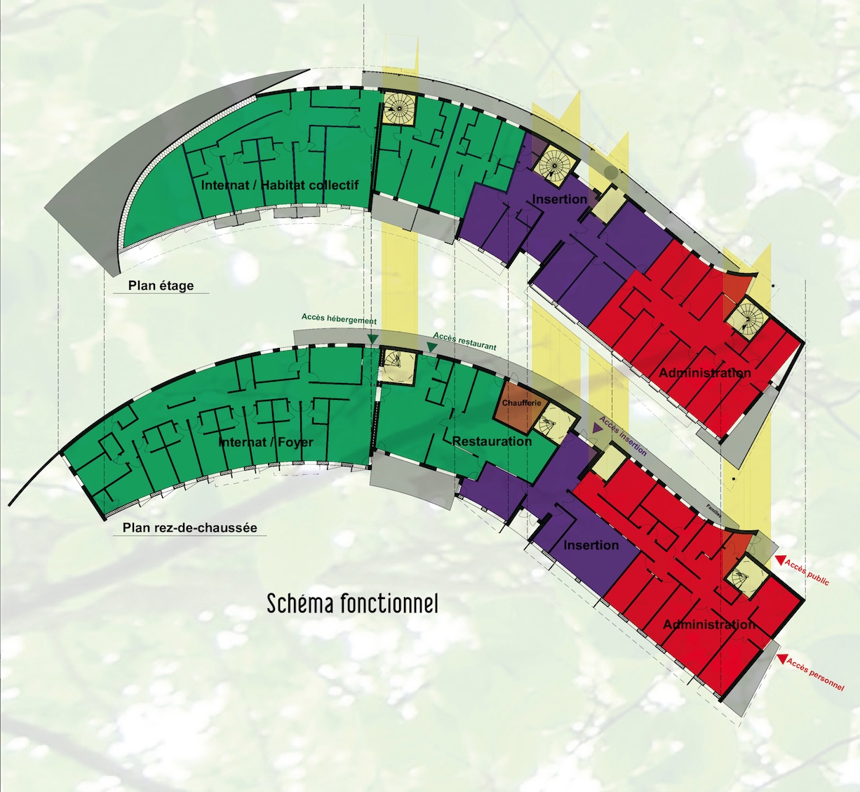 Le bâtiment est conçu pour être un outil de travail performant ayant pour objet d'accueillir des jeunes mineurs placés par la PJJ. Dans un espace arboré conservé, il propose un lieu de vie serein pour les jeunes, structuré autour d'un jardin intérieur clos bienveillant. Les locaux sont majoritairement orientés au sud, vers le jardin. La façade en bardage bois horizontal panaché concourt à l'insertion du bâtiment dans cette ambiance de nature. Les ouvertures de la façade sud à ossature bois peuvent être facilement modifiées pour répondre aux éventuels nouveaux besoins fonctionnels du bâtiment.