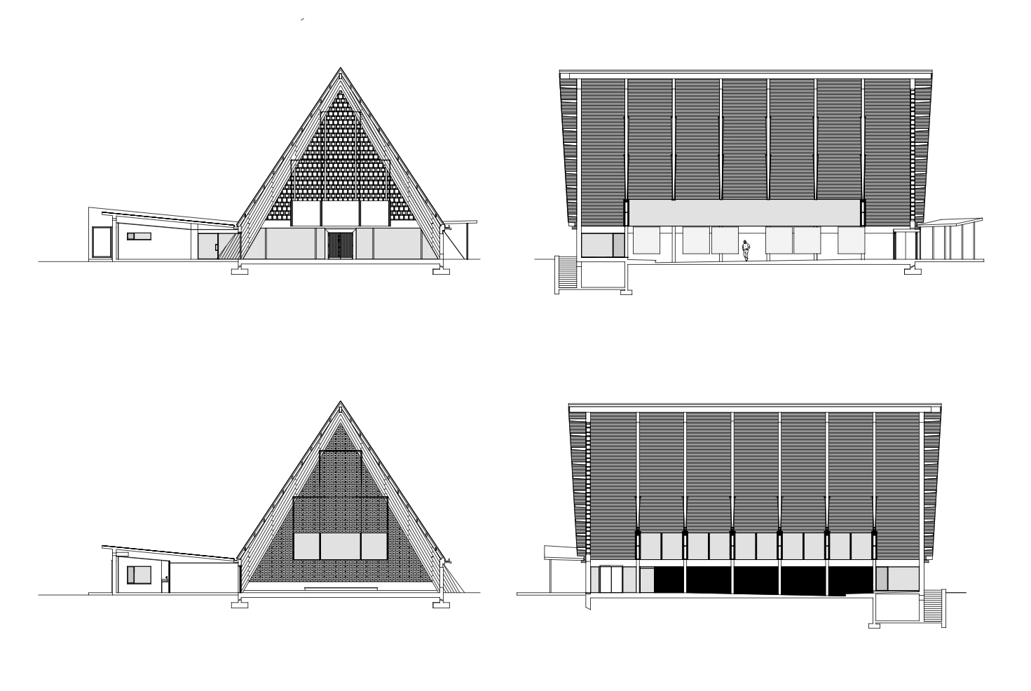 Approche environnementale : L'objectif est avant tout à s'inscrire dans la continuité de la démarche de conception d'origine. En effet ce bâtiment de la fin des années cinquante est une véritable leçon de mise en oeuvre low-tech, de matériaux sourcés avant l'heure. En effet un travail de recherche nous démontre que l'ensemble des bois (coffrage coulissant y compris), briques et jusqu'aux ardoises de la couverture proviennent de communes comprisent dans un rayon de moins de cent kilomètres. Ainsi l'ossature suspendue de sapin et de toile que nous introduisons valorise des filières françaises les plus courtes possible.