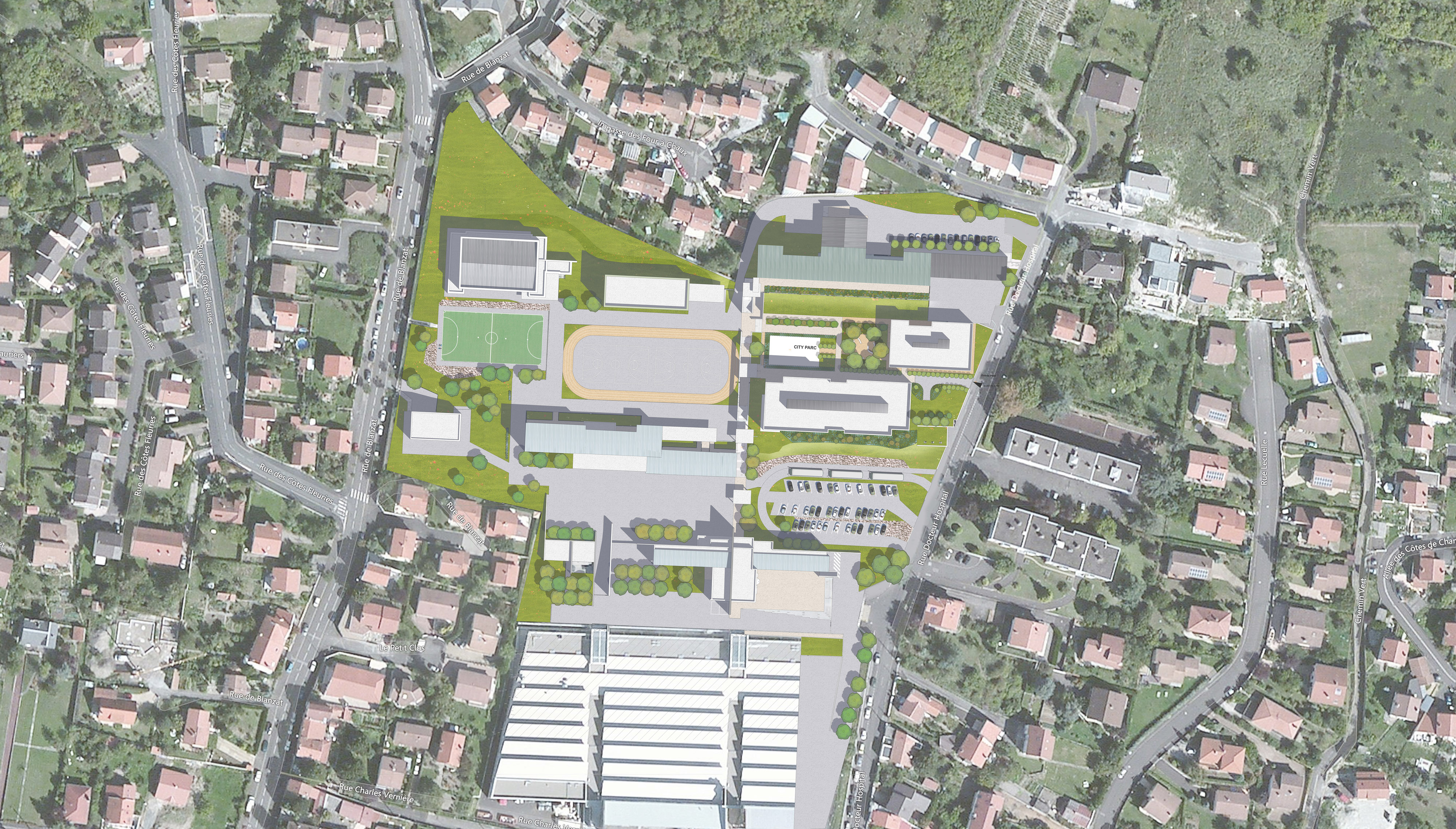 Réalisation de deux bâtiments à R+2 et R+1 abritant d'une part l'internat hebergement indépendant comportant 37 lits et 2 chambres d'isolement et d'autre part l'iternat comportant 5 unité de 37 lits. Les unités sont formées de 6 chambres comportant 2x3 lits et d'une chambre accessible aux PMR ainsi qu'une chambre dédiée au maître d'internat. Le RDC du bâtiment principal abrite les locaux communs, soit l'accueil, les foyers et les salles d'études. La structure des constructions est mixte béton béton et poteau poutre bois/métal avec des façade porteuses préfabriquées en bois.