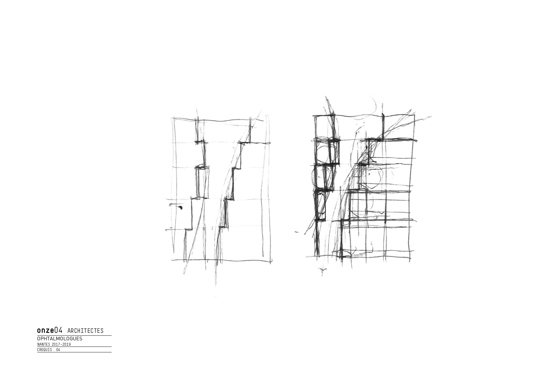 Le local s’étend sur toute l’épaisseur du bâtiment et ses proportions sont très étirées. La façade principale sur le boulevard est entièrement vitrée, mais en revanche, la façade Sud dispose de peu de linéaires de vitrage. La porte principale d’accès du local est déjà déterminée en amont par le projet du bâtiment et elle est positionnée sur le coté opposé des ouvertures de la façade Sud. Le projet propose de générer un espace central en diagonale qui relie les deux façades, et dont l’objectif principal est de permettre la meilleure diffusion de la lumière possible. Cette diagonale accueille l’accueil et le secrétariat, les espaces communs d’attente et les accès aux sas qui mènent aux unités de consultation.