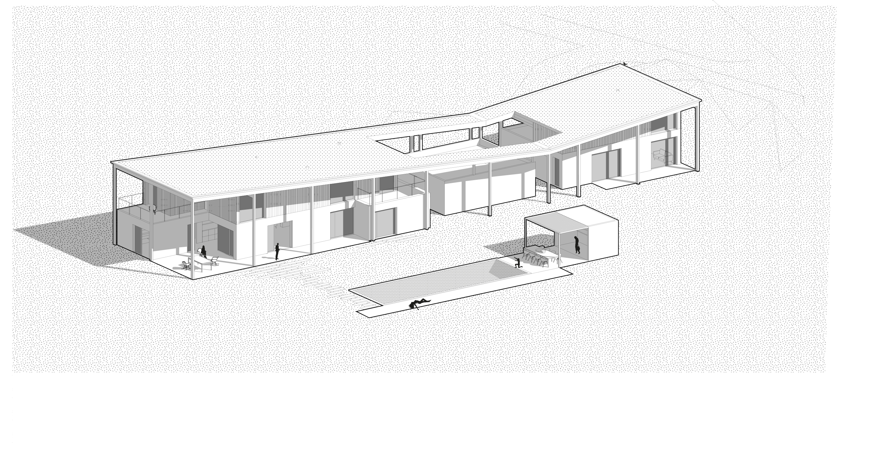 Le parti architectural consiste à proposer une grande toiture simple et homogène capable d’unifier tout en distinguant les différents composants du programme ; une "figure capable" à l’échelle du site qui abrite les deux maisons et leurs évolutions futures. L’imaginaire évoquée est celui d’un abri protecteur, d’un « toit commun » pour l’ensemble de cette famille (trois générations sous le même toit). La fructueuse ambiguïté du projet réside dans le dialogue entre cette figure hors d’échelle de la toiture et le fractionnement libre des volumes qu’elle abrite renvoyant explicitement à une échelle domestique. La relation entre l’intérieur et l’extérieur cherche ici une expression singulière par le jeu de volumes simples (empilement, juxtaposition, décalage) capables de créer des situations et des espaces libres.