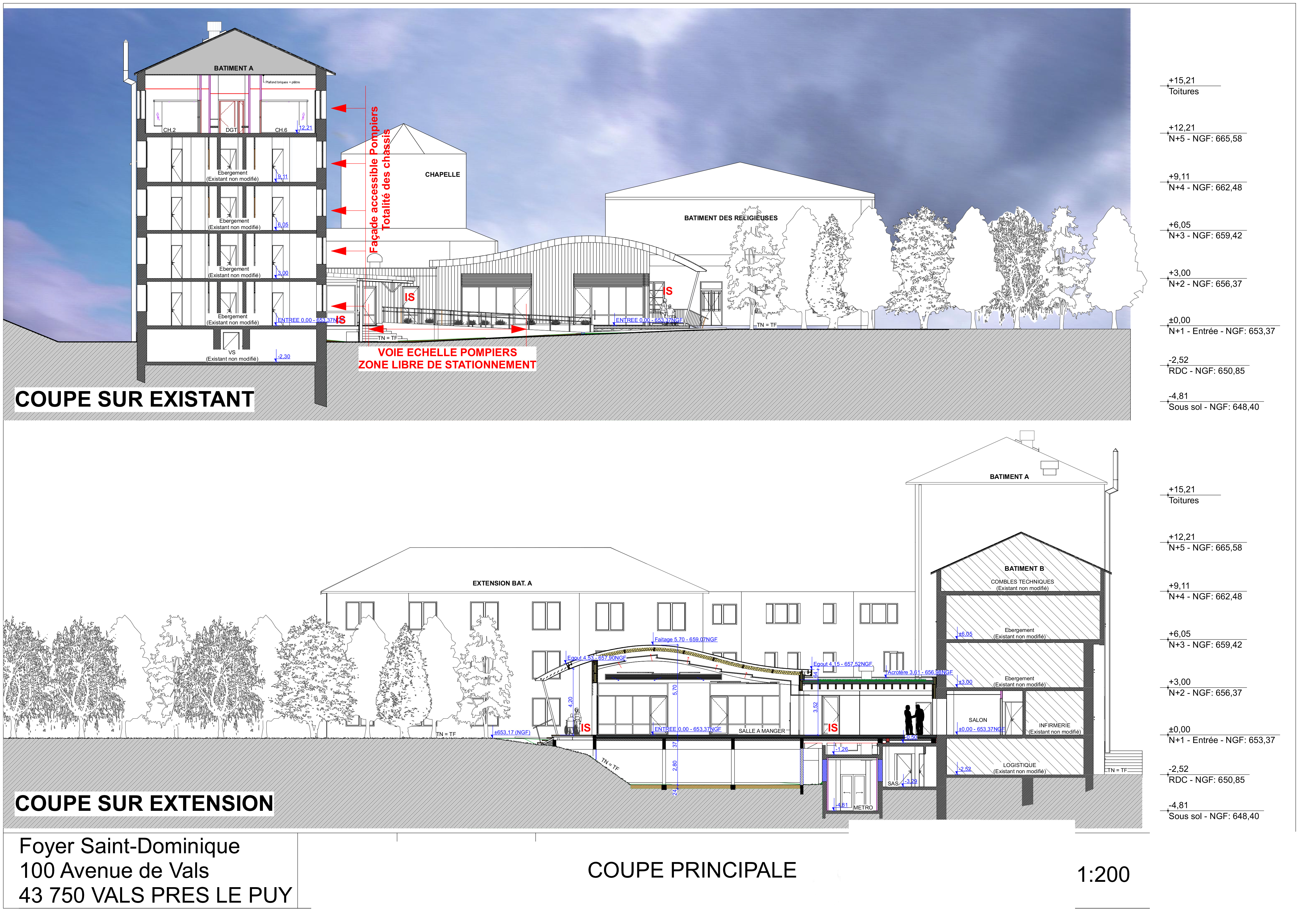 Descriptif technique : Le bâtiment reçoit une couverture en zinc (pente 70%), cette disposition engendrant de fait un plénum important permettant de recevoir les éléments techniques liés aux installations existantes et nouvellement crées. L’accès à ces studios, complétement indépendant du reste de la construction existante se fait par un escalier métallique créé au Sud de la propriété reliant directement le 2ème étage au RDC. Les espaces non-construits (hormis les parkings en enrobé) sont traités en espaces verts, contribuant ainsi à la meilleure insertion au site possible.