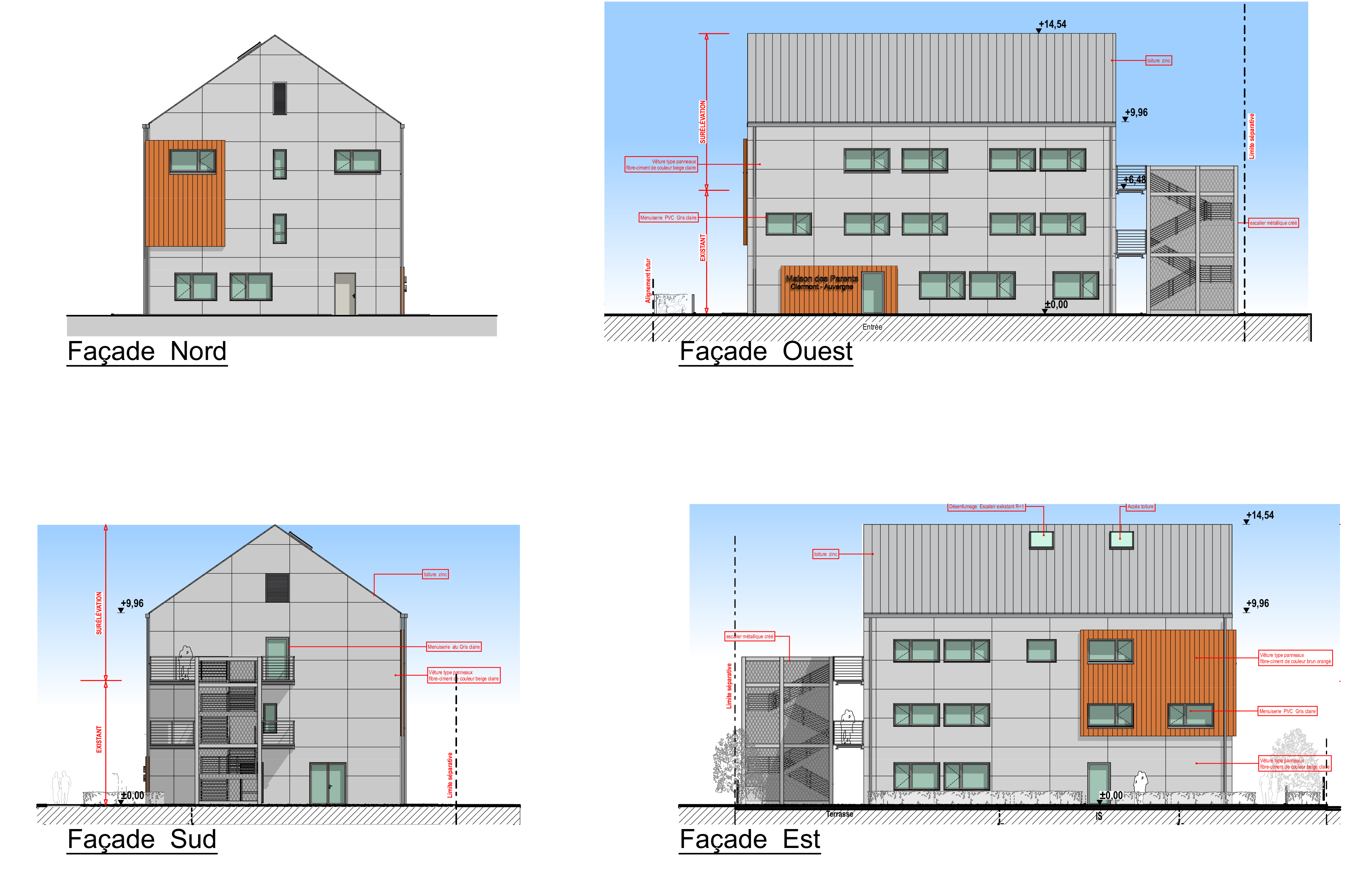 La Maison des Parents de Clermont-Ferrand accueille les parents d’enfants hospitalisés au Nouvel Hôpital Estaing, situé à proximité. Elle héberge déjà 11 studios tous équipés de salles de bain, de pièces communes. Notre proposition a consisté en une surélévation, au R+2, afin de réaliser 8 studios, comprenant un coin cuisine, une salle à manger et une salle de détente. Dans un souci d’uniformité, il est proposé de réaliser une vêture de façade sur l’ensemble de la construction, existant et créé, en panneaux fibre ciment de couleur beige clair, et de couleur brun orangé.