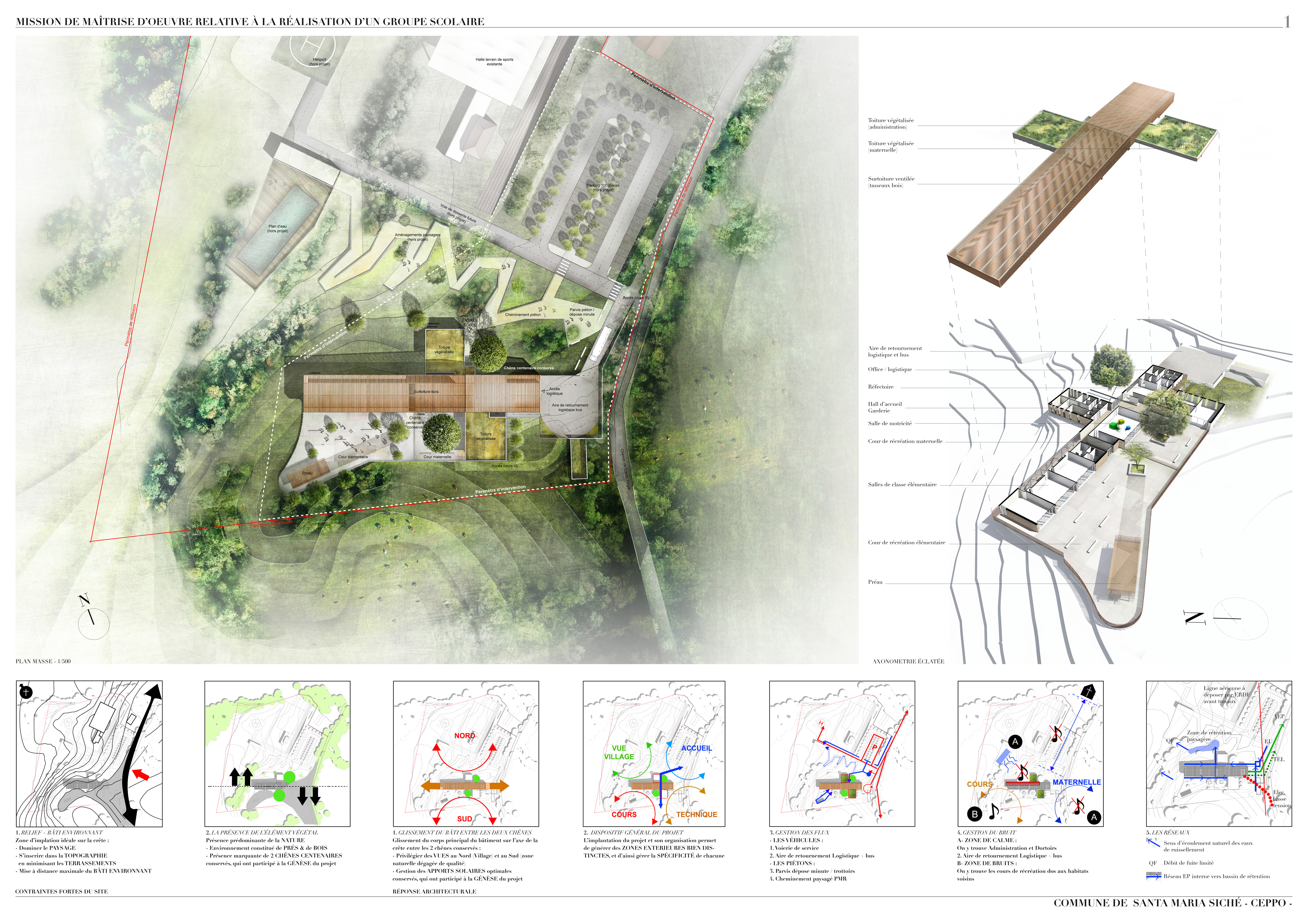 Prenant place sur un vaste terrain vierge, l'école offre une intégration harmonieuse sur cette prairie envahie par les fougères et plantées de chênes centenaires. Véritable oppidum face au grand paysage, le projet prend le parti du végétal. Ainsi, il vient se glisser dans sa forme fuselée entre deux chênes centenaires. Des tasseaux de pins créent une résille naturelle qui se déploie le long des façades. Ponctuellement, cette enveloppe s’interrompt, laissant la place au granit. La toiture vient souligner la ligne d’horizon des montagnes. Ligne brisée au dessus du sol, elle est constituée d’une surtoiture unitaire, qui permet une gestion bioclimatique harmonieuse de l’ouvrage.