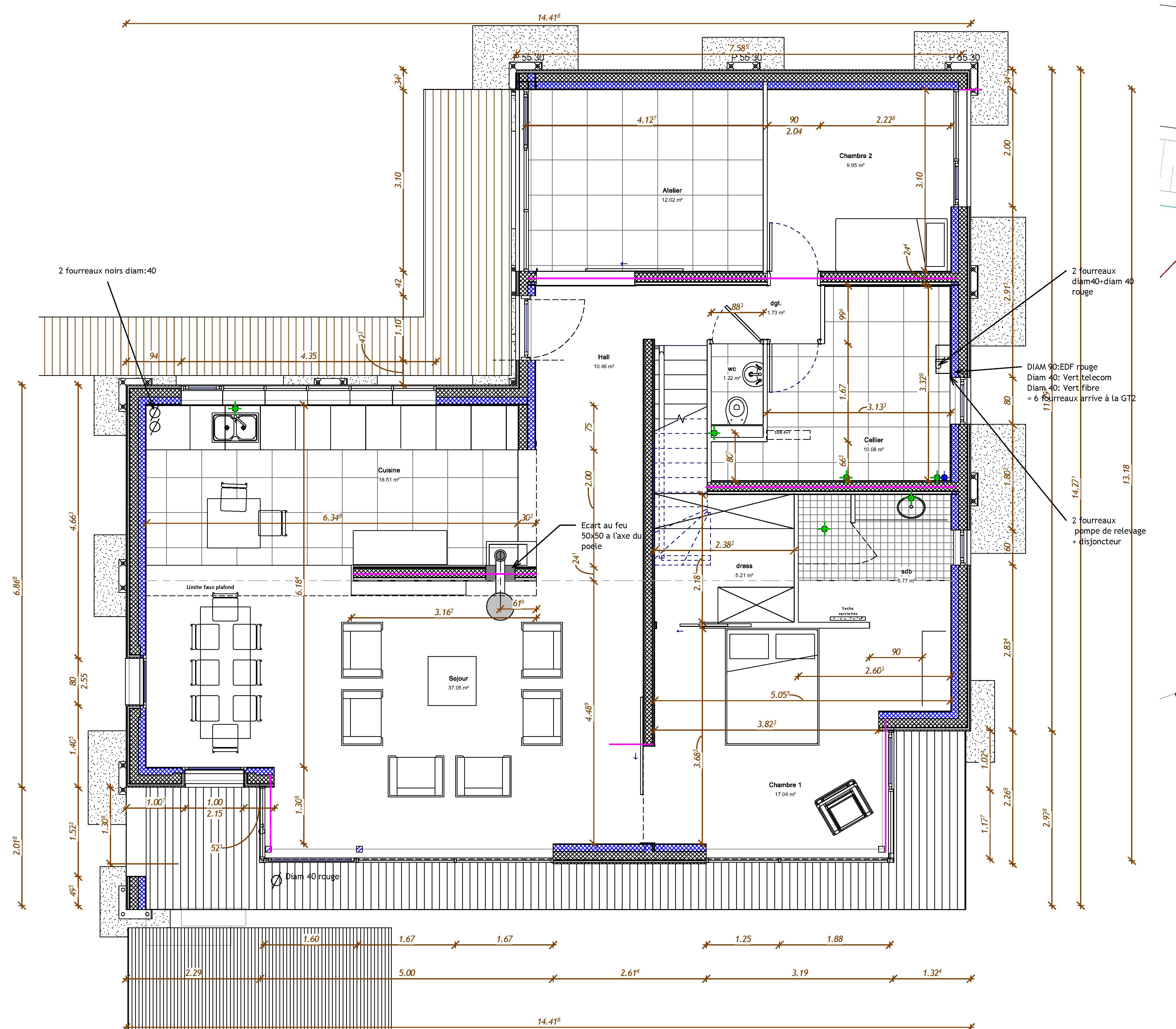 Descriptif technique : Maison en ossature bois, avec isolation renforcée et toit végétalisé sur assainissement en phytosanitaire. Chauffage avec couplage, foyer bois avec VMC DF avec échangeur (MyDatec)