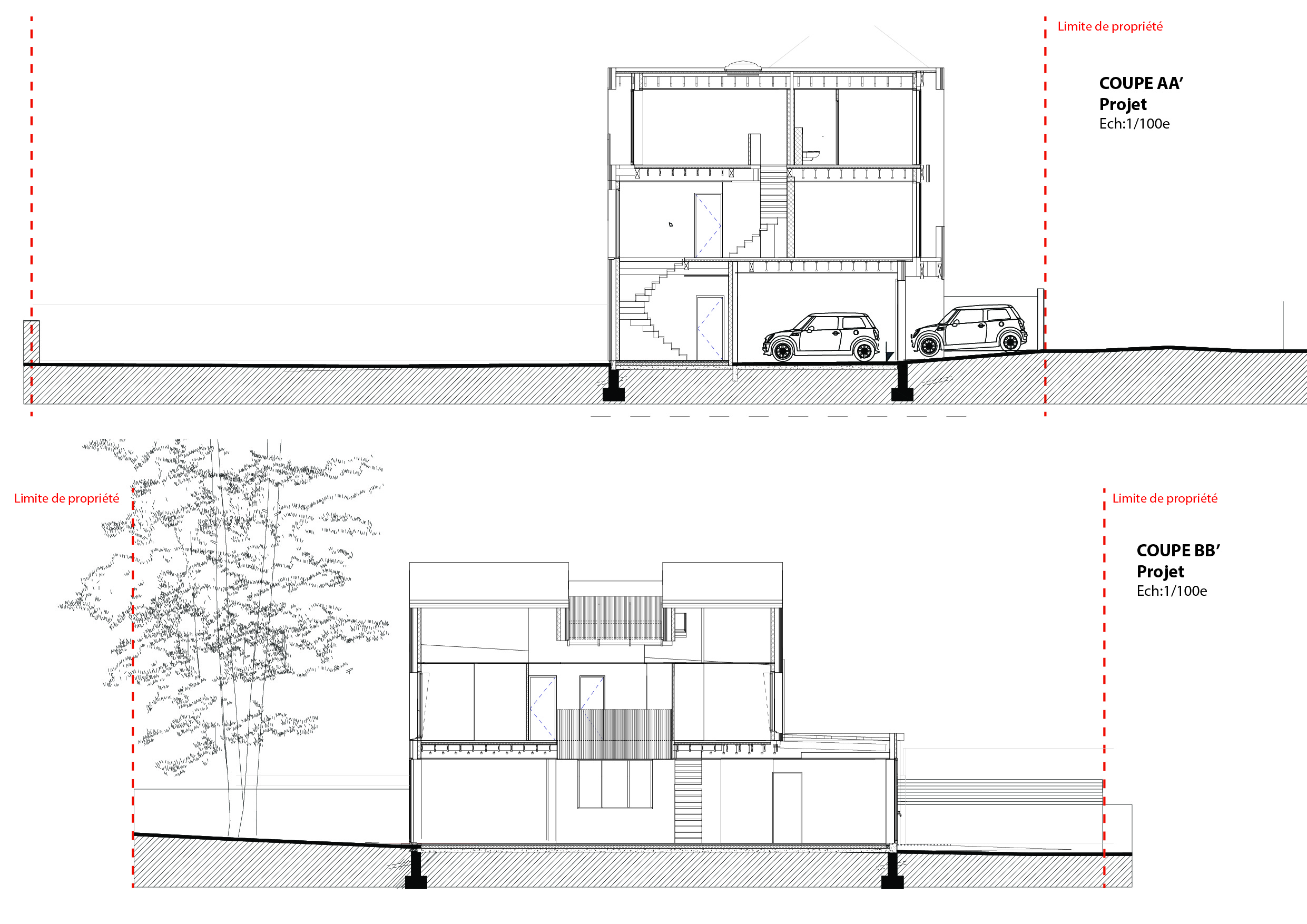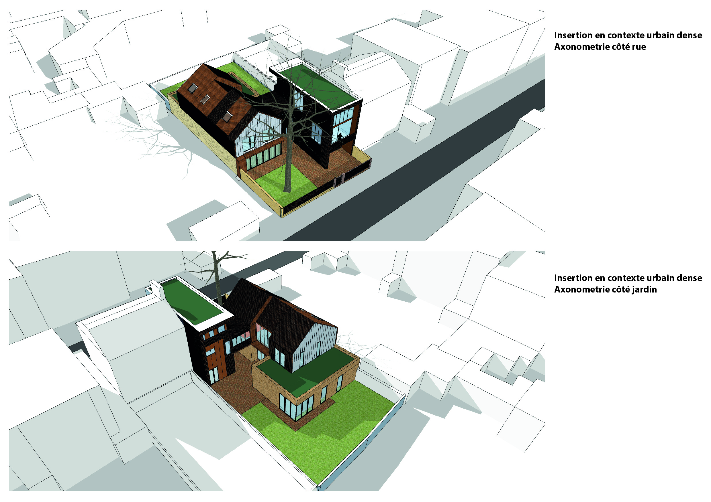 Approche environnementale : La parcelle de 450 m² se caractérise par son Pin élancé à plus de 20m. L'architecture qui se développe autour se doit d'être sobre et d'accompagner cet élément naturel. Par conviction mais aussi par évidence, le recours aux matériaux biosourcés et renouvelables s'est imposé dans nos choix (mur, plancher, bardage). L'ensemble des isolants sont naturels en fibre de bois, laine de bois et ouate de cellulose. Pour limiter son impact au sol une toiture végétale intensive de 50 m² a été restituée abritant une biodiversité et des essences locales. Le bâtiment est chauffé par énergie renouvelable.