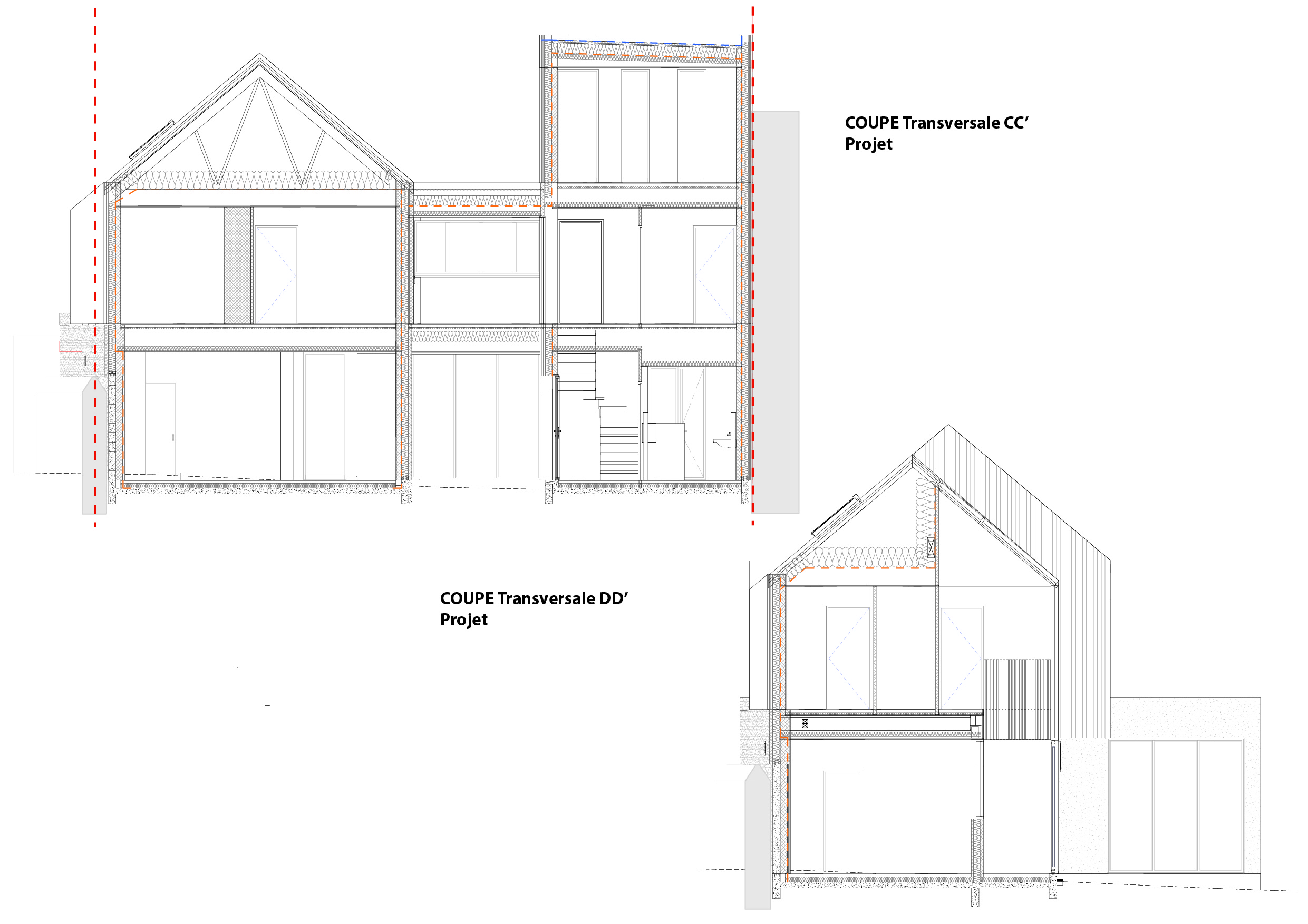 Descriptif technique : L'ambition environnementale d'une architecture bas carbone a convergé avec les exigences liées à la mise en œuvre sur chantier. La parcelle conjugue toutes les difficultés d'une impasse privée en milieu urbain dense. Le choix du mode constructif avec des murs à ossature bois (MOB) était la réponse adéquate pour un chantier propre (filière sèche), à faible nuisance, rapide et sans stockage sur la parcelle. La structure est en ossature bois et le portique en pin. Les planchers et la charpente sont en pin. L'enveloppe du bâtiment (mur et toiture) est constitué de bardage claire-voie en épicéa.